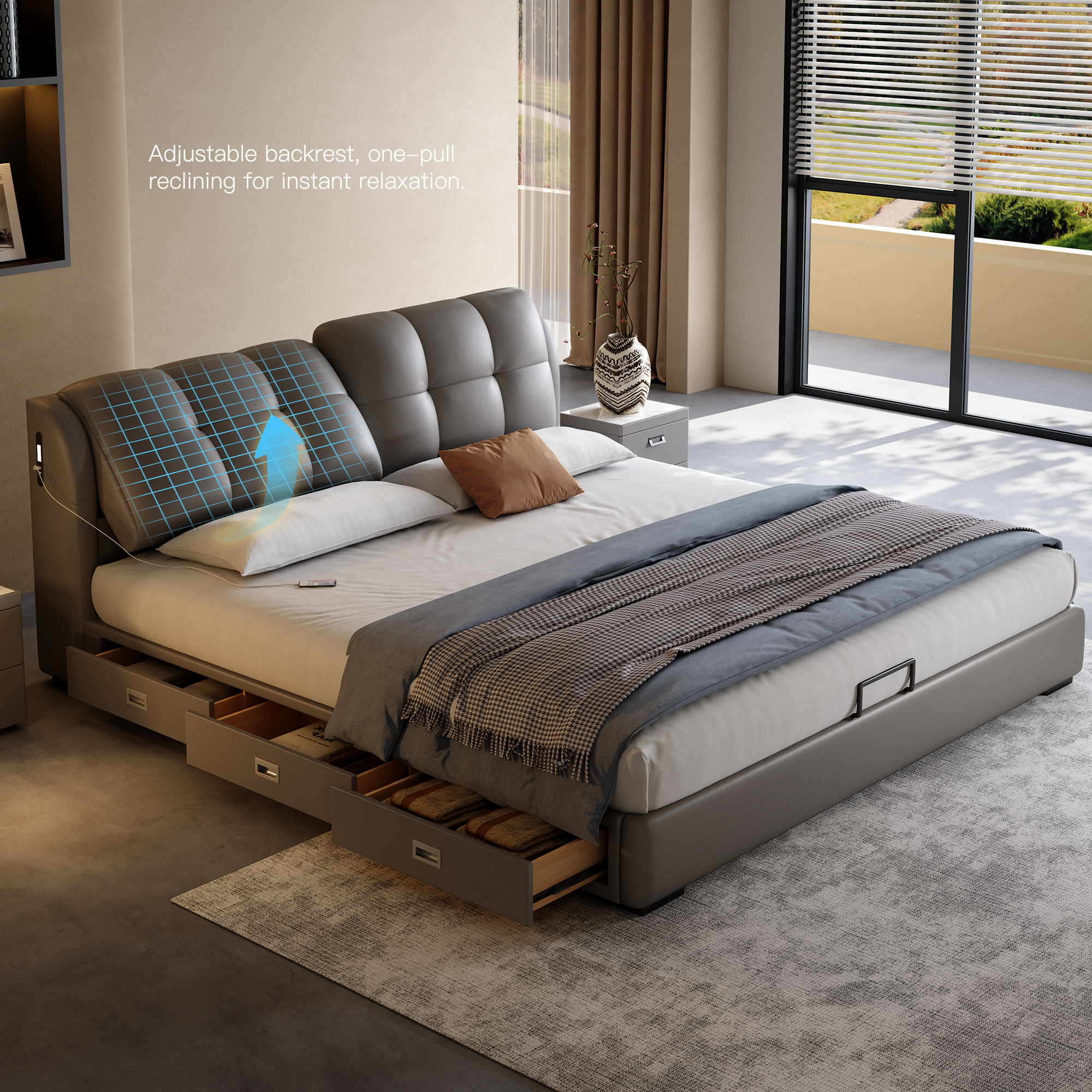 Crafted from a single piece of top-grain leather, the backrest cushions are filled with a composite structure of latex and antibacterial bamboo charcoal sponge. This design delivers cloud-like resilience while offering antibacterial and anti-mite properties, providing comfortable support that closely conforms to the spinal curve. The two cushions are zoned for individualized support and can be independently adjusted in tilt angle. Equipped with a pull handle at the base, each cushion can be smoothly shifted into a gentle reclining position without interfering with the other, meeting personalized needs for dual users.