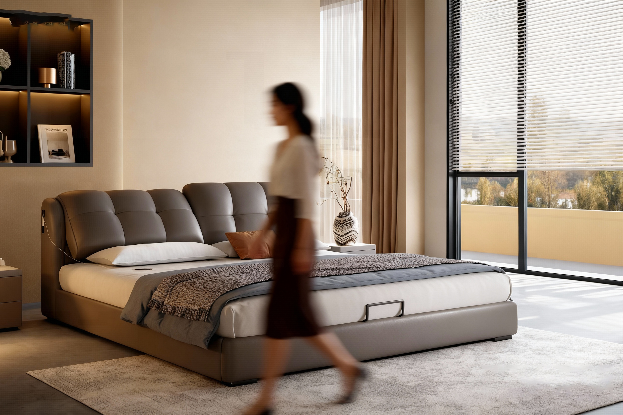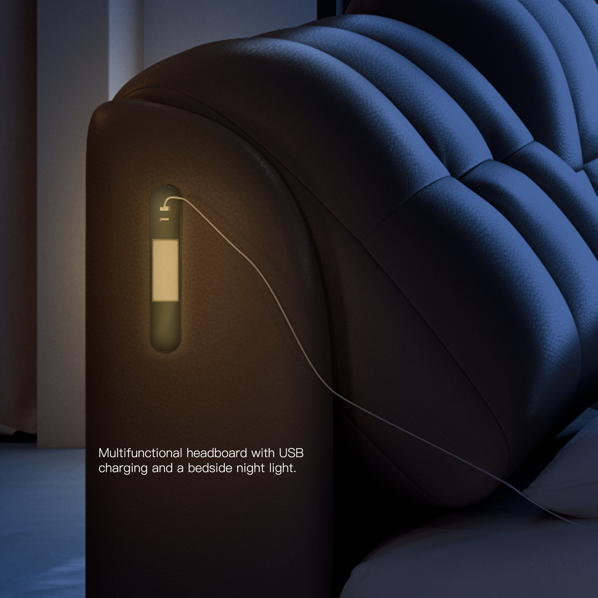 Both sides of the headboard incorporate built-in touch-sensitive night lights and USB charging modules. The touch-sensing controls are intuitive and highly responsive, eliminating the inconvenience and accidental activation risks associated with traditional switches. A gentle touch is all it takes to activate soft, non-glare lighting during nighttime movement, preserving visual comfort and minimizing disruption to sleep cycles. The integrated USB charging module eliminates the need for extra sockets or extension cords, saving space and enhancing safety. It caters to the frequent need for charging devices like smartphones and tablets before sleep, seamlessly merging illumination and smart power functions to significantly improve convenience, safety, and user-centered experience in the bedroom.