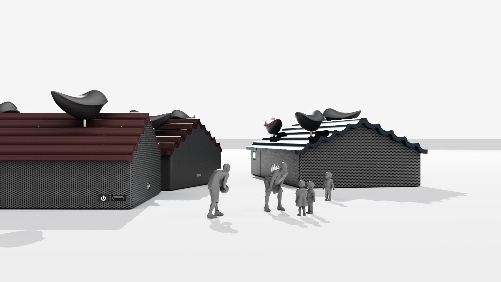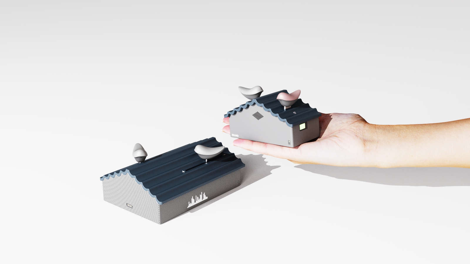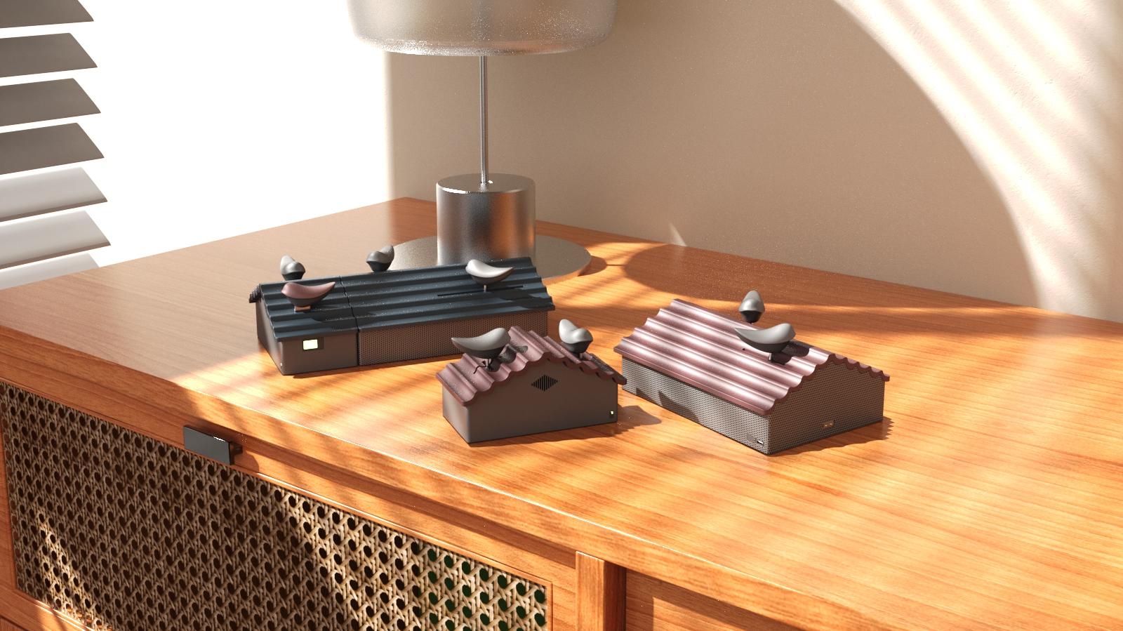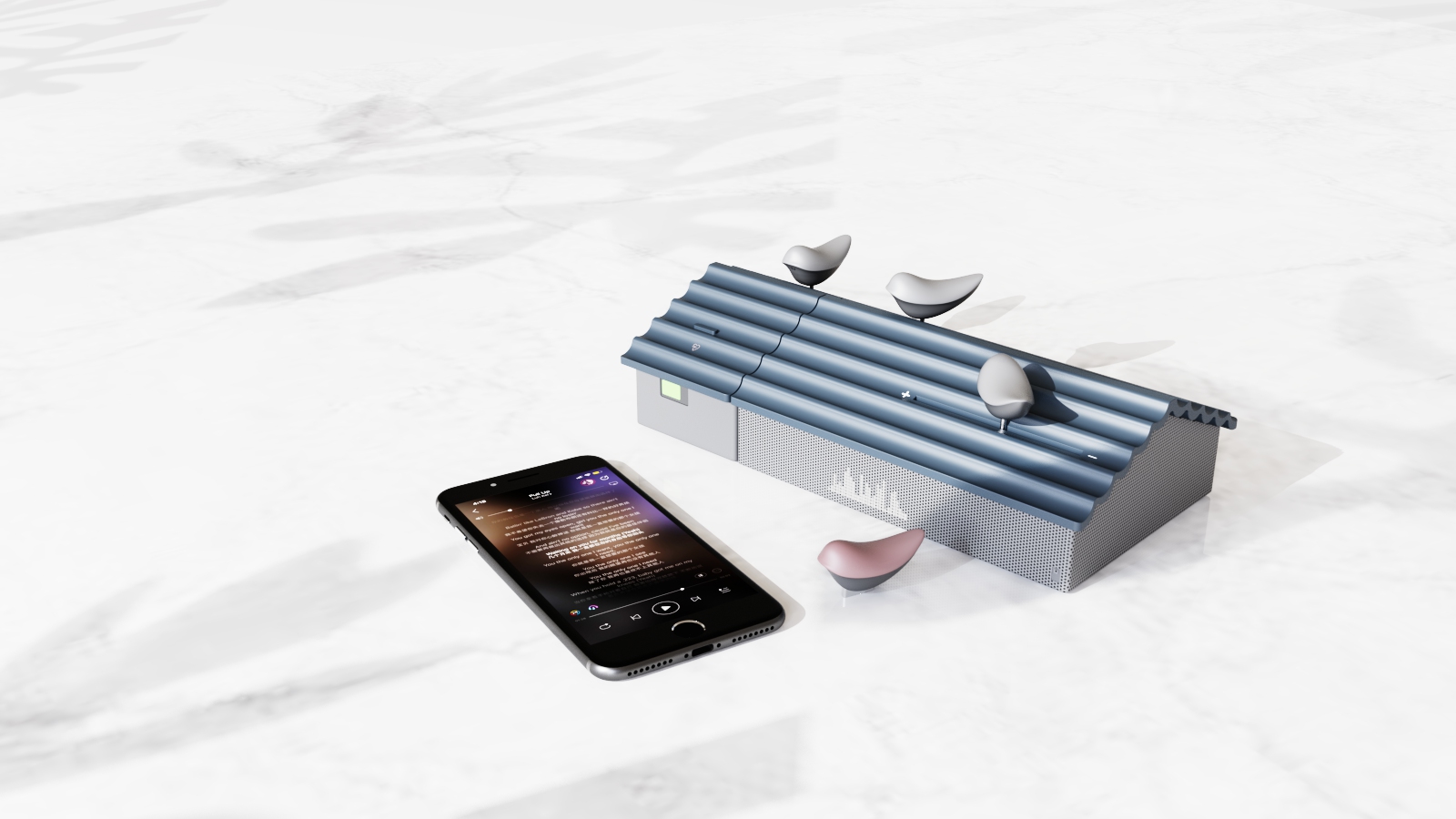 The sound design is inspired by the birds on the eaves and roof, and different birds have different functions, which is convenient for users to complete the needs of cutting songs and adjusting the volume, and is a new way of interaction. At the same time, the color change on the back of the bird allows the user to know whether the music is collected in the first time. The overall shape adopts modular application, which is convenient for users to carry out. Eaves can be used as pen holders to store office stationery.