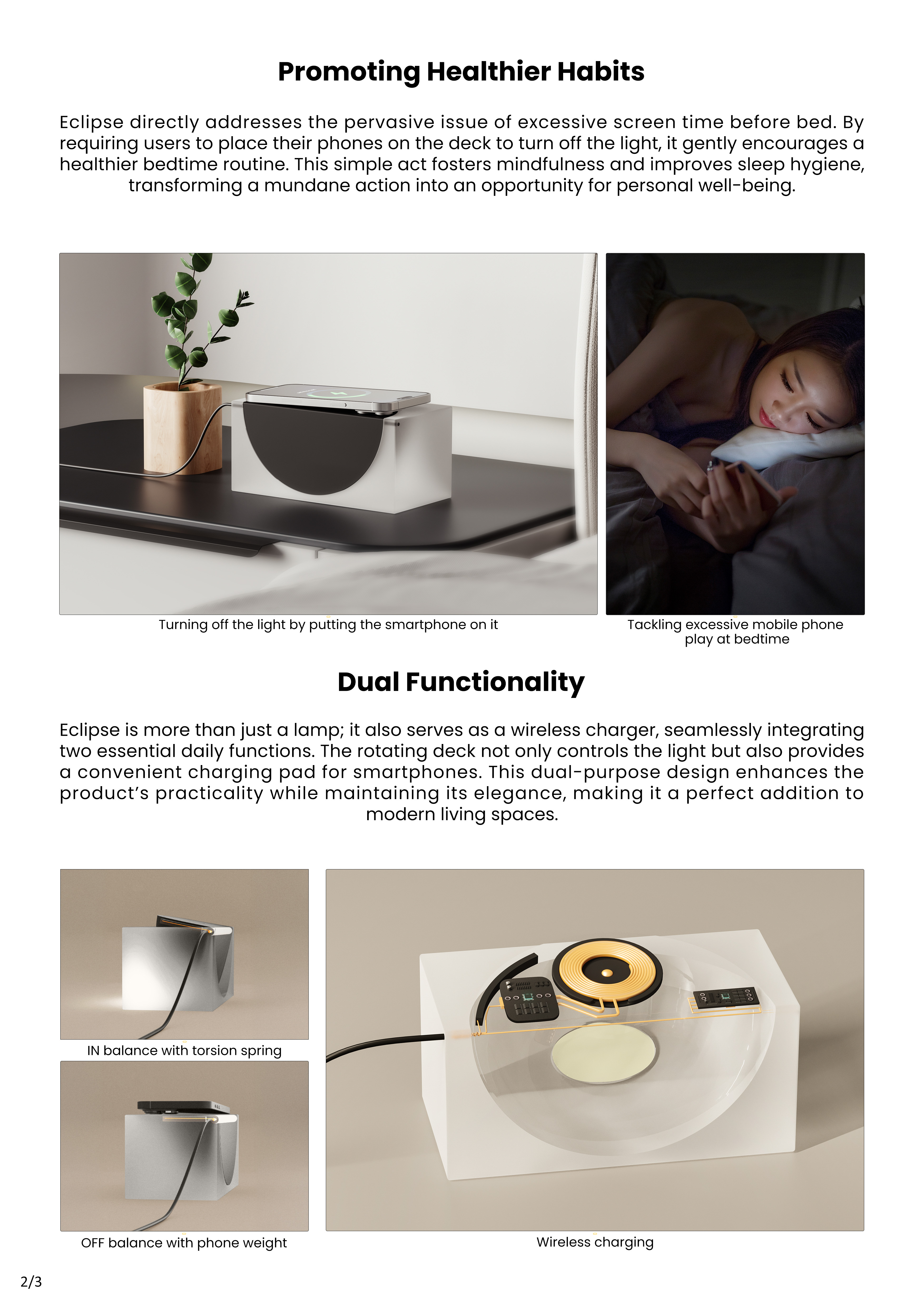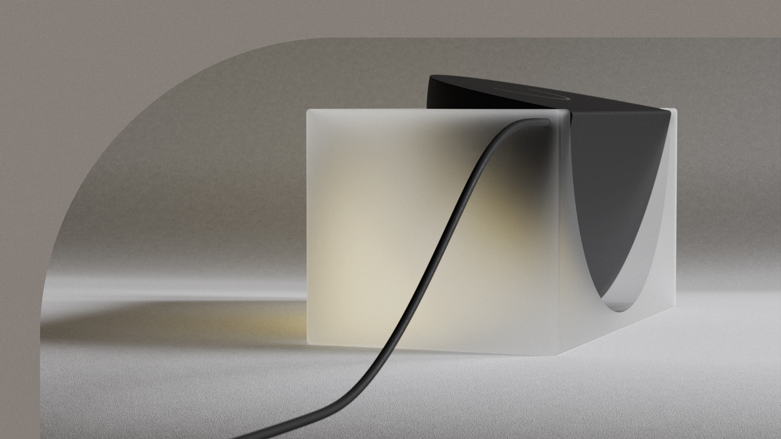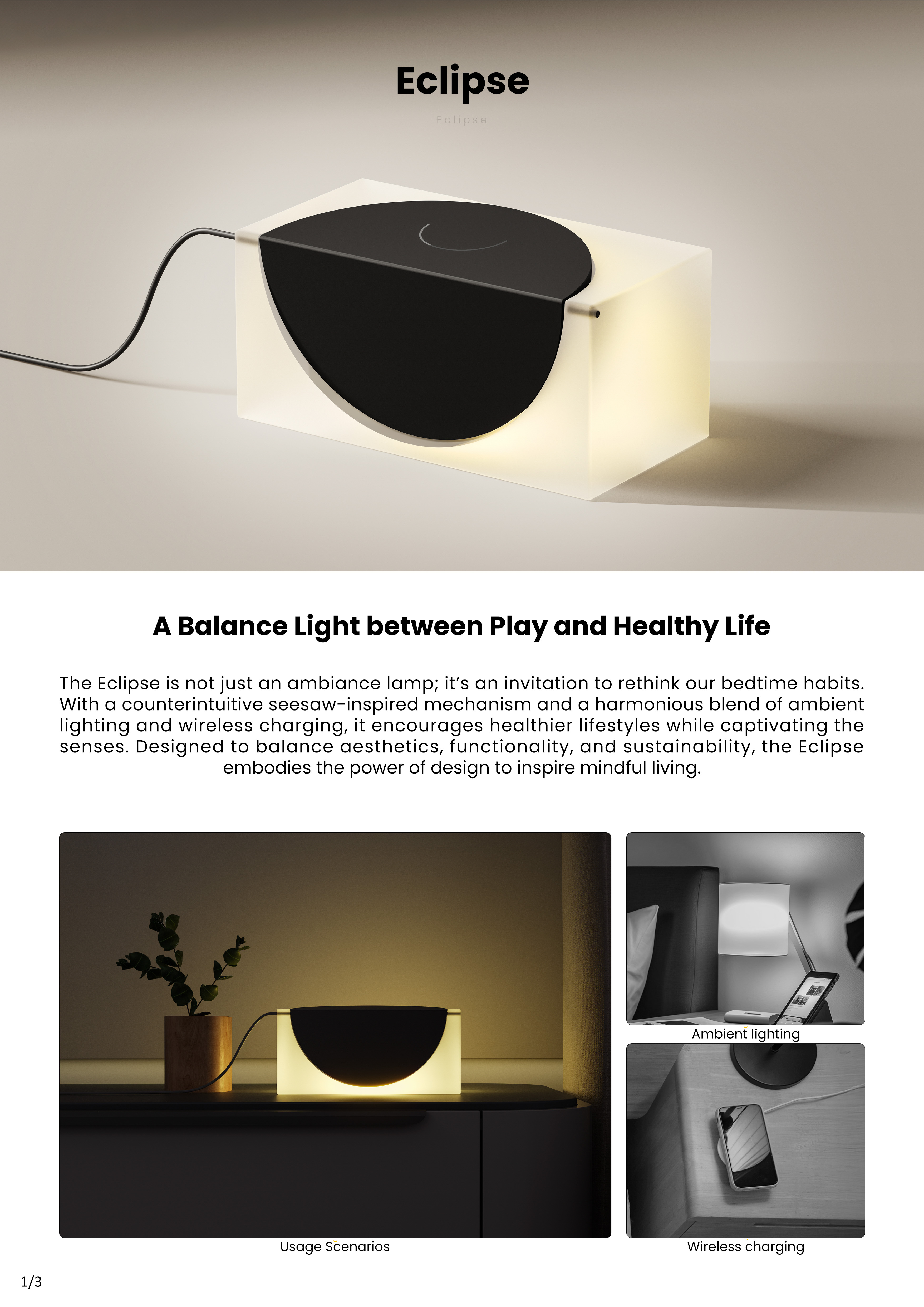 The Eclipse is an ambient lamp designed to support a healthier lifestyle through a sleek, minimalist aesthetic and innovative functionality. Inspired by a seesaw, this lamp features a frosted acrylic cube that diffuses a warm, calming glow and a semicircular center deck that rotates on an axis. The lamp utilizes a light sensor to activate automatically in low-light conditions, creating a floating eclipse effect. The deck also functions as a wireless charging pad: when a phone is placed on it, the lamp gracefully dims, encouraging reduced screen time before bed. Once the phone is removed, the soft glow returns, promoting a more relaxing and restful environment.