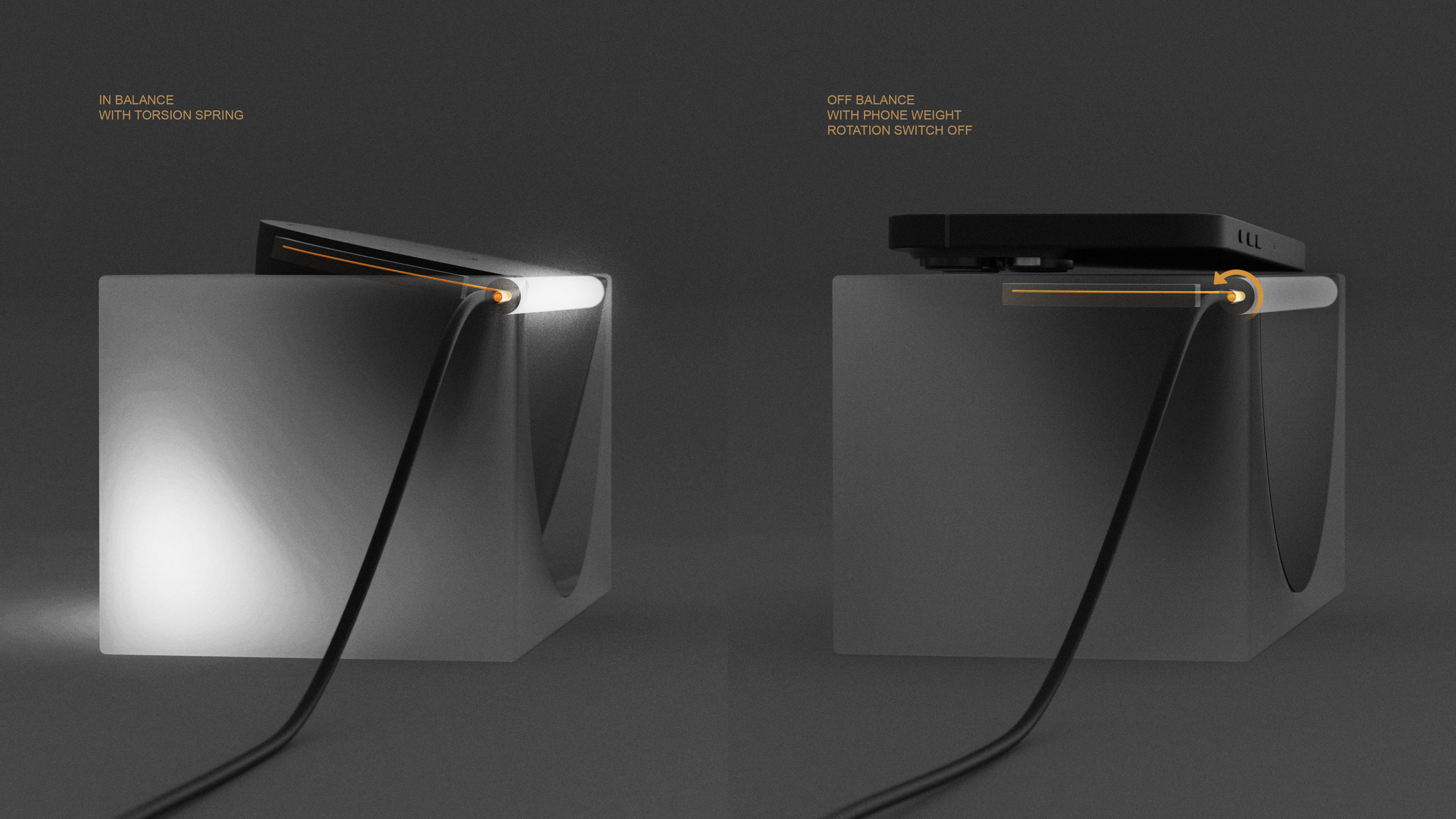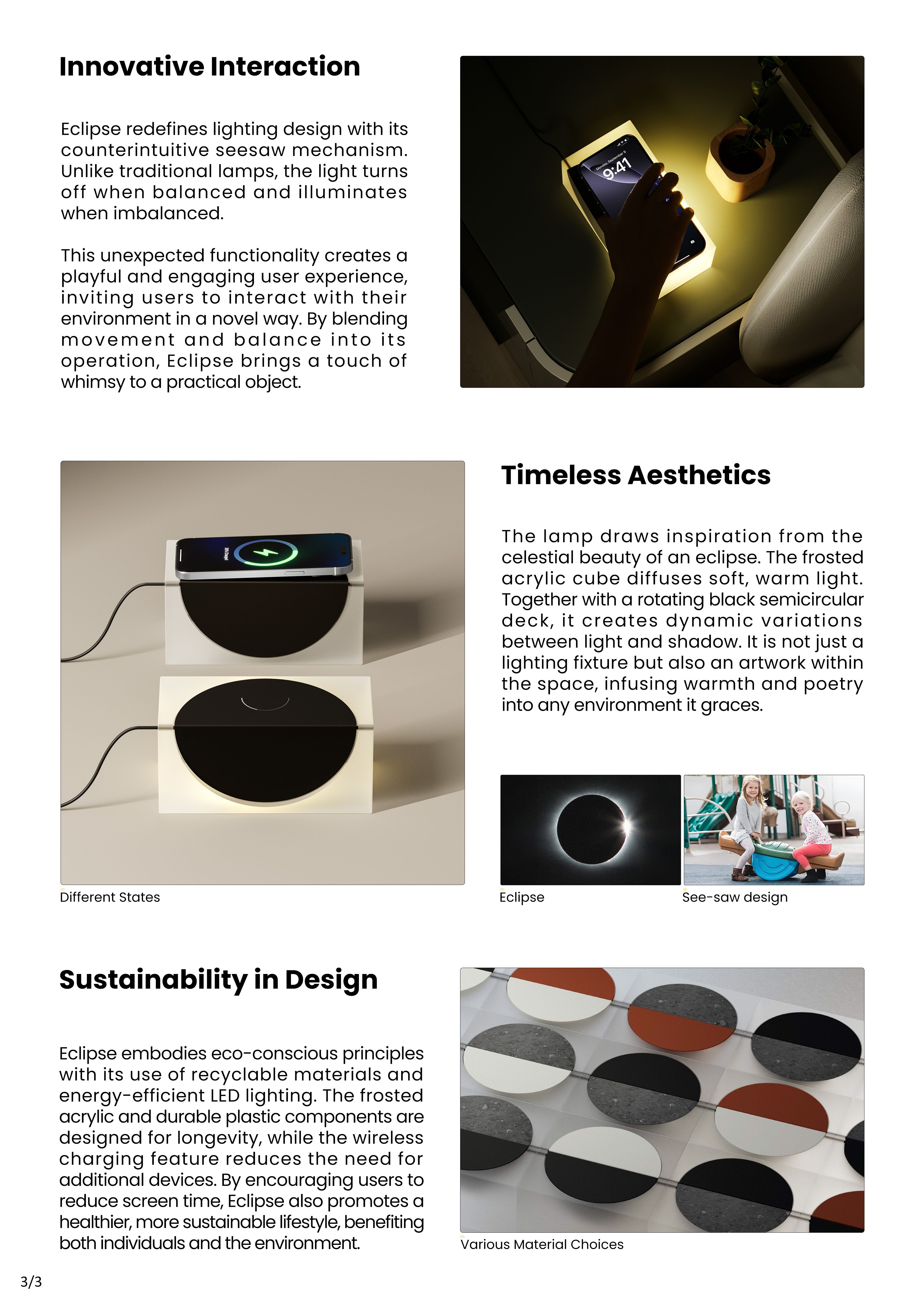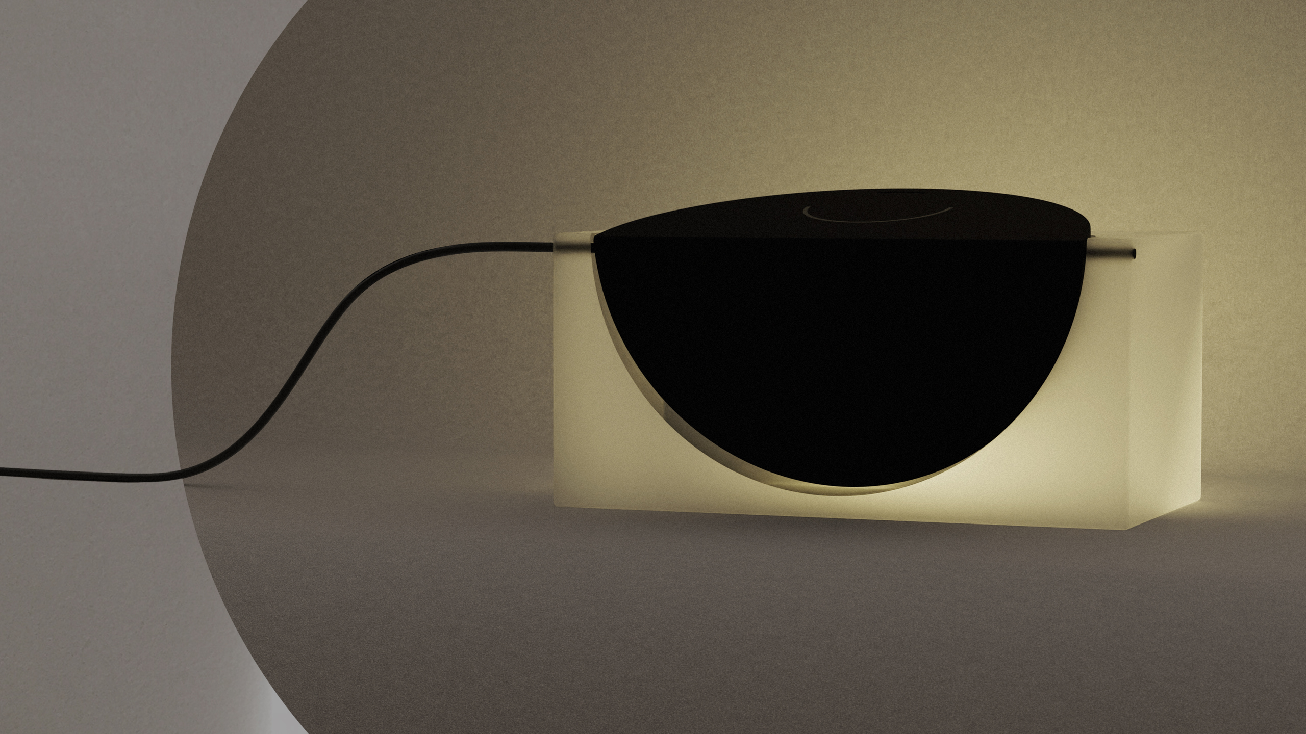 The Eclipse is an ambient lamp designed to support a healthier lifestyle through a sleek, minimalist aesthetic and innovative functionality. Inspired by a seesaw, this lamp features a frosted acrylic cube that diffuses a warm, calming glow and a semicircular center deck that rotates on an axis. The lamp utilizes a light sensor to activate automatically in low-light conditions, creating a floating eclipse effect. The deck also functions as a wireless charging pad: when a phone is placed on it, the lamp gracefully dims, encouraging reduced screen time before bed. Once the phone is removed, the soft glow returns, promoting a more relaxing and restful environment.