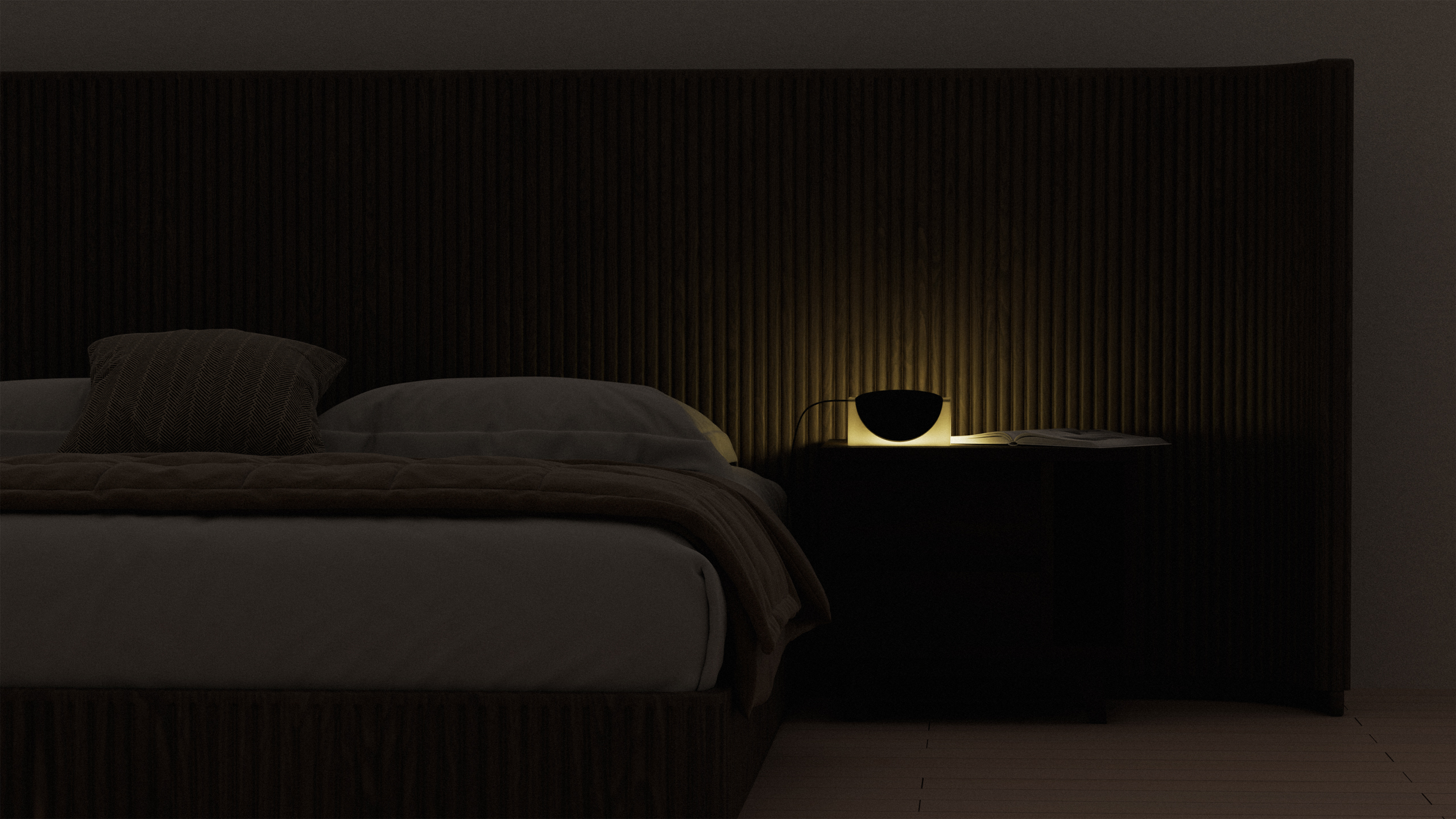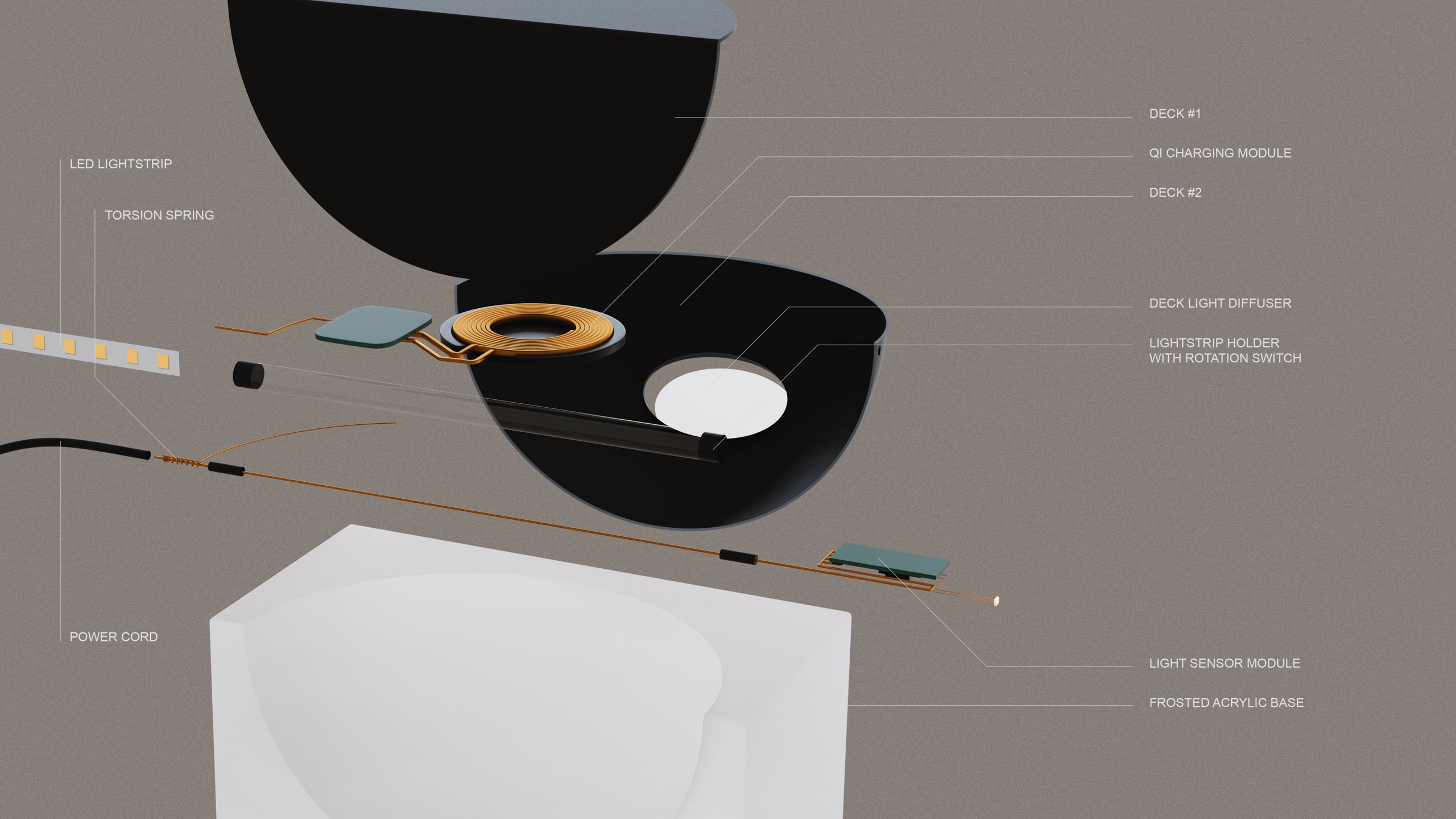 The lamp’s form emphasizes balance in an unconventional way. The use of durable, mass-producible materials like frosted acrylic and plastic keeps the design efficient and sustainable, while the integrated axis houses the lighting components, torsion spring, and light sensor. This ensures a compact and cohesive structure that transitions seamlessly into the cable. The tactile and engaging design draws users in, enhancing the room’s aesthetics while subtly encouraging healthier habits. Eclipse is more than just a light source; it’s a thoughtfully designed piece that seamlessly integrates well-being into daily life.