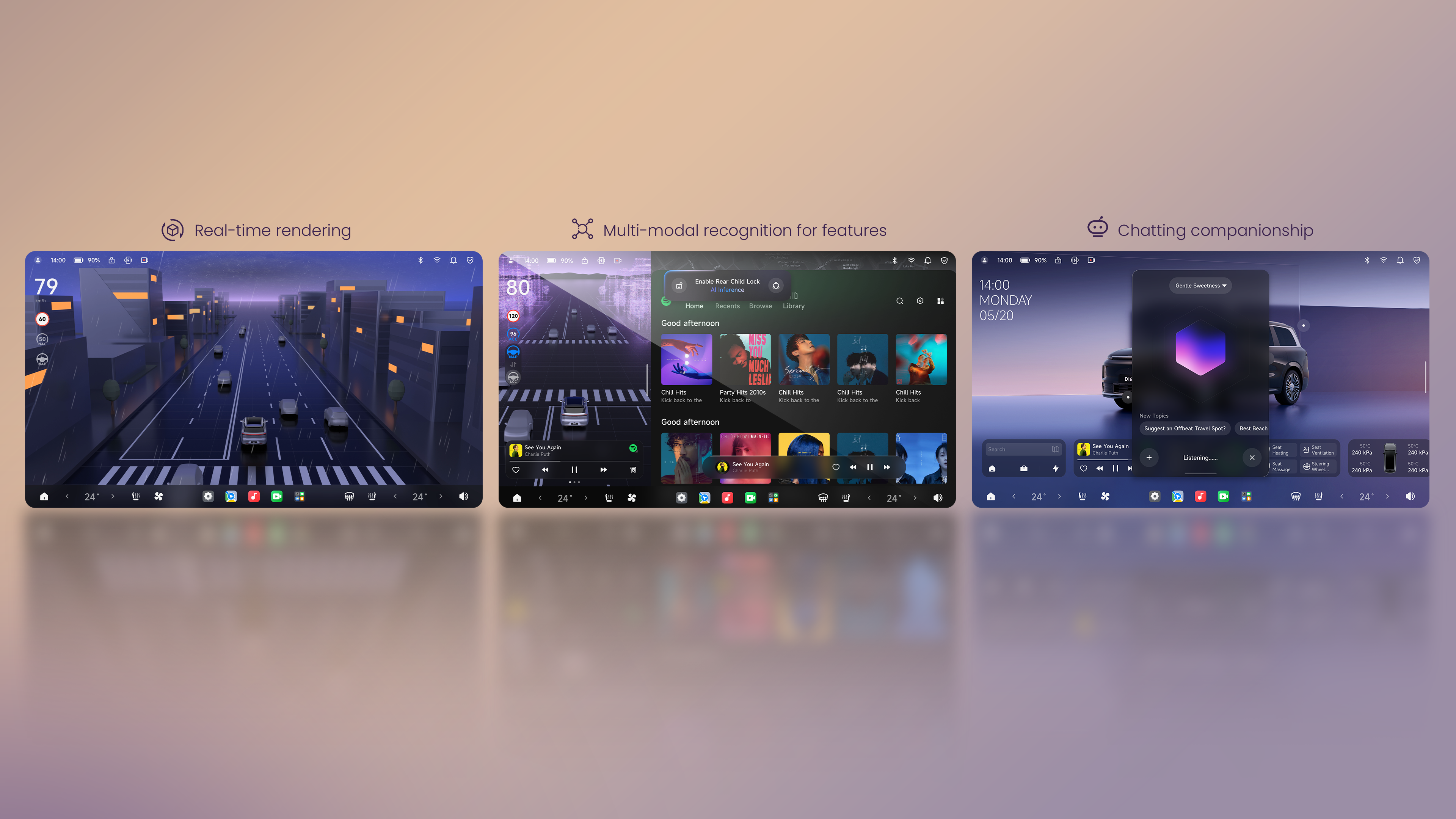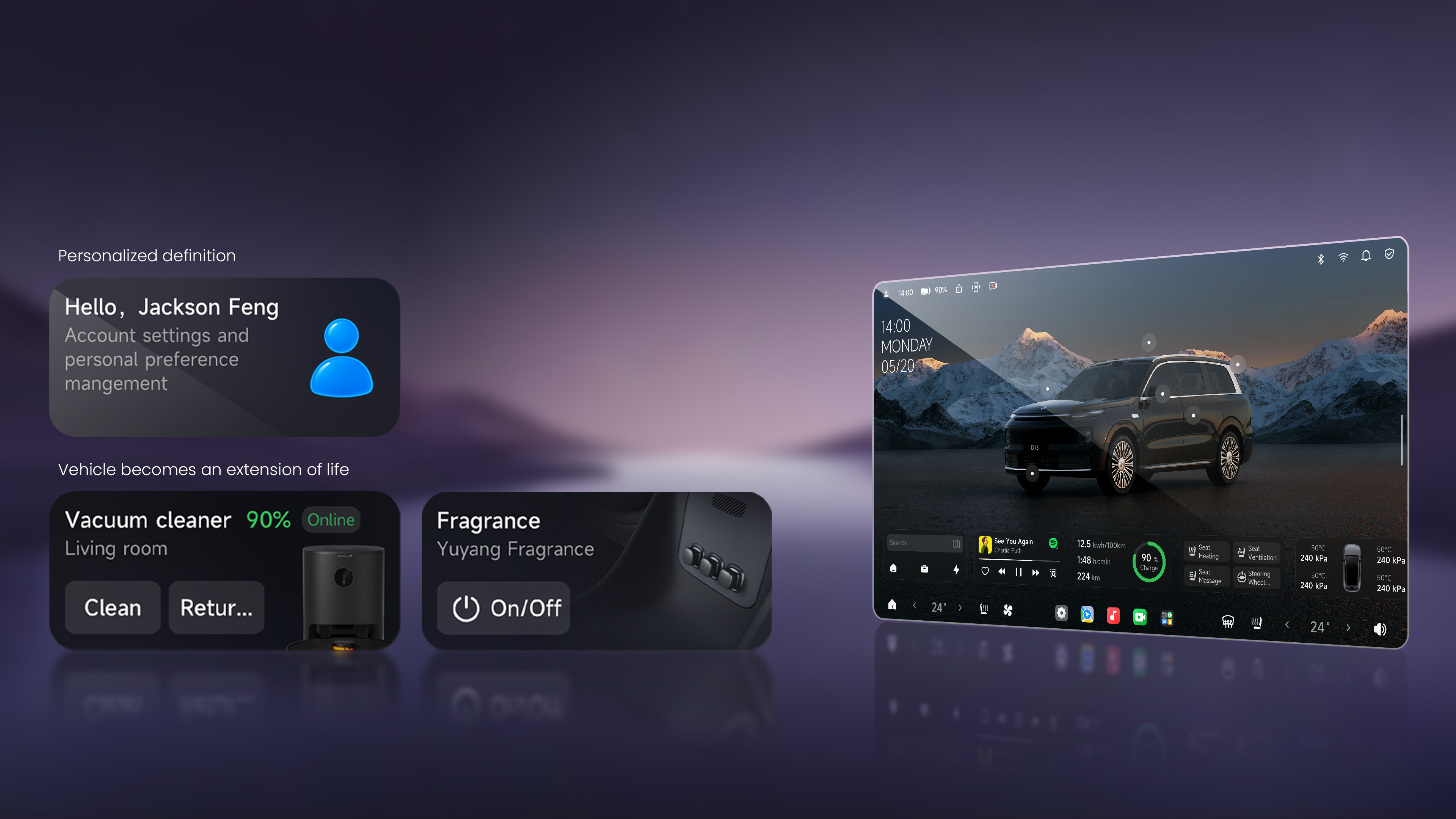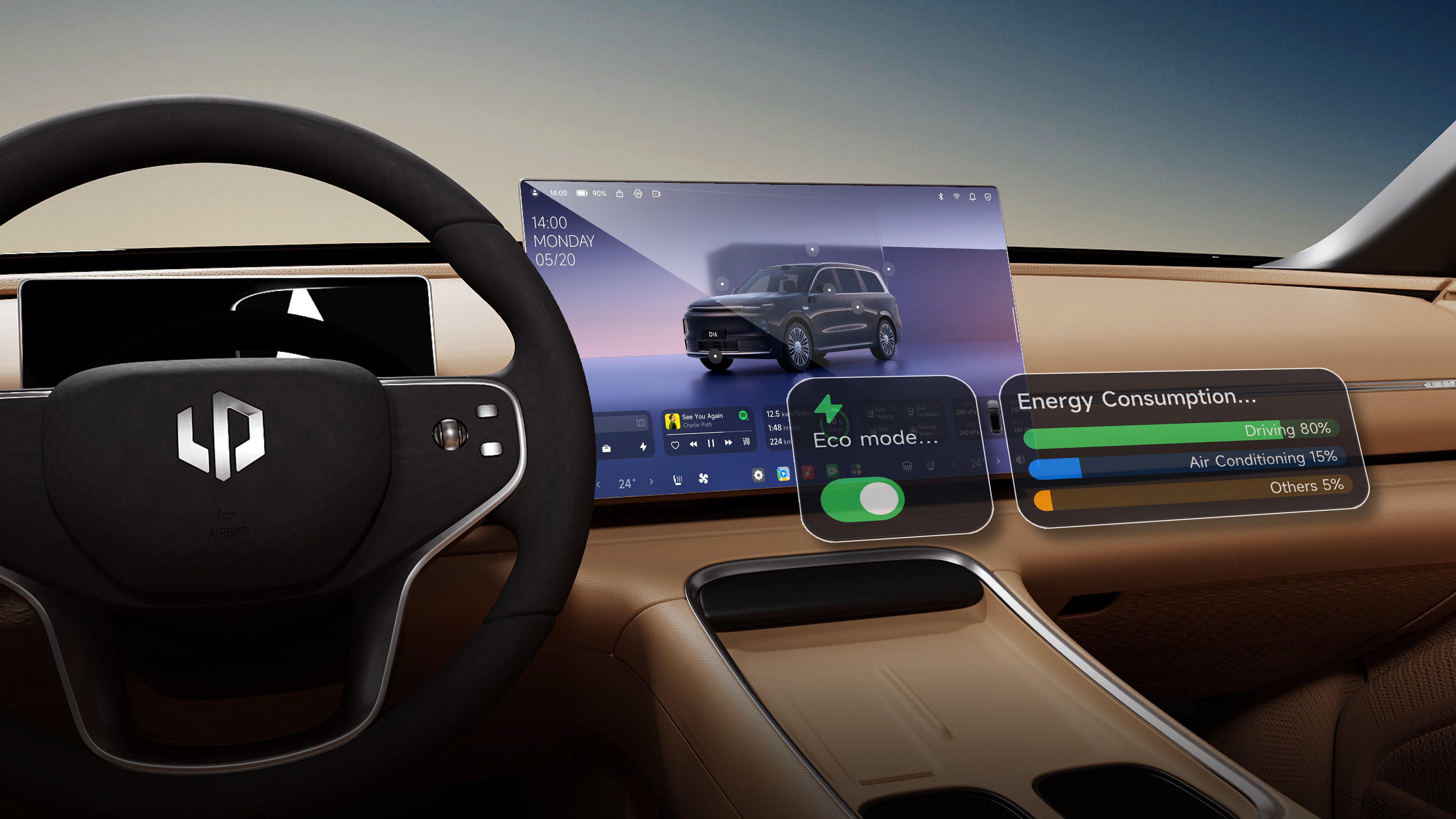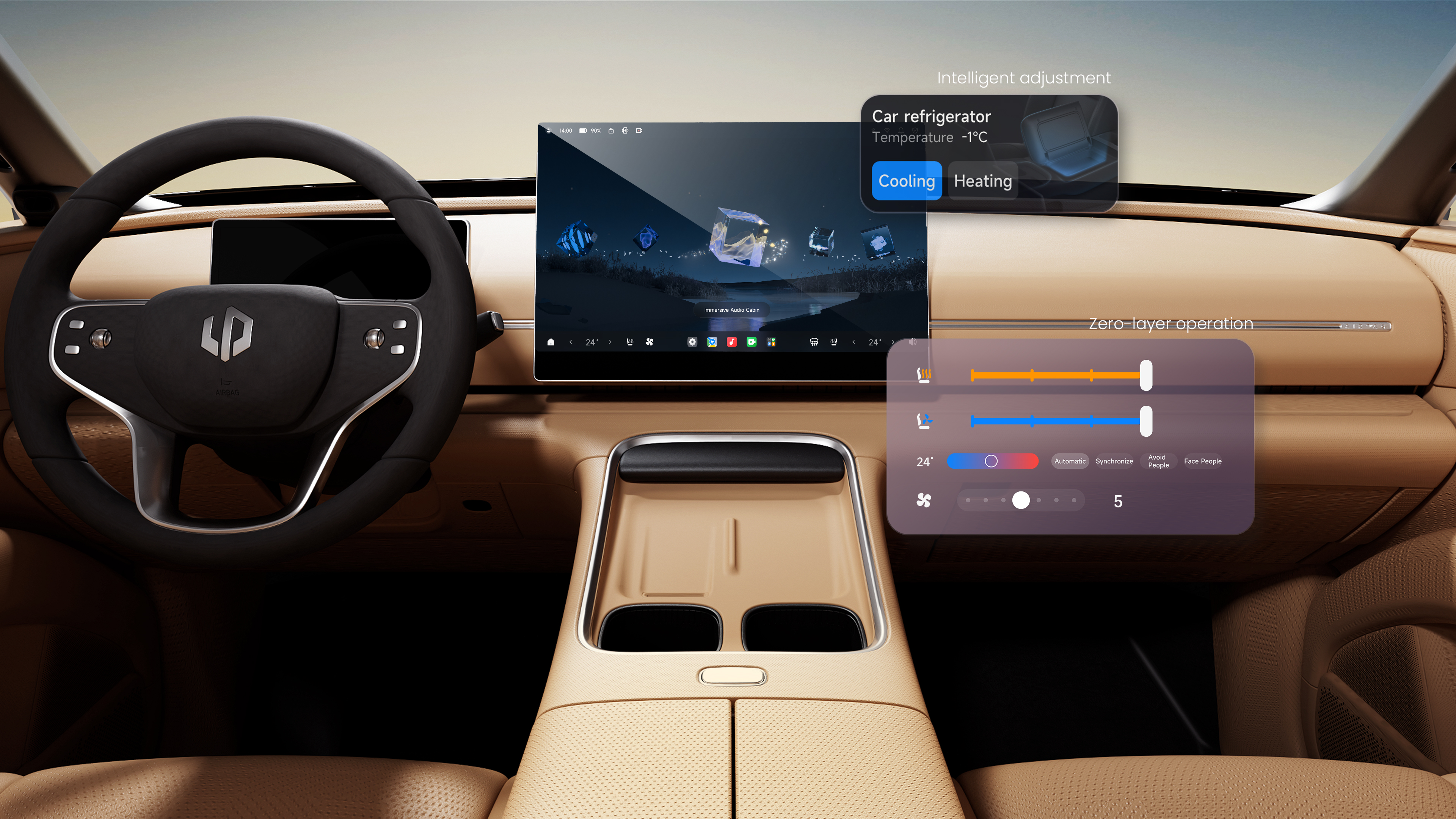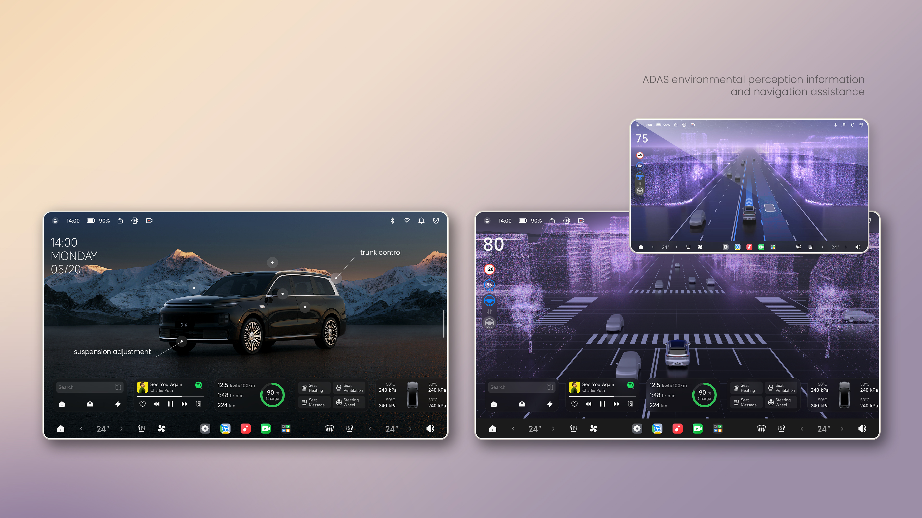 This system, utilizing an 'environment fusion' mode, transcends the limitations of traditional two-dimensional UIs by integrating driving and control. It collects external data via radar point clouds and renders vehicle scenarios in 3D, allowing users to truly perceive their environmental space. While driving, it automatically switches to intelligent driving mode, displaying ADAS environmental perception information and navigation assistance. In the vehicle's 3D space, it offers a unique blend of aesthetics and practicality. Users can intuitively perform operations such as 'one-touch vehicle lock, trunk access, suspension adjustment, and dynamic demonstrations of front and rear headlights.' A seamless, continuous 3D scene camera movement smoothly conveys control and functional information. This differentiated, immersive interactive experience redefines the human-machine relationship within the intelligent cockpit. The interface is centered around themed environments such as geometric spaces, snow-capped mountain landscapes, architectural forms, and musical atmospheres to create a multi-dimensional, immersive ambiance. Users can switch themes based on their preference or the driving scenario. The interface hierarchy emphasizes "zero-layer operation," allowing for quick adjustments to air conditioning, seats, and vehicle-to-home connectivity through long-presses and swipes on the bottom bar or via card-style shortcuts. Under the musical rhythm theme, the rendering engine drives spectrum pulsations that synchronize with ambient lighting, injecting dynamic artistic beauty into the vehicle's interior. The overall visual language balances a sense of technology with a humanistic atmosphere, presenting a fluid and immersive digital aesthetic. The system covers an end-to-end functional experience, from driving and parking to energy management. During driving, the ADAS environmental perception renders the surrounding environment in real-time, complementing features like automated parking, route memory, blind-spot monitoring, and highway navigation pilot to enhance driving safety. On the interaction level, users can achieve seamless services through voice commands, a large AI model, and multi-modal recognition for features such as rear-passenger care, a smart rest mode, and intelligent headlight control. The desktop card design and bottom-bar shortcuts enable "zero-layer direct access," significantly reducing operational complexity and the learning curve.