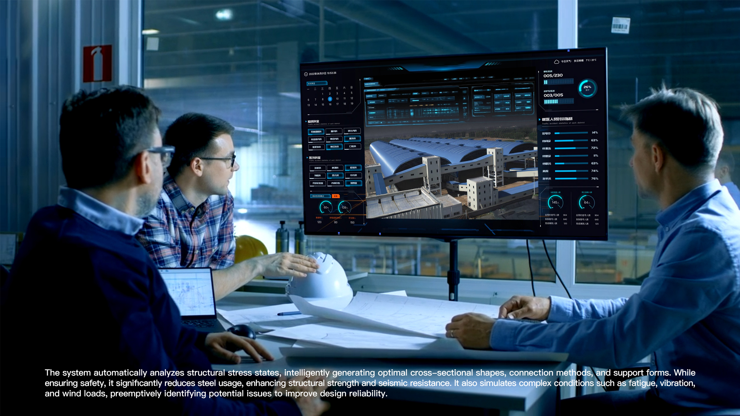 The system automatically analyzes structural stress states, intelligently generating optimal cross-sectional shapes, connection methods, and support forms. While ensuring safety, it significantly reduces steel usage, enhancing structural strength and seismic resistance. It also simulates complex conditions such as fatigue, vibration, and wind loads, preemptively identifying potential issues to improve design reliability.