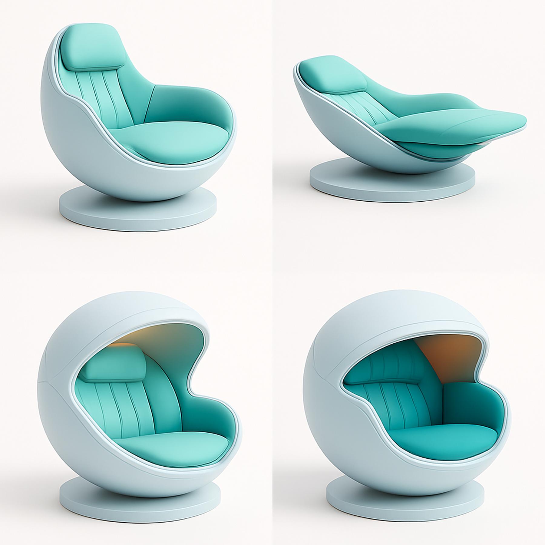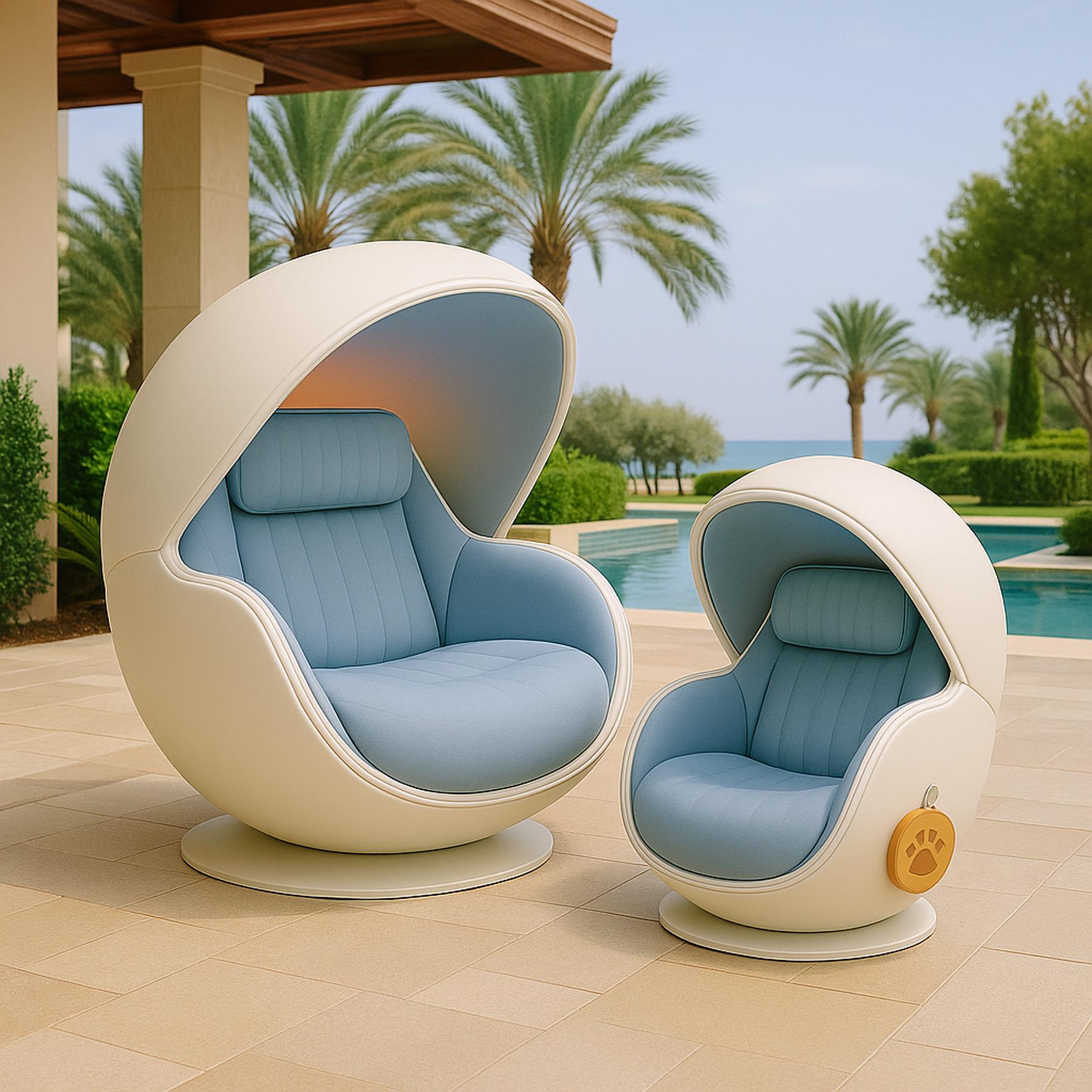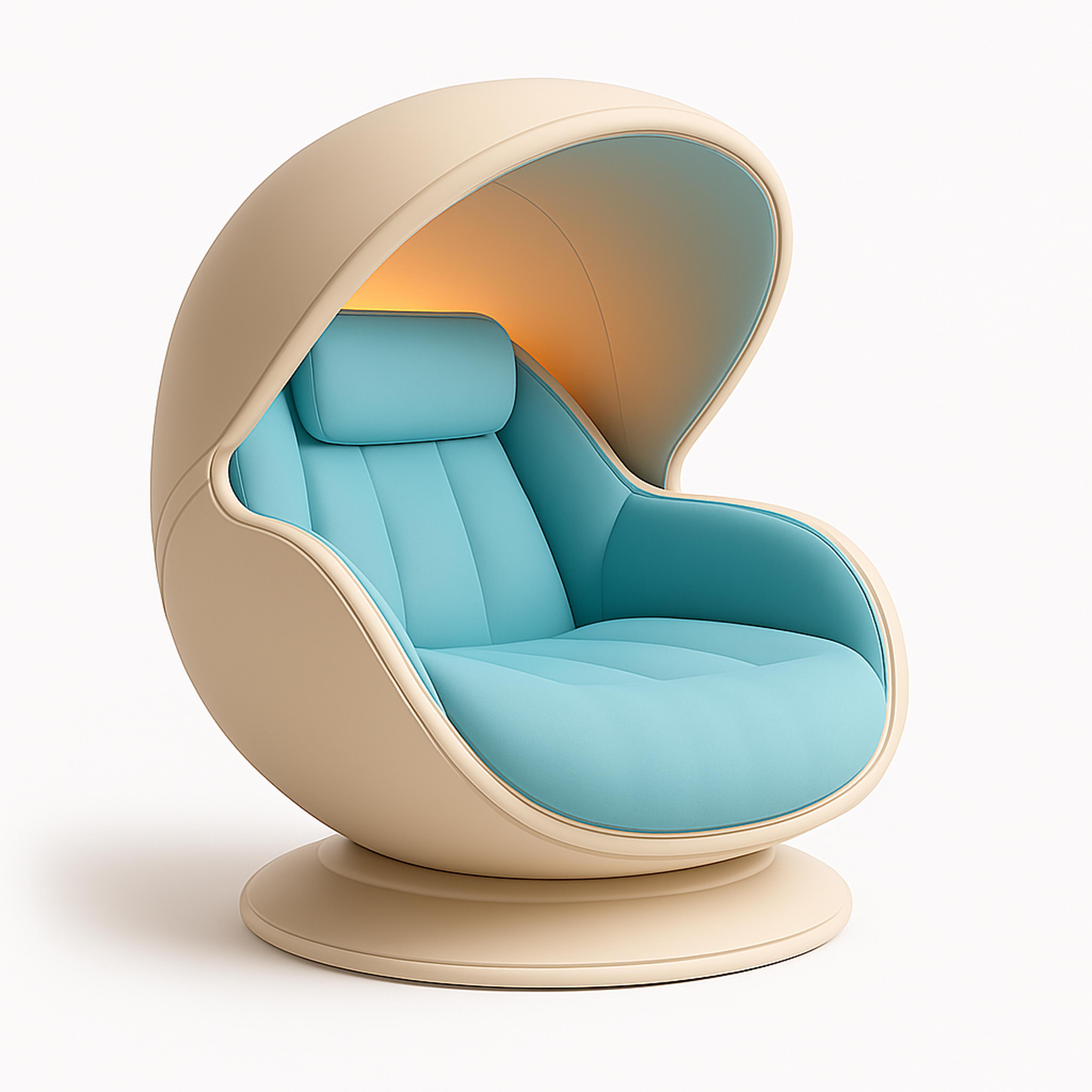 VitaPod is designed for intuitive use. Simply sit and lean back to activate reclining support, or pull the top shell forward to form a semi-private cocoon for reading, napping, or meditation. Ambient lighting and sensory effects adjust automatically to mood and time of day. Ergonomic contours cradle the body in every posture, while cameras allow for gesture-based control—such as dimming lights with a wave or adjusting sound with a nod. A companion mobile app extends customization, allowing users to configure shape modes, wellness presets, or schedule restorative sessions in advance. The result is a natural, cozy, and calming experience—like stepping into a personal retreat enhanced by intelligent, connected design.