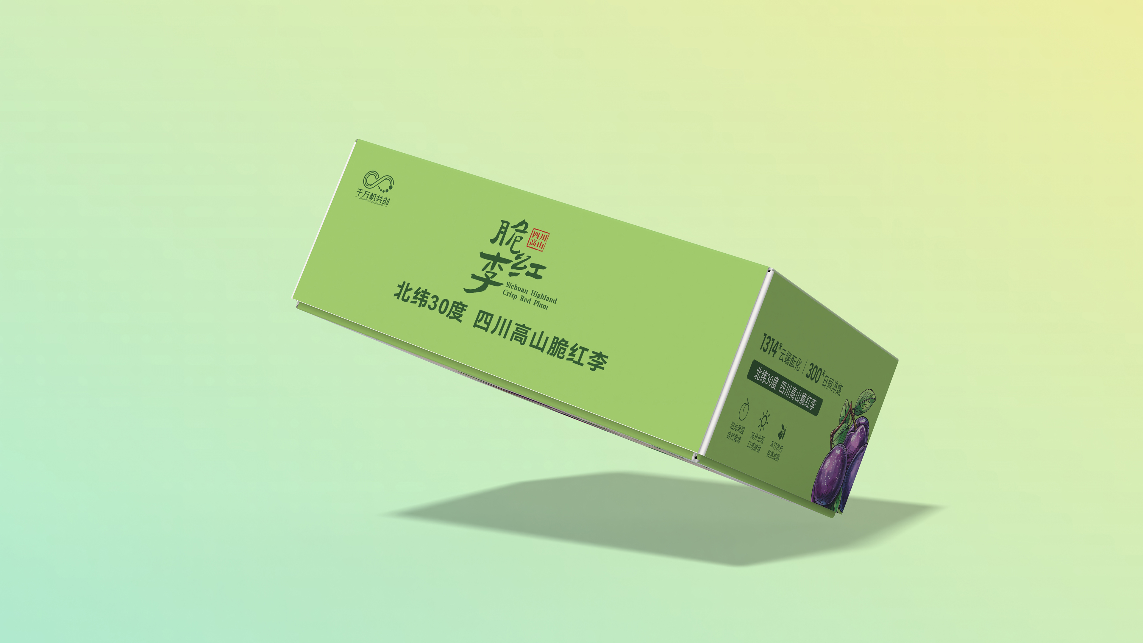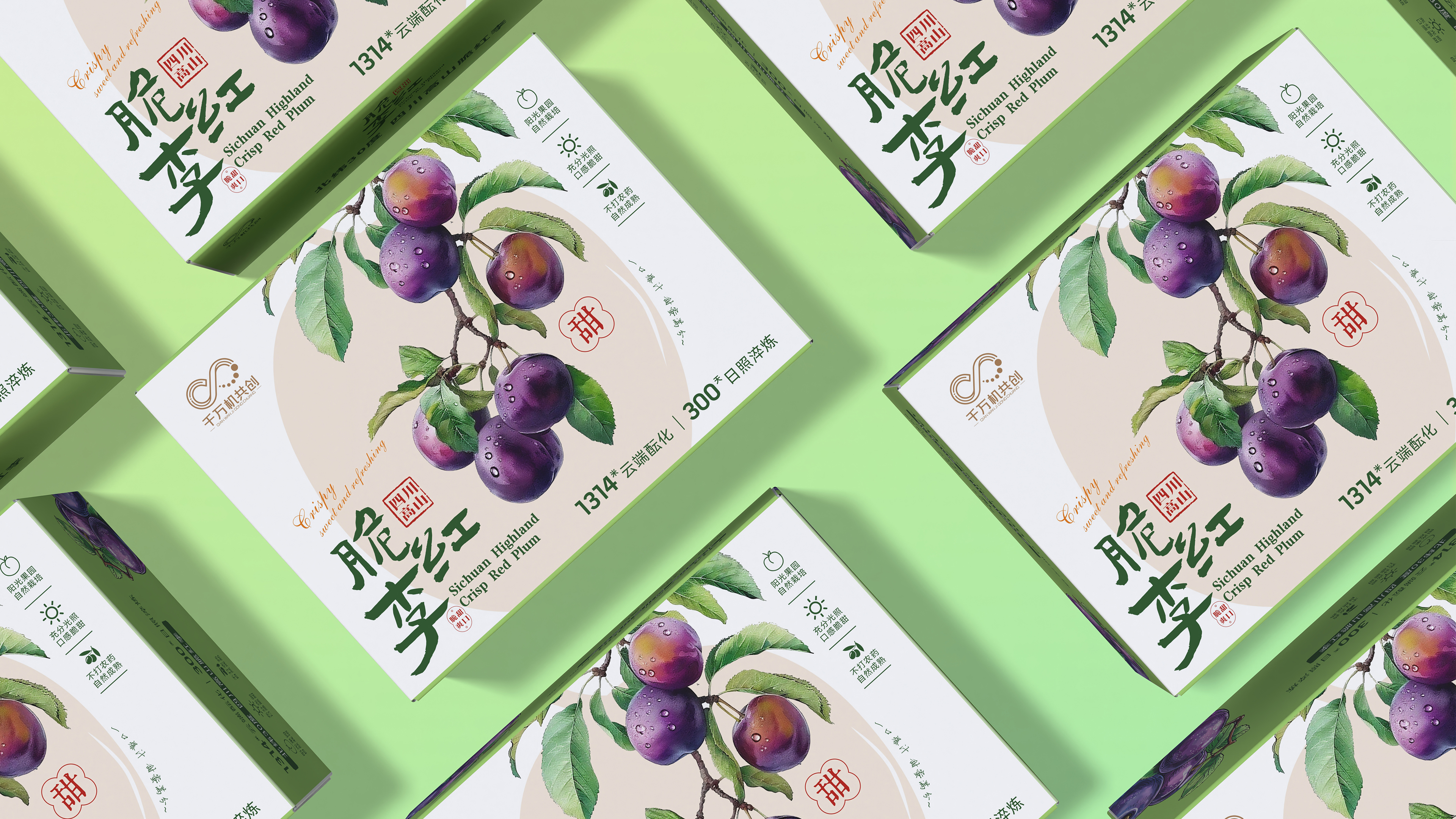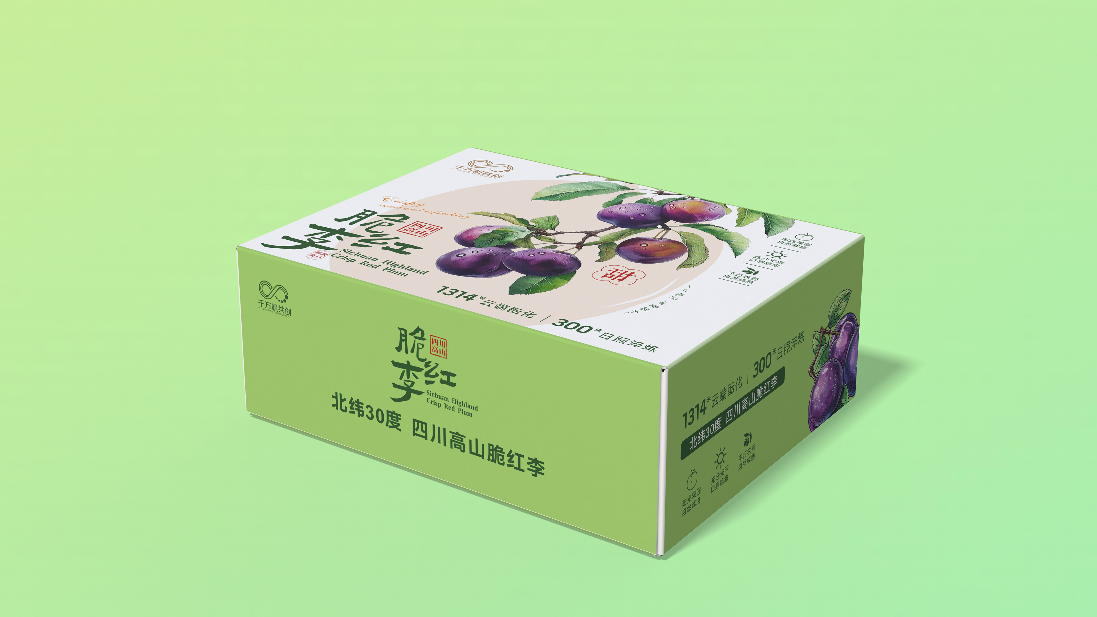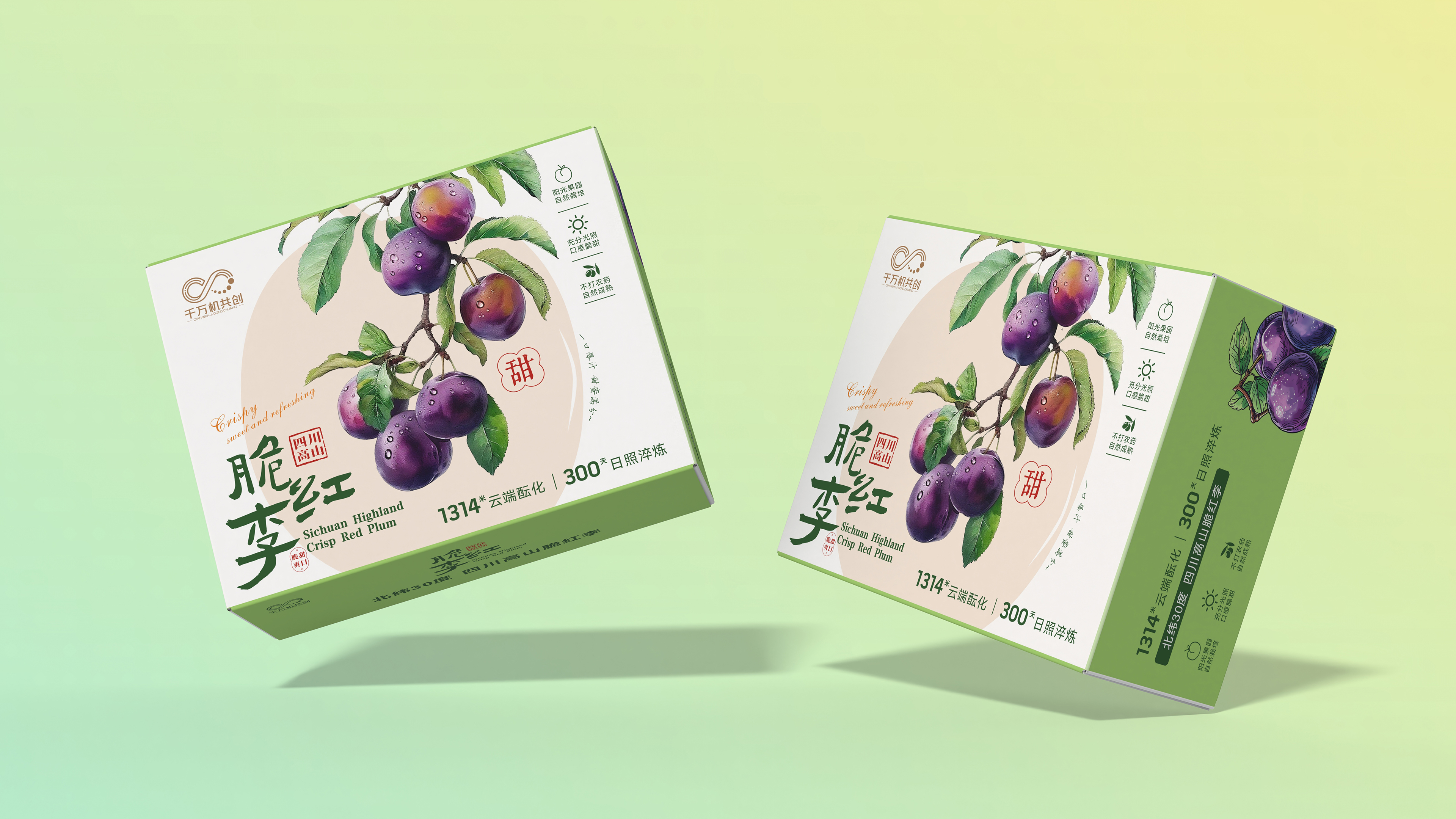 This packaging design aims to create a sensory bridge, visually transporting the consumer to the pristine highlands of Sichuan. We wanted the package itself to tell a story of sunshine, altitude, and artisanal care, allowing the consumer to almost breathe in the fresh mountain air from the 30°N latitude orchard upon opening the box. The core of the design is "Authentic Presentation," faithfully conveying the crisp, sweet, refreshing, and fresh qualities of the Crisp Red Plum.