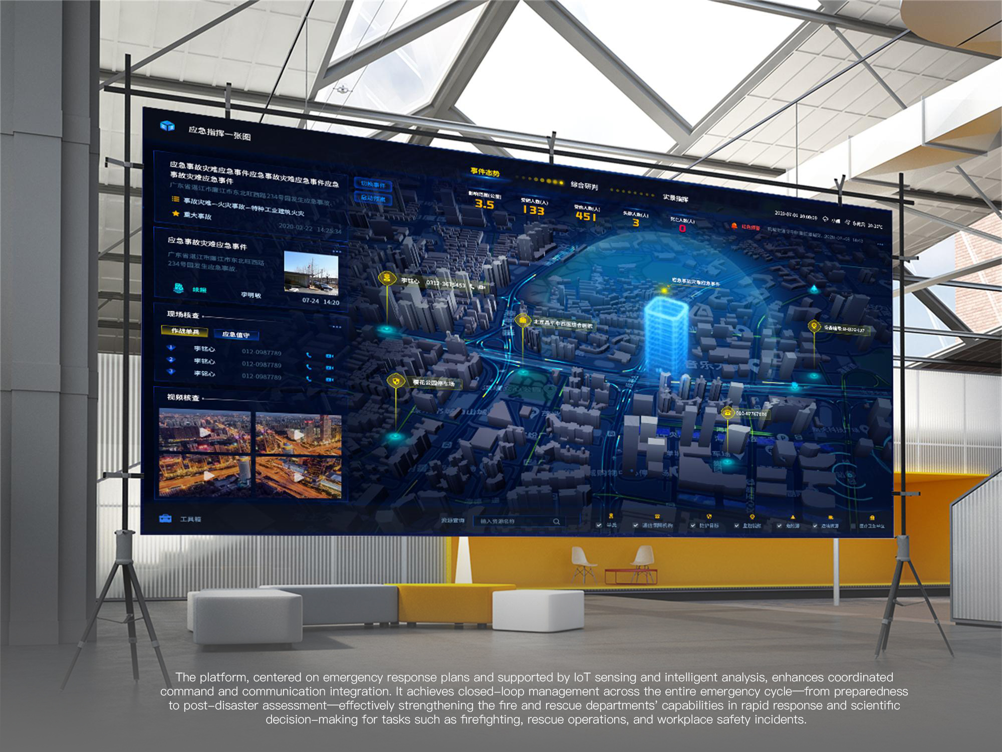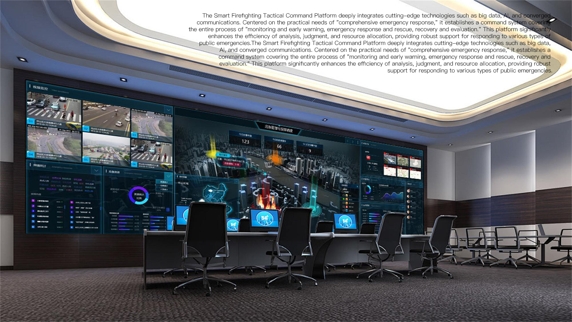 The Smart City-based Firefighting Command Platform is an integrated operational command and dispatch system designed to consolidate core functions including multi-hazard emergency response coordination, fire rescue operations, and monitoring and early warning capabilities. It enables end-to-end collaborative coordination across the entire emergency response chain.