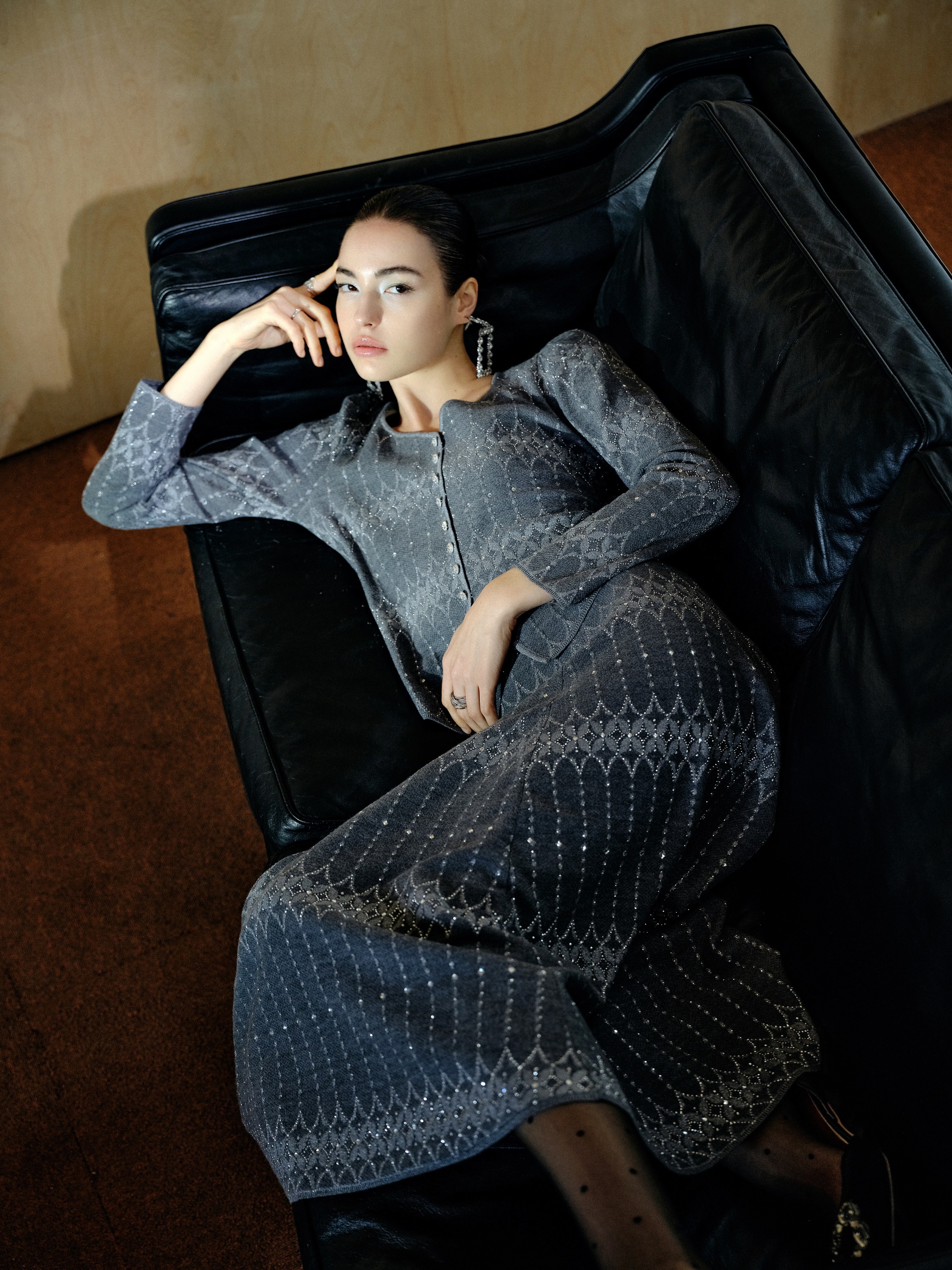 DENSE & LIGHT employs an air-layer float stitch technique, using double-ply Basure Australian wool as the core material, with metallic threads woven into the outer layer to create embossed French floral patterns. Through density adjustments made five times every 2 centimeters, the technique controls structural undulation to achieve seamless transitions between flat and three-dimensional surfaces.