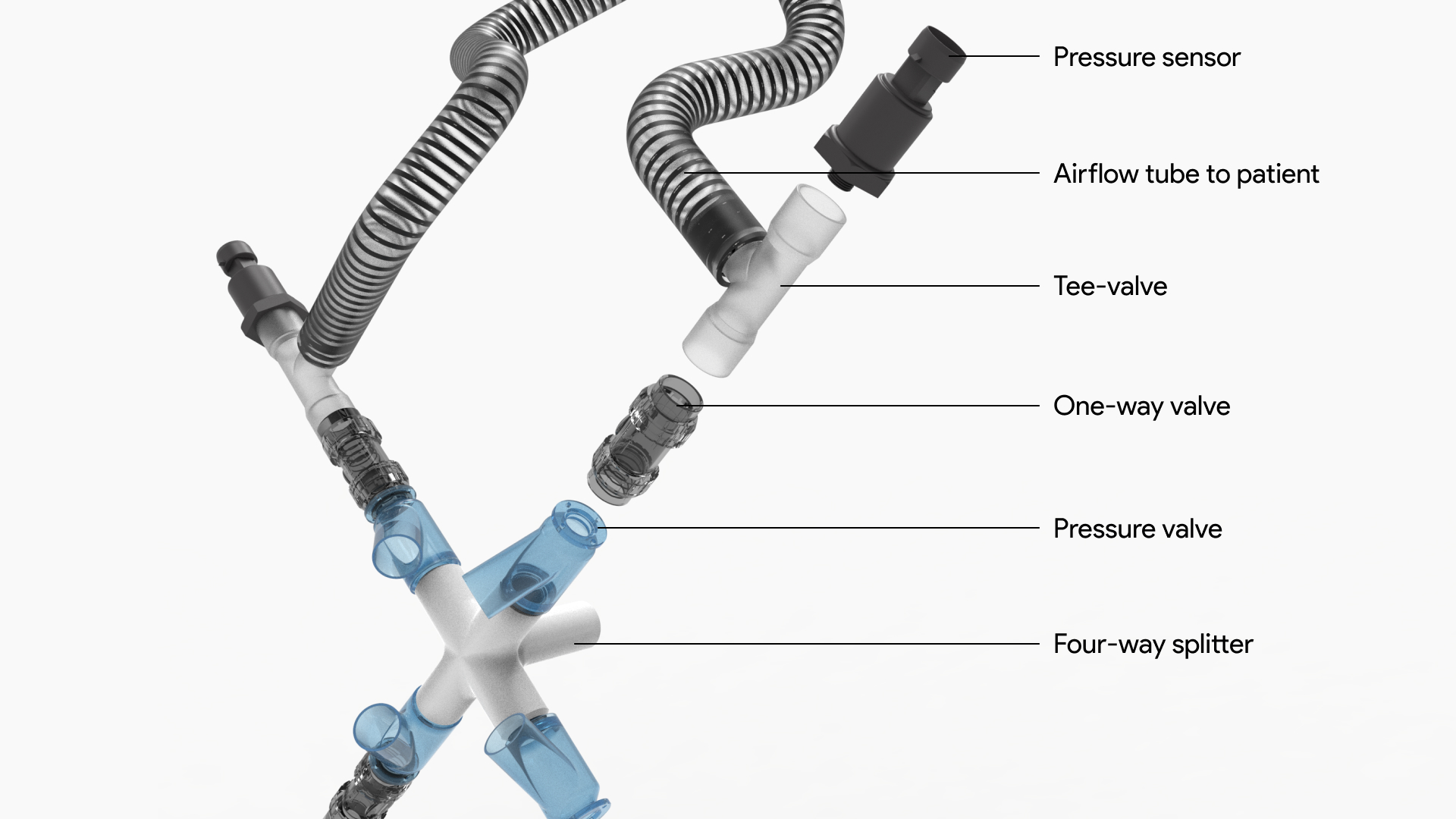 Prana's clever design leverages off-the-shelf, medical-grade parts that plug into each other and connect to the main ventilator unit through a unique four-way splitter. All the components are housed in an enclosure that facilitates rapid assembly and disassembly of parts for maintenance and sterilization. Prana also comes with a centralized dashboard where four patients can be monitored simultaneously using a set of sensors connected to audio-visual alarms, and their individual airflow can be adjusted. The splitter costs less than $2,500 for four patients, compared to traditional ventilators that cost $17,000 for only one patient.