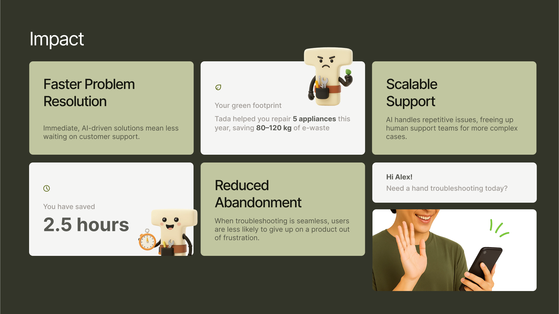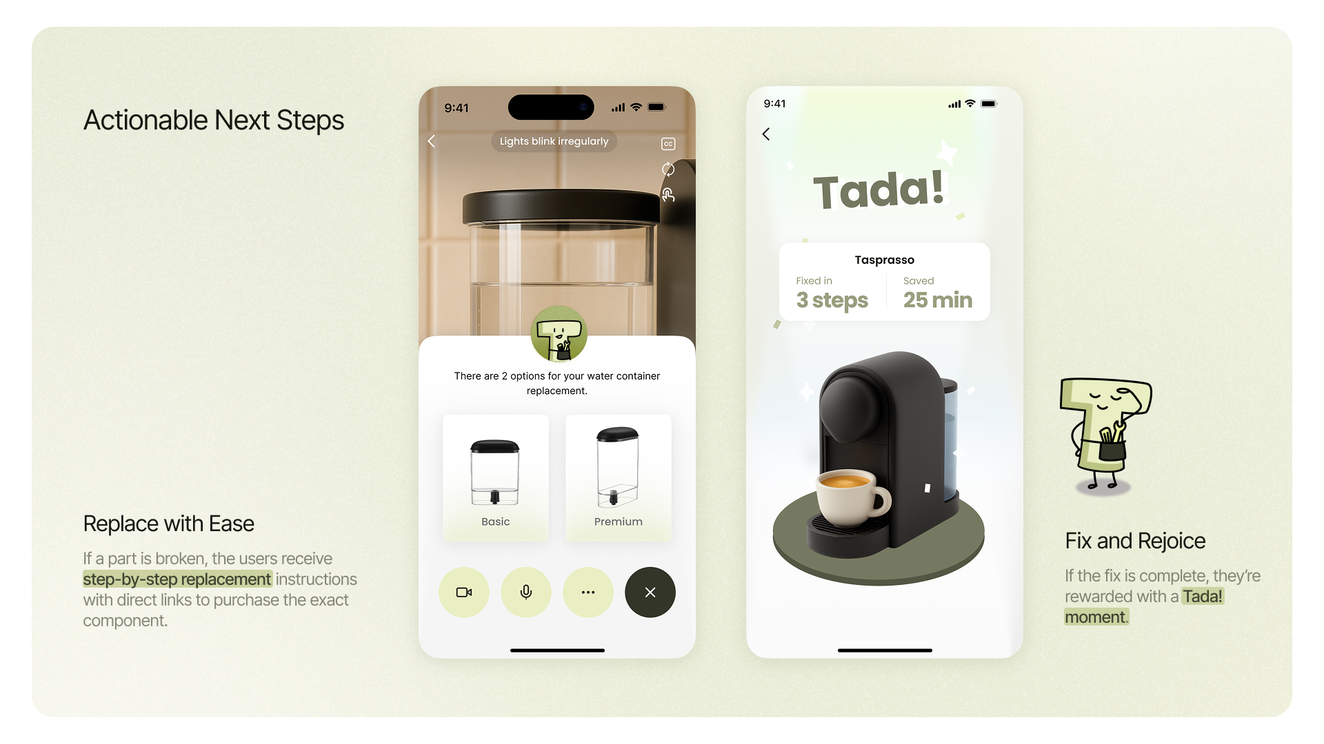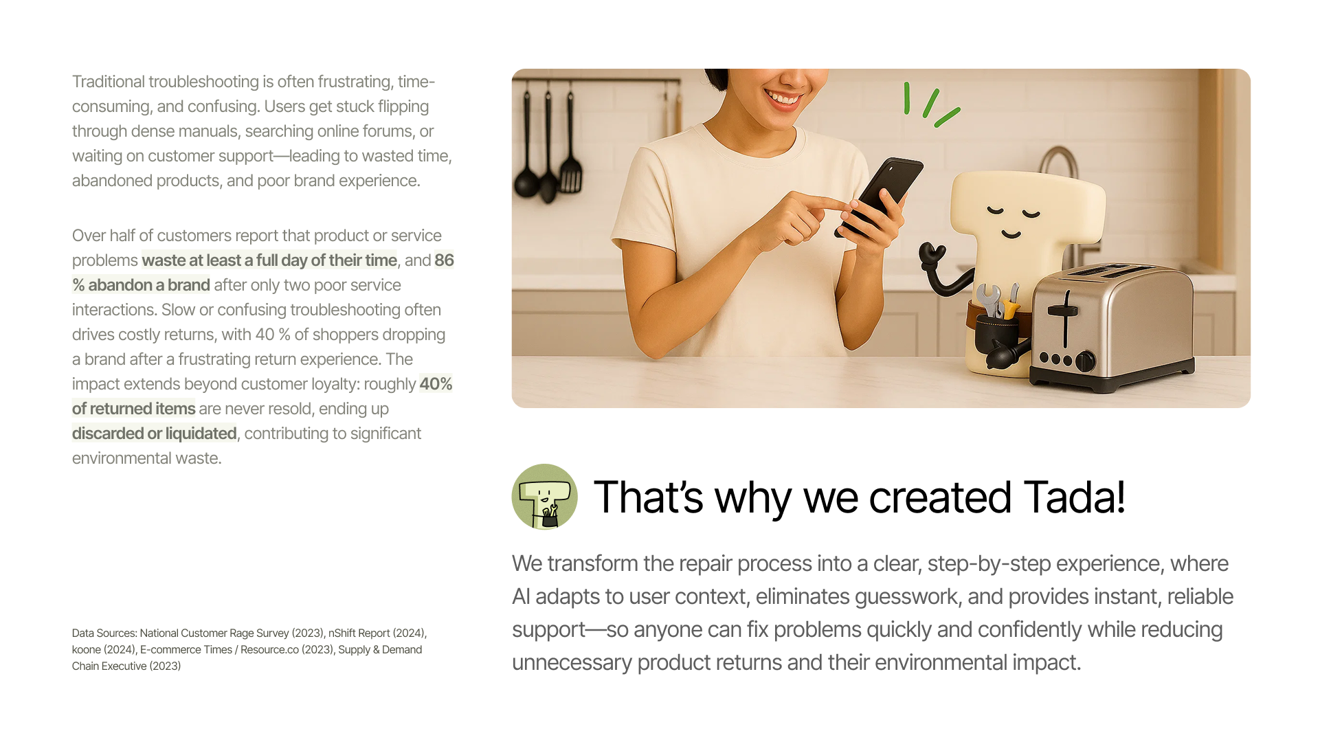 Tada! is an AI-powered trouble shooting assistant for small applicants that makes repairs seamless and empowering. Instead of scattered manuals and confusing forums, users receive clear, adaptive guidance tailored to their needs. Multimodal inputs—voice, text, or image—remove guesswork, while step-by-step resources and live agent support ensure no one gets lost along the way. From root cause analysis to replacement or repair, every journey ends with a celebratory “Tada!” moment. By turning frustration into clarity, Tada reduces abandonment and restores confidence in every fix.