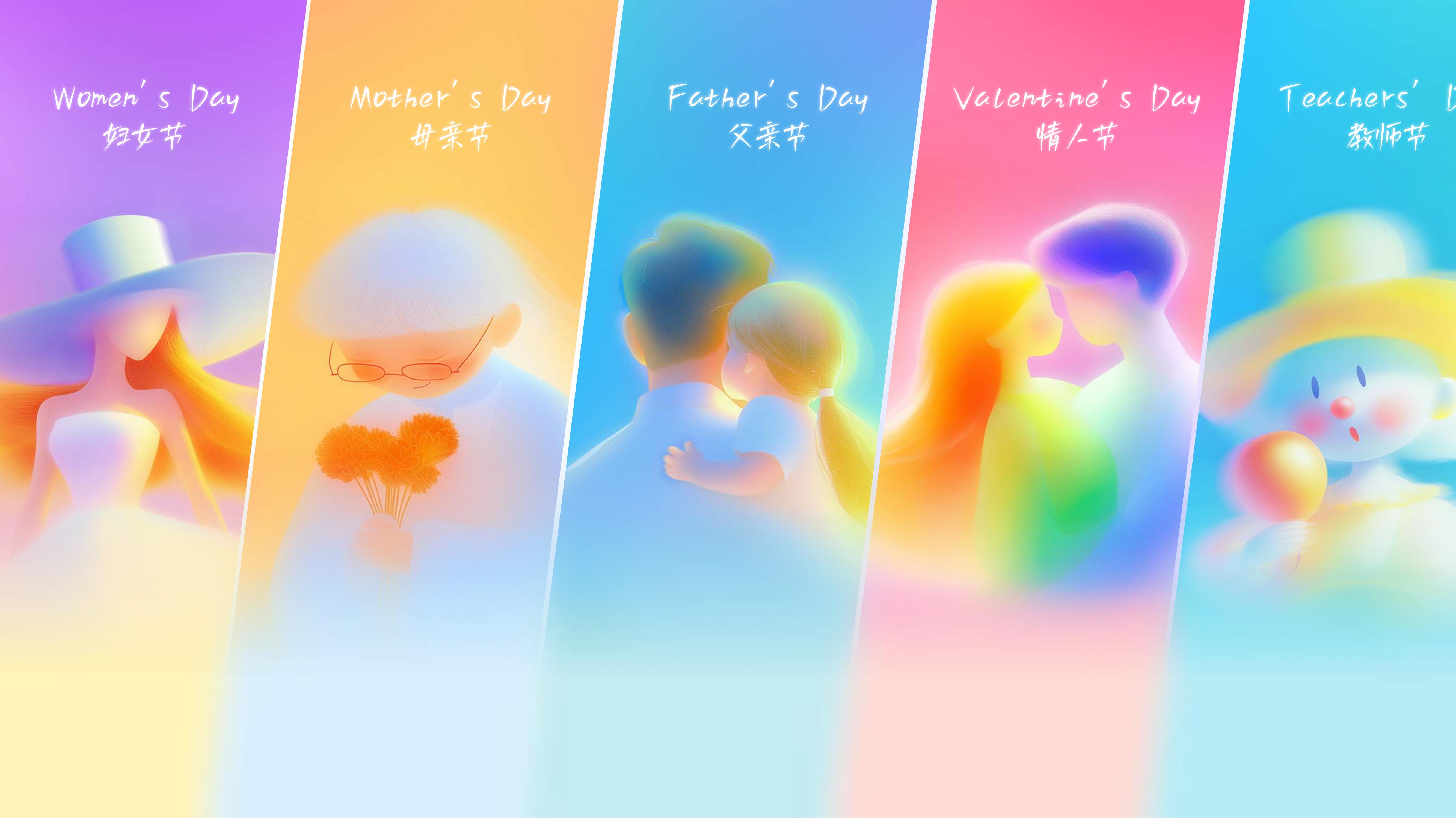 Western/international holidays, many of which originate from religious traditions or significant historical events, often center around "people" to convey emotions and values. Take Mother's Day, Father's Day, and Valentine's Day, for example; their designs frequently use human elements to express the holiday's sentiments.