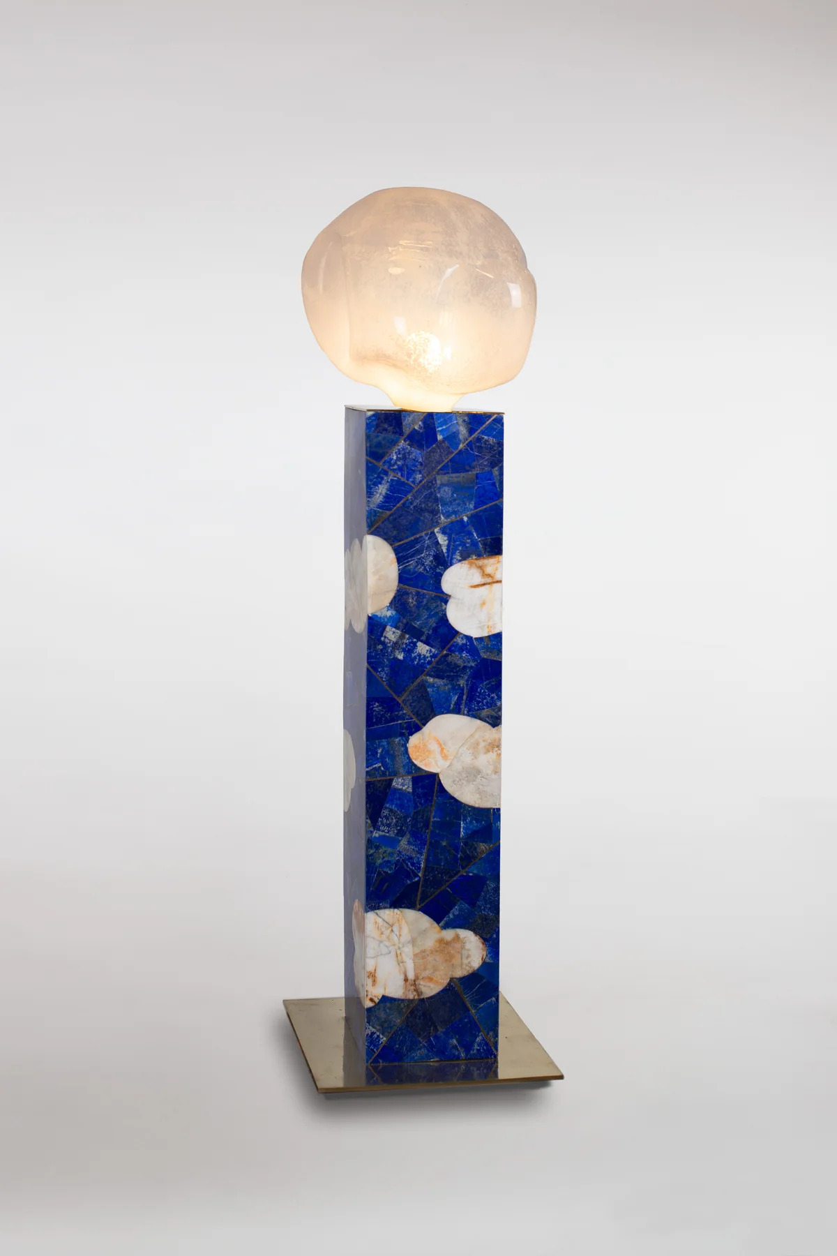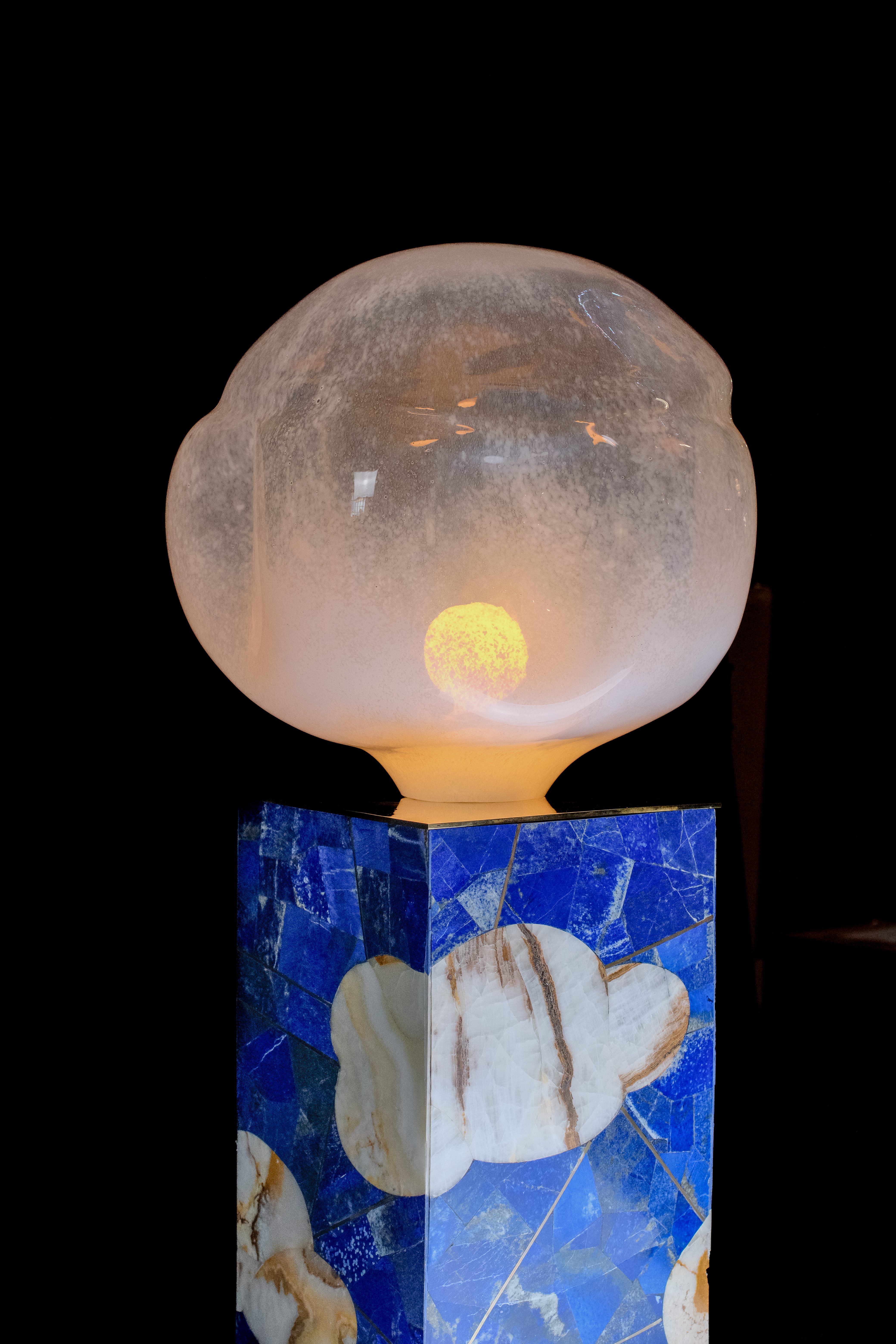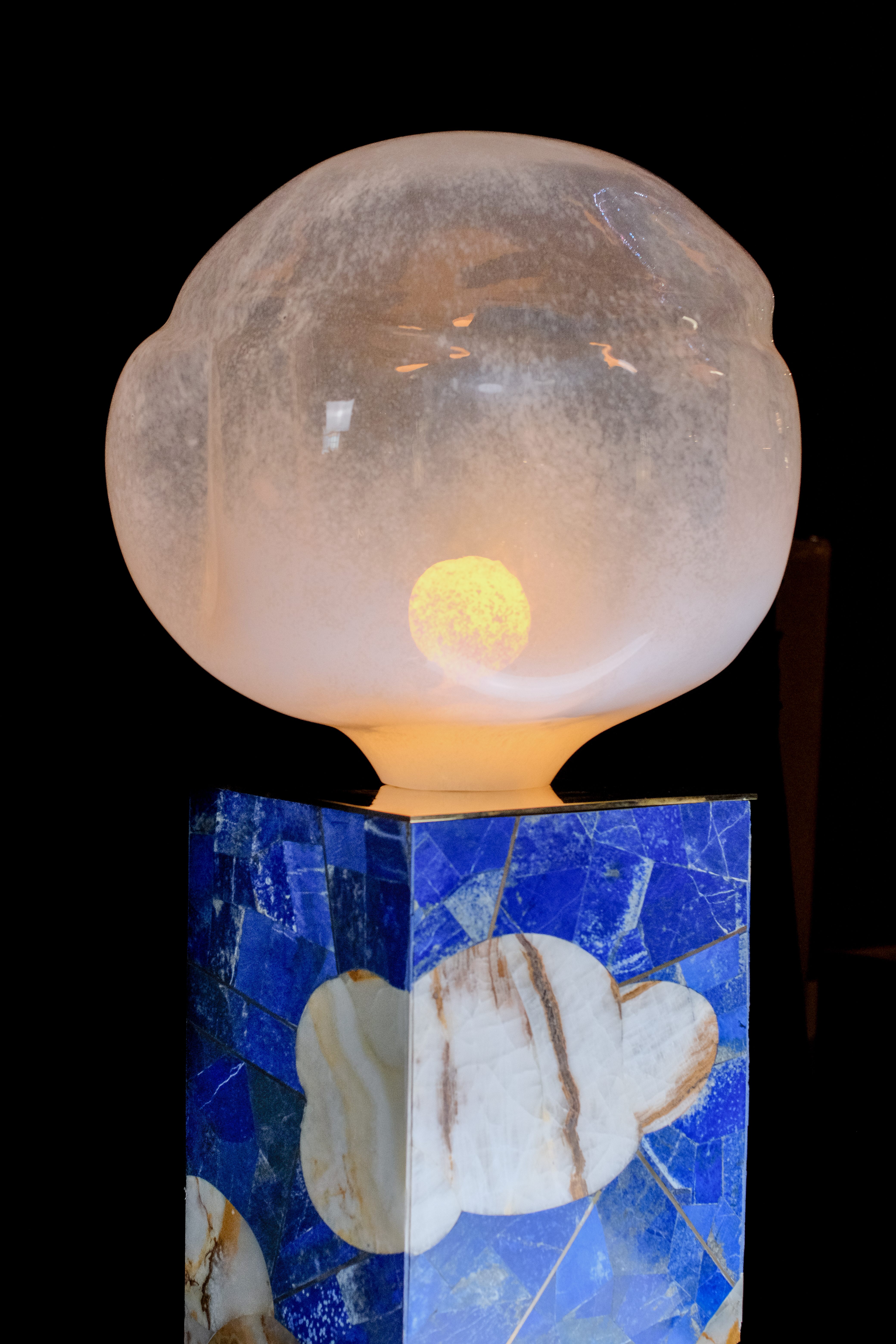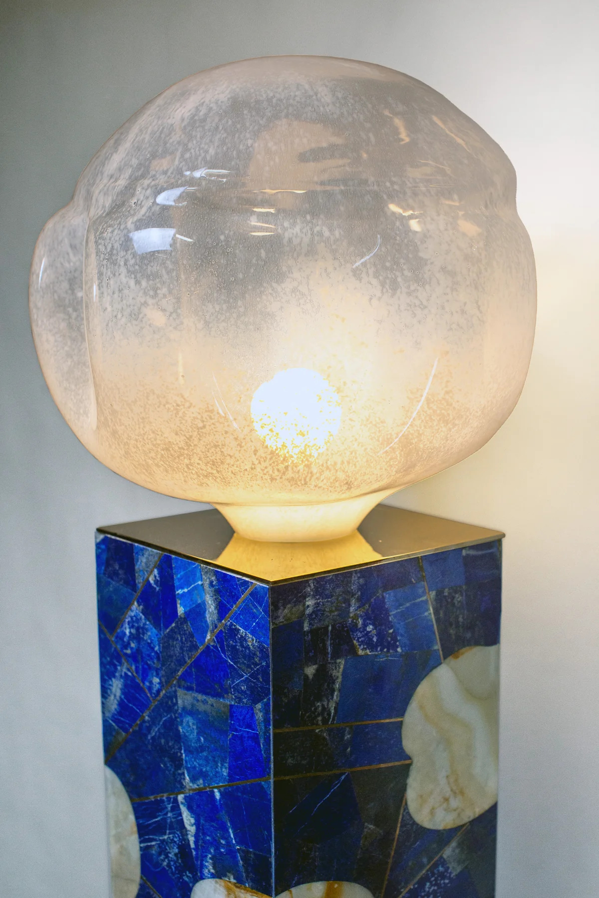At its crown, a hand-blown opalino glass orb evokes a luminous nebula, gracefully suspended above a column of deep Moroccan Lapis Lazuli. Below, cloud-like formations of Italian Bianco Lasa Marble emerge, delicately traced with inlaid bands of solid brass—an elegant interplay of earth and sky. The interplay of opalescent, frosted, and subtly tinted glass diffuses light in gradients, creating a dynamic glow reminiscent of dawn and dusk transitions.