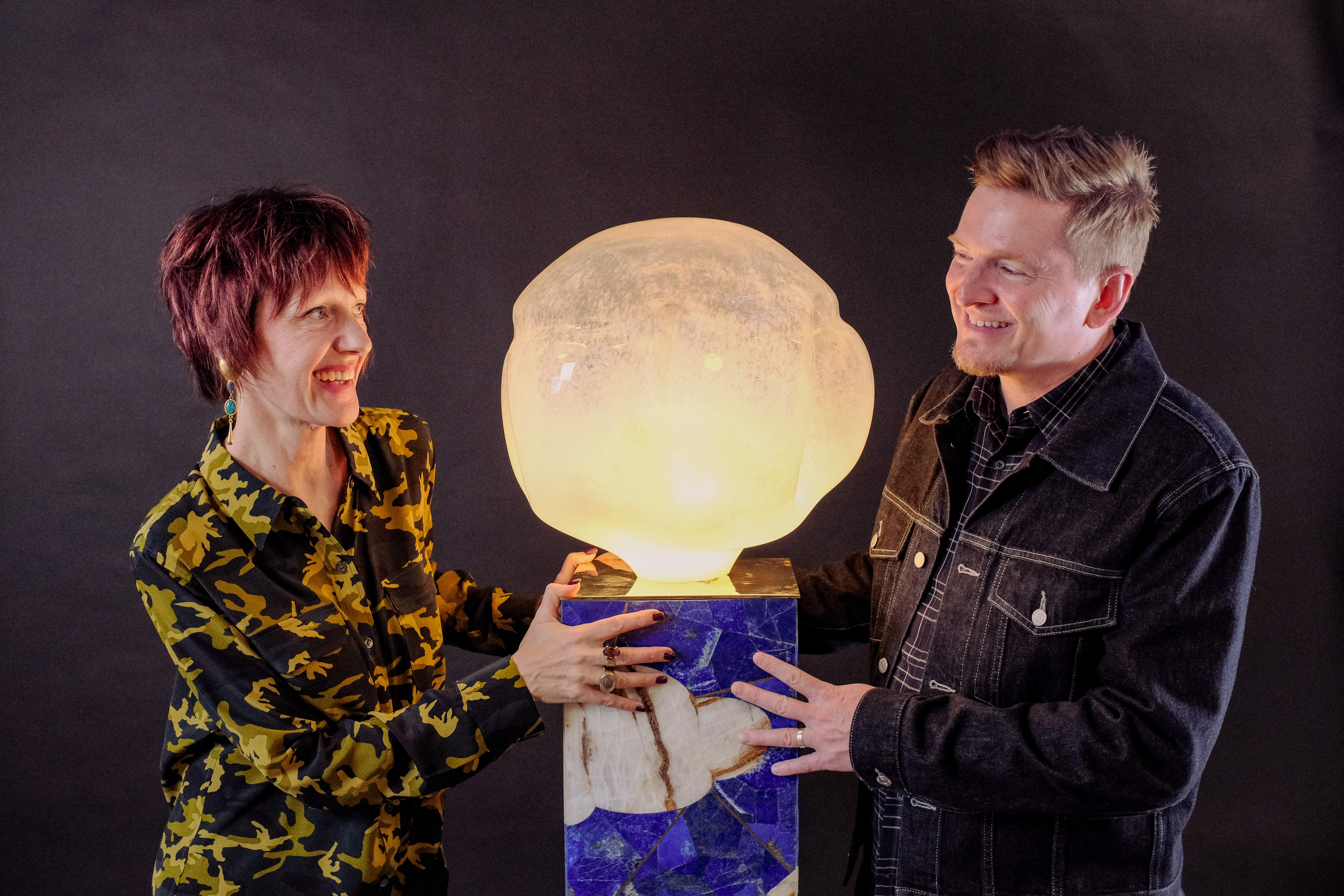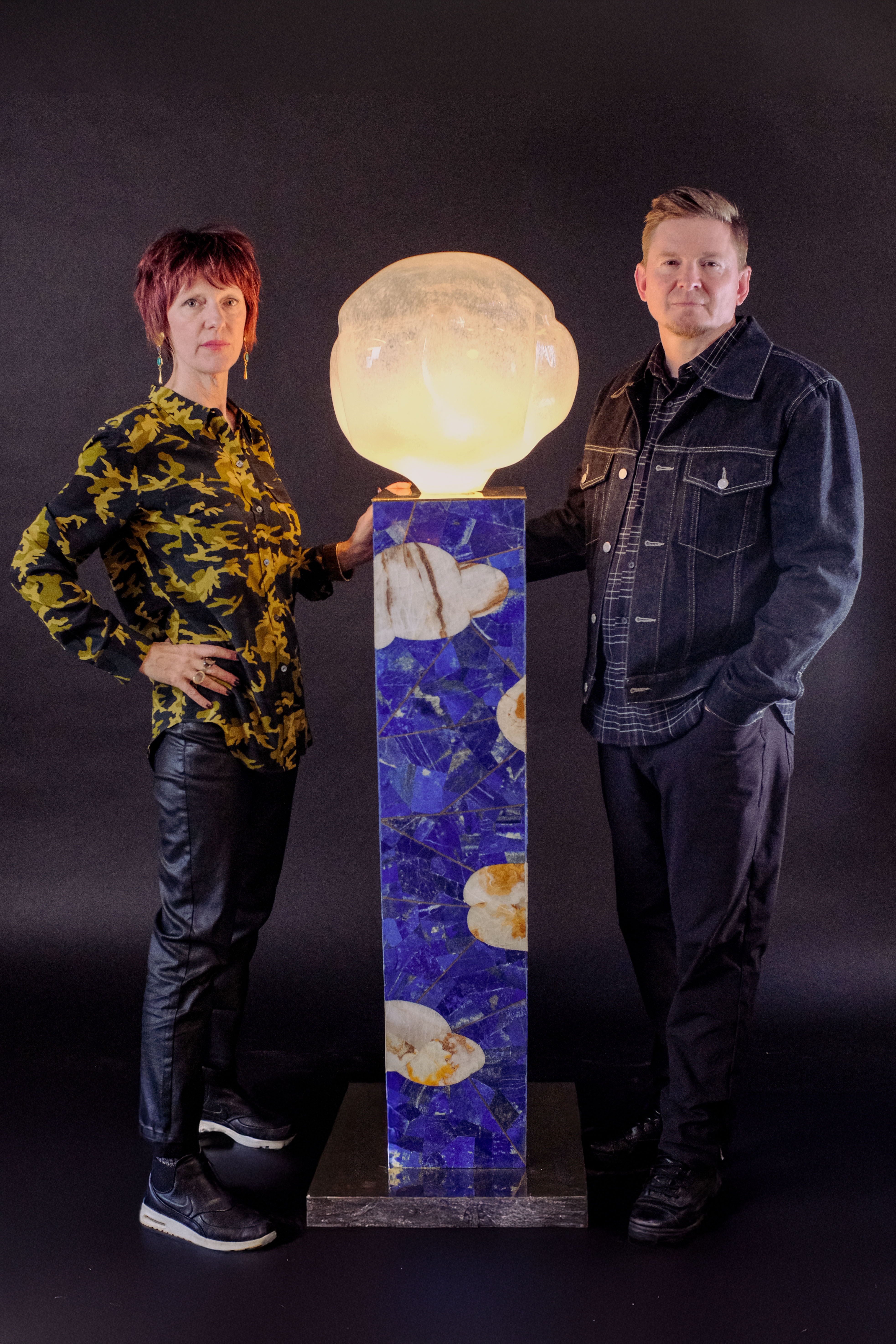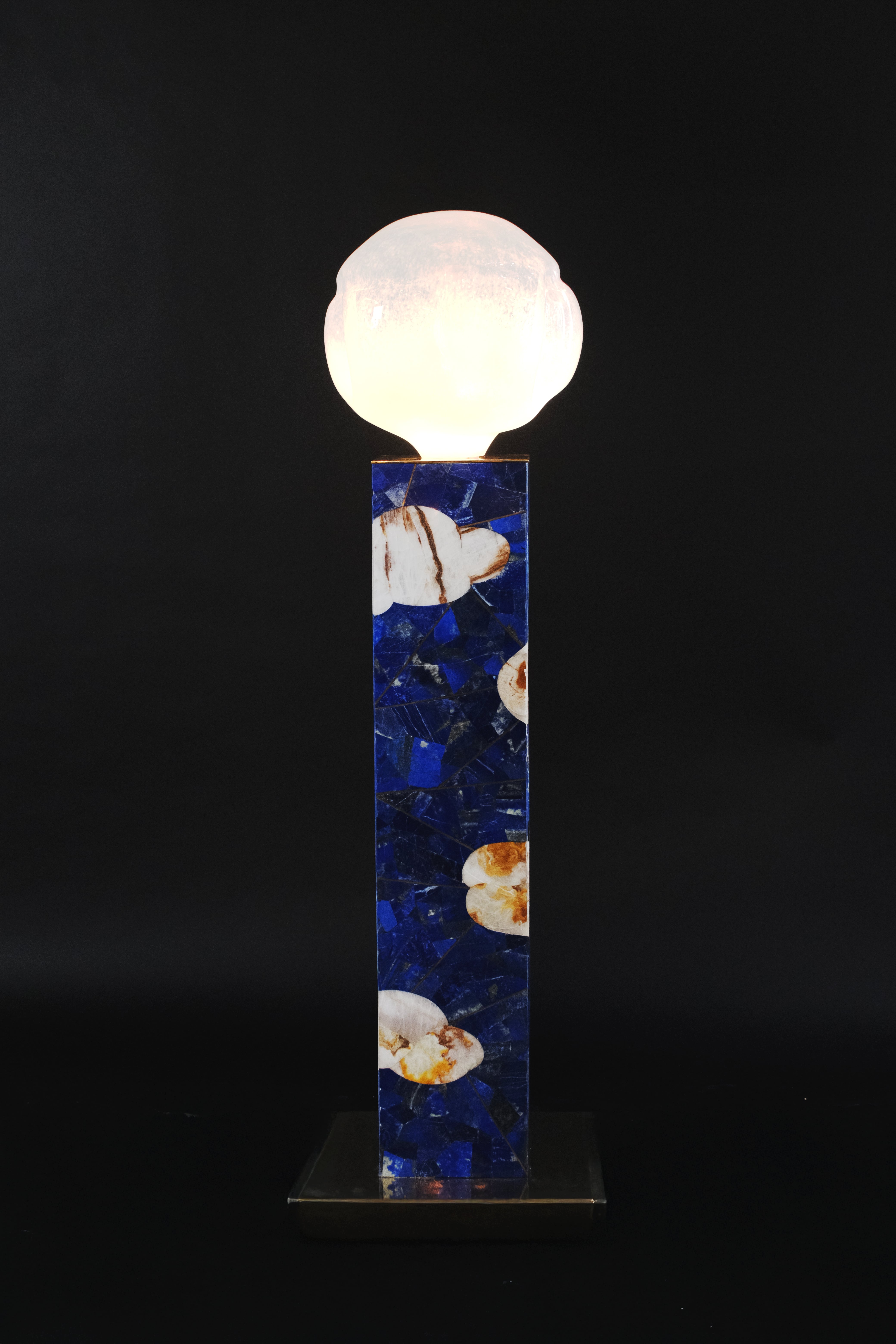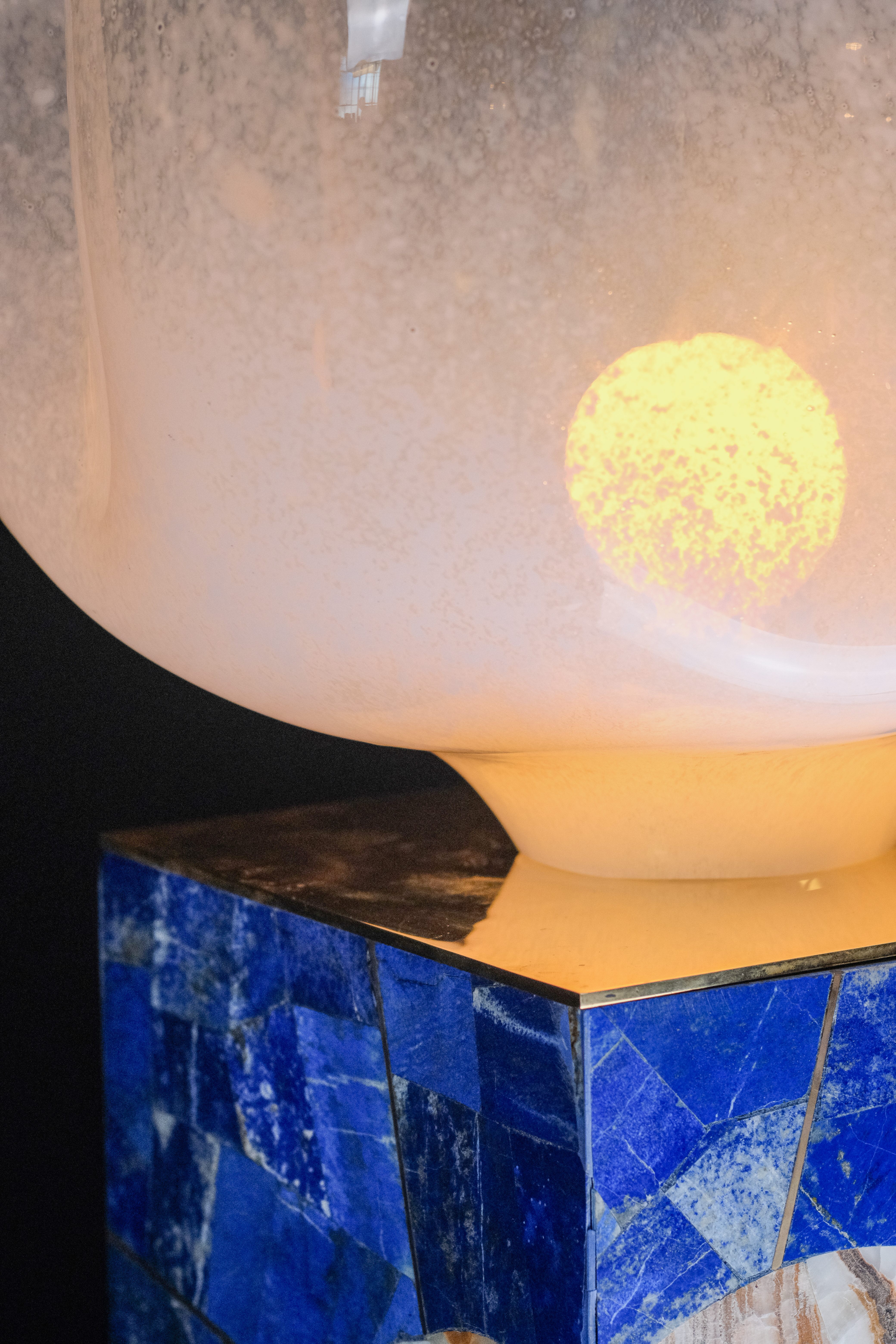 At its crown, a hand-blown opalino glass orb evokes a luminous nebula, gracefully suspended above a column of deep Moroccan Lapis Lazuli. Below, cloud-like formations of Italian Bianco Lasa Marble emerge, delicately traced with inlaid bands of solid brass—an elegant interplay of earth and sky. The interplay of opalescent, frosted, and subtly tinted glass diffuses light in gradients, creating a dynamic glow reminiscent of dawn and dusk transitions.