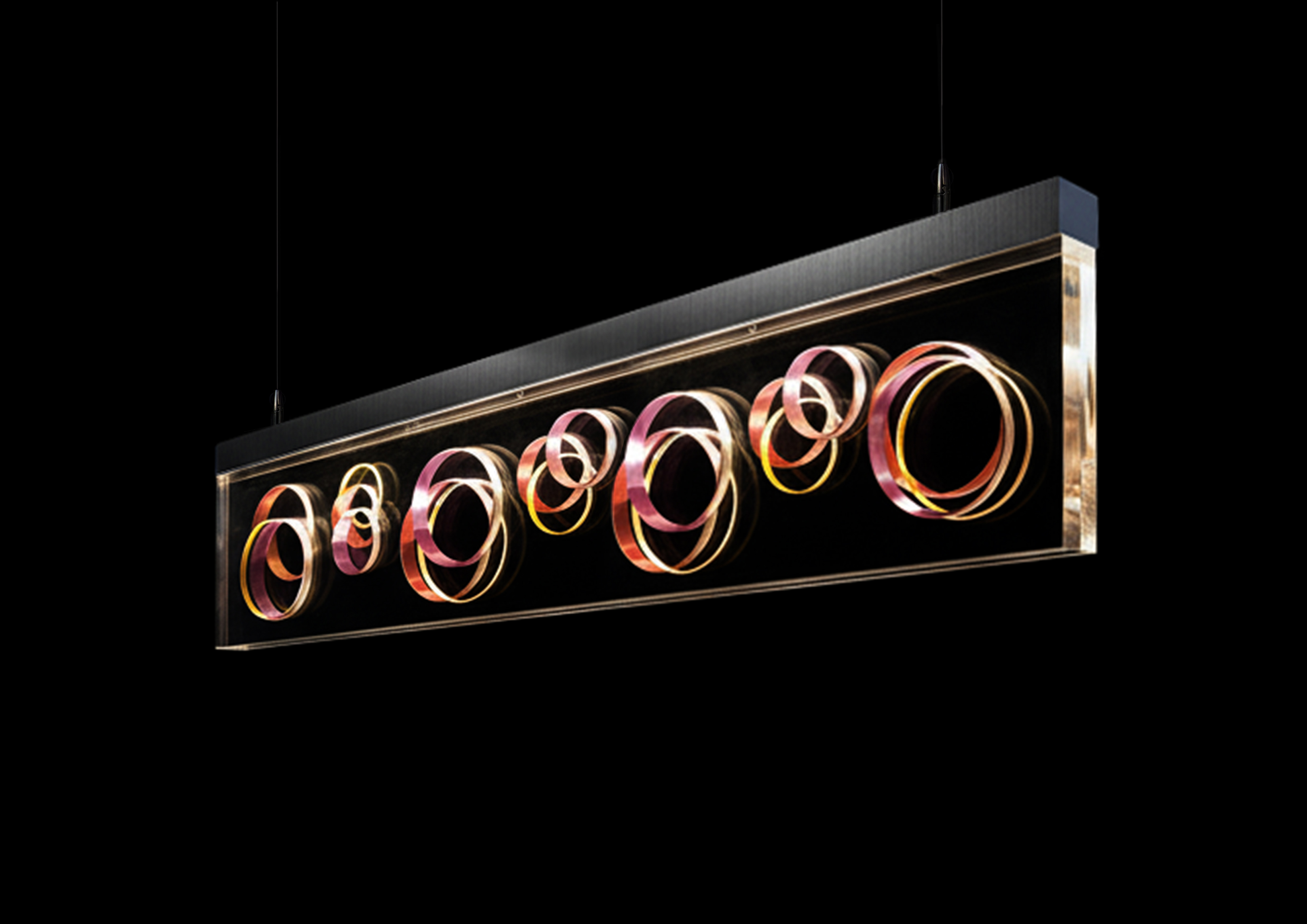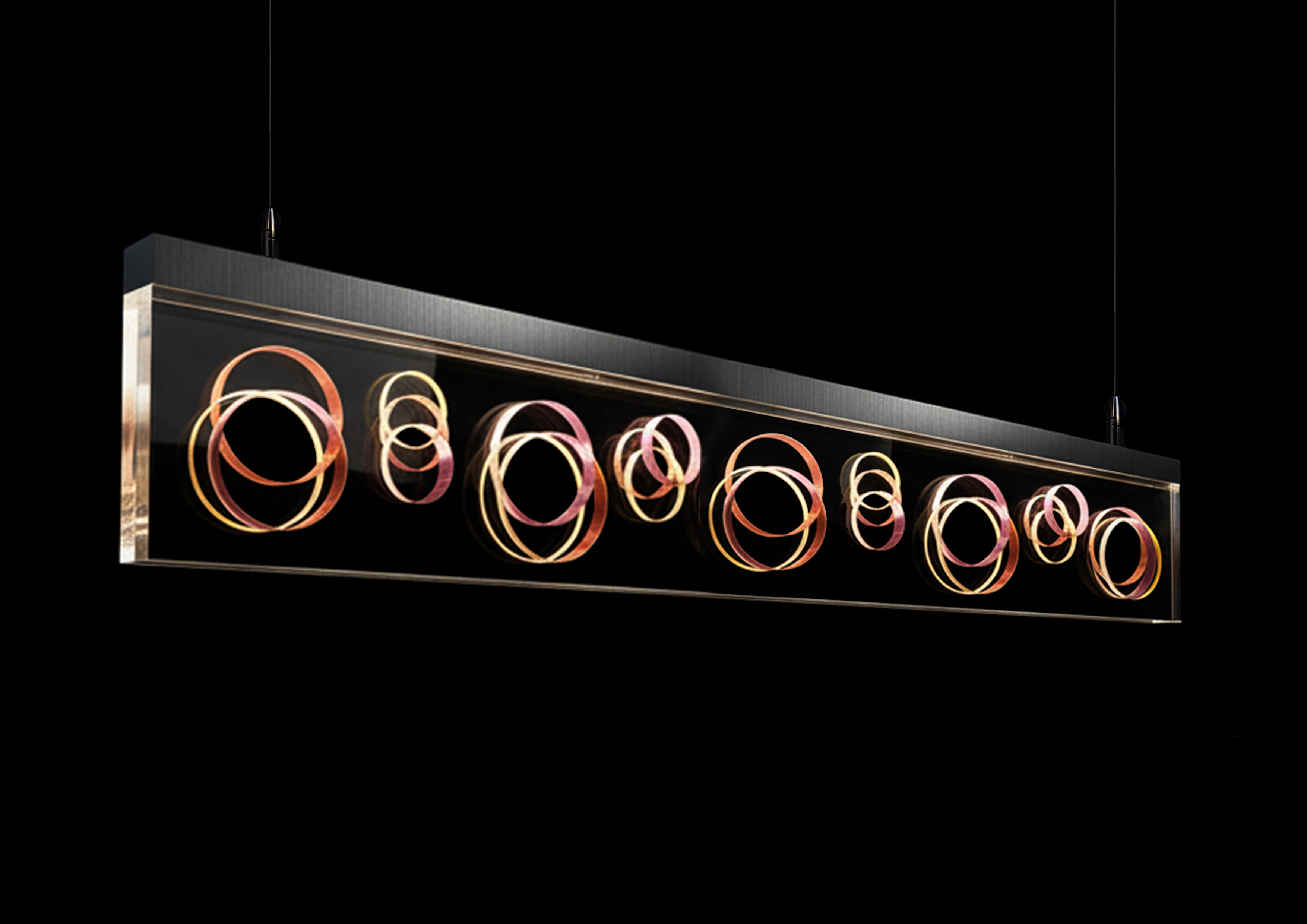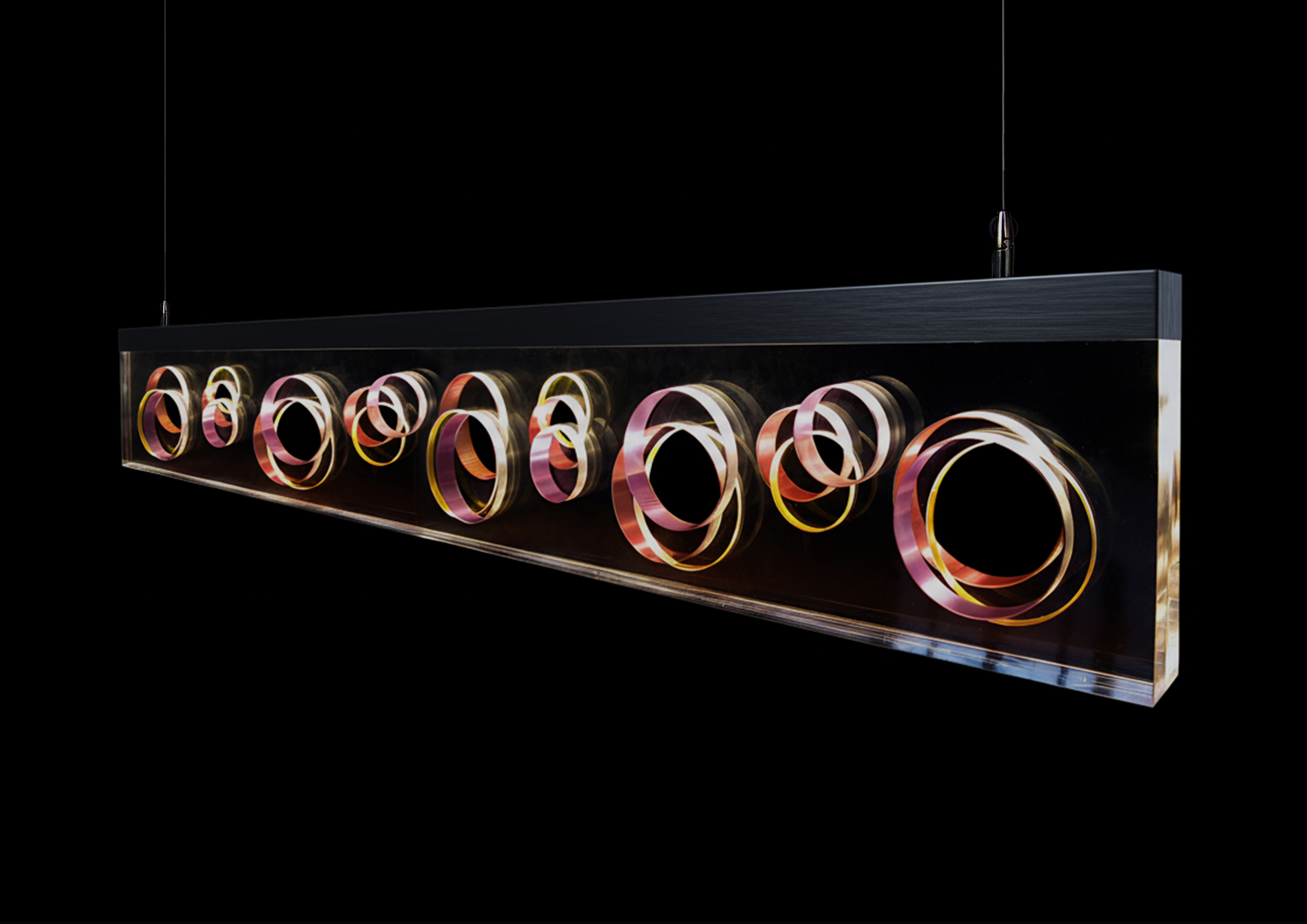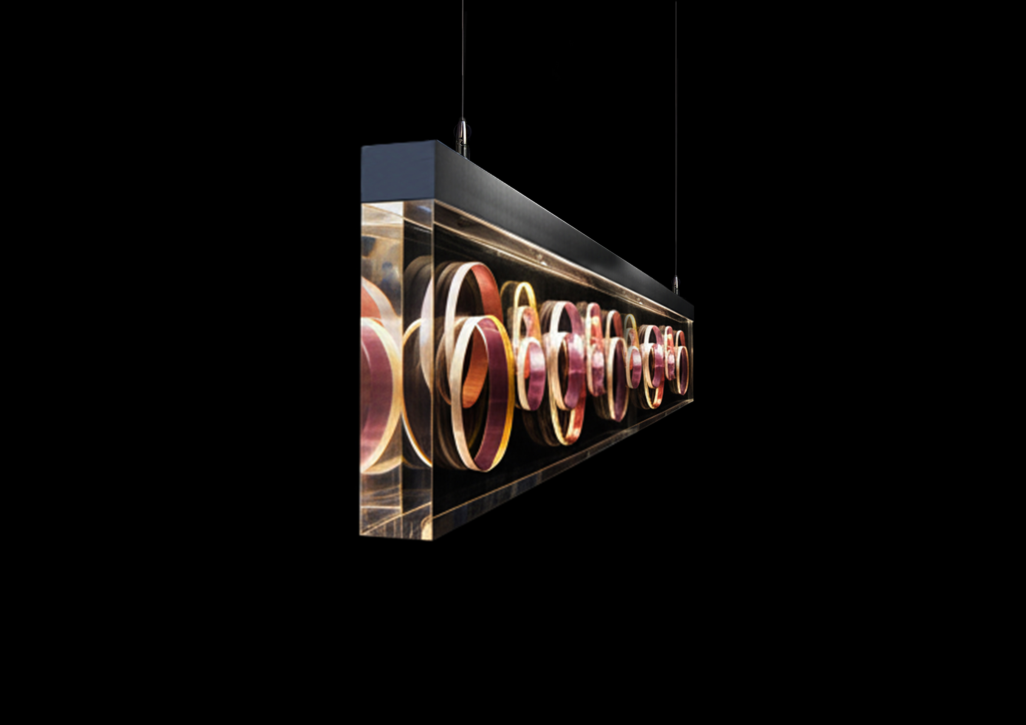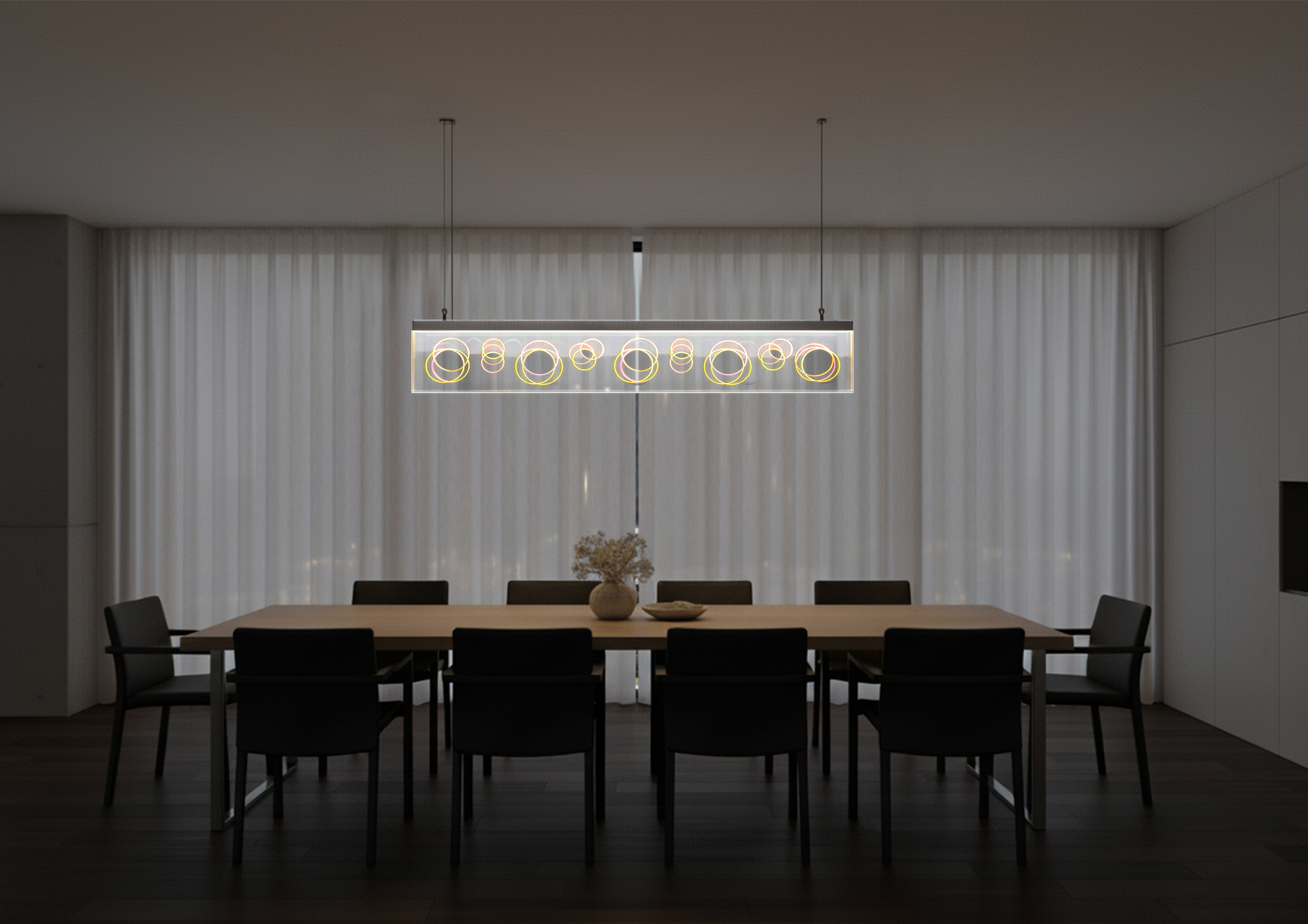 This lighting project was born from a fascination with the interplay between light, transparency, and geometry. The inspiration came from the way light passes through transparent materials and is revealed through its diffusion in the circular perforations present in the original parallelipipedic form.It seeks to combine formal decoration with a compromise between visual perception and the technical rigor of its construction. This pendant light combines an aluminum profile with a laser-cut acrylic parallelipipedic element with circular perforations of different diameters distributed asymmetrically.