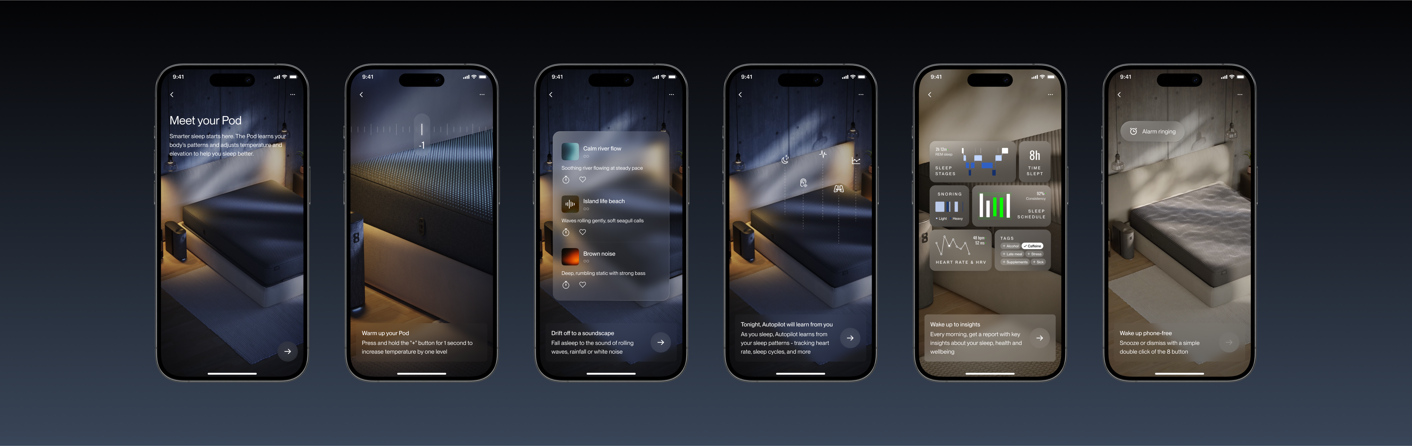 The Eight Sleep Pod is an intelligent sleep system that transforms any mattress into a personalized sleep environment. Using advanced sensors and AI-powered temperature regulation, the Pod continuously adapts throughout the night to optimize sleep quality. With multiple sophisticated capabilities working in harmony, we saw an opportunity to completely reimagine the first-time user experience.