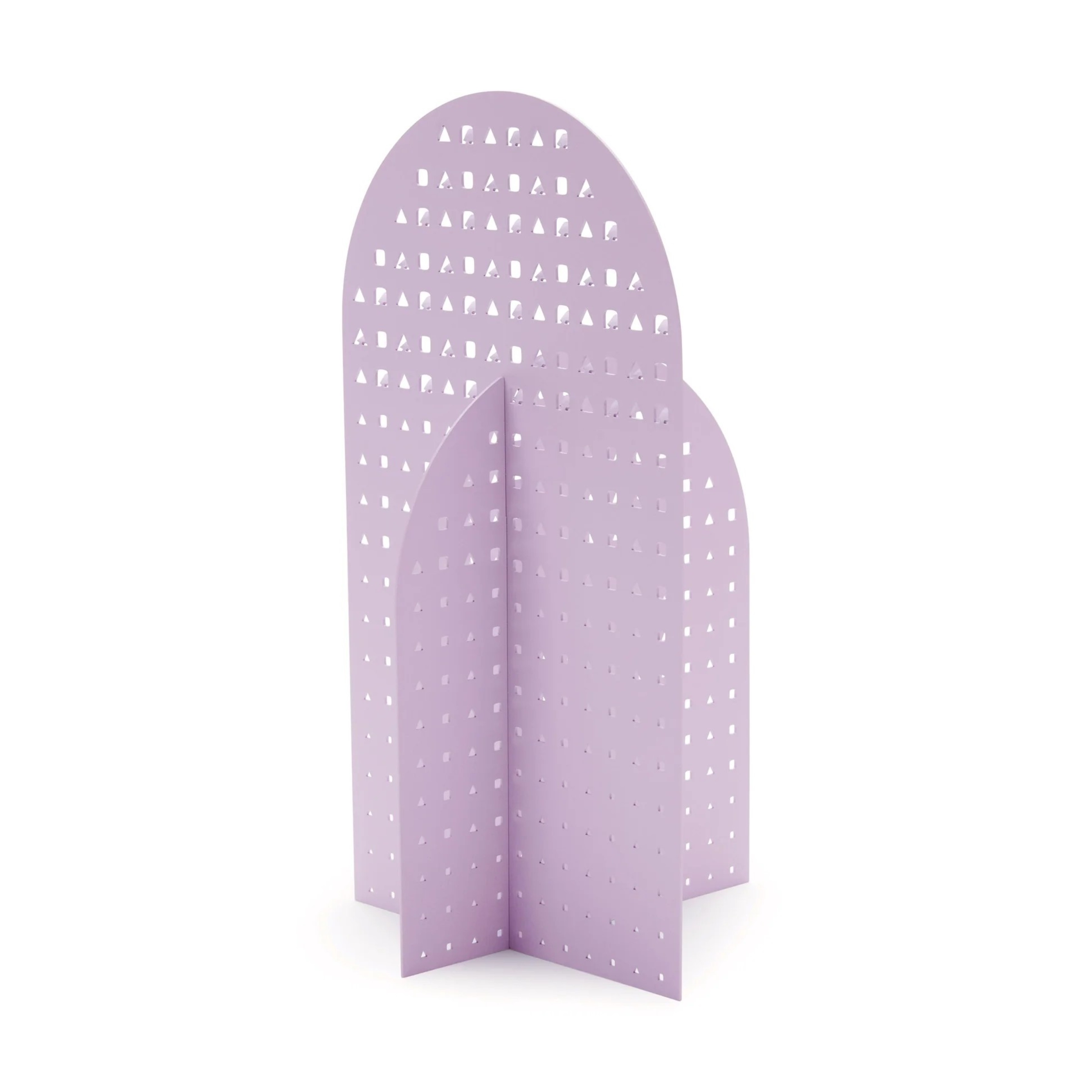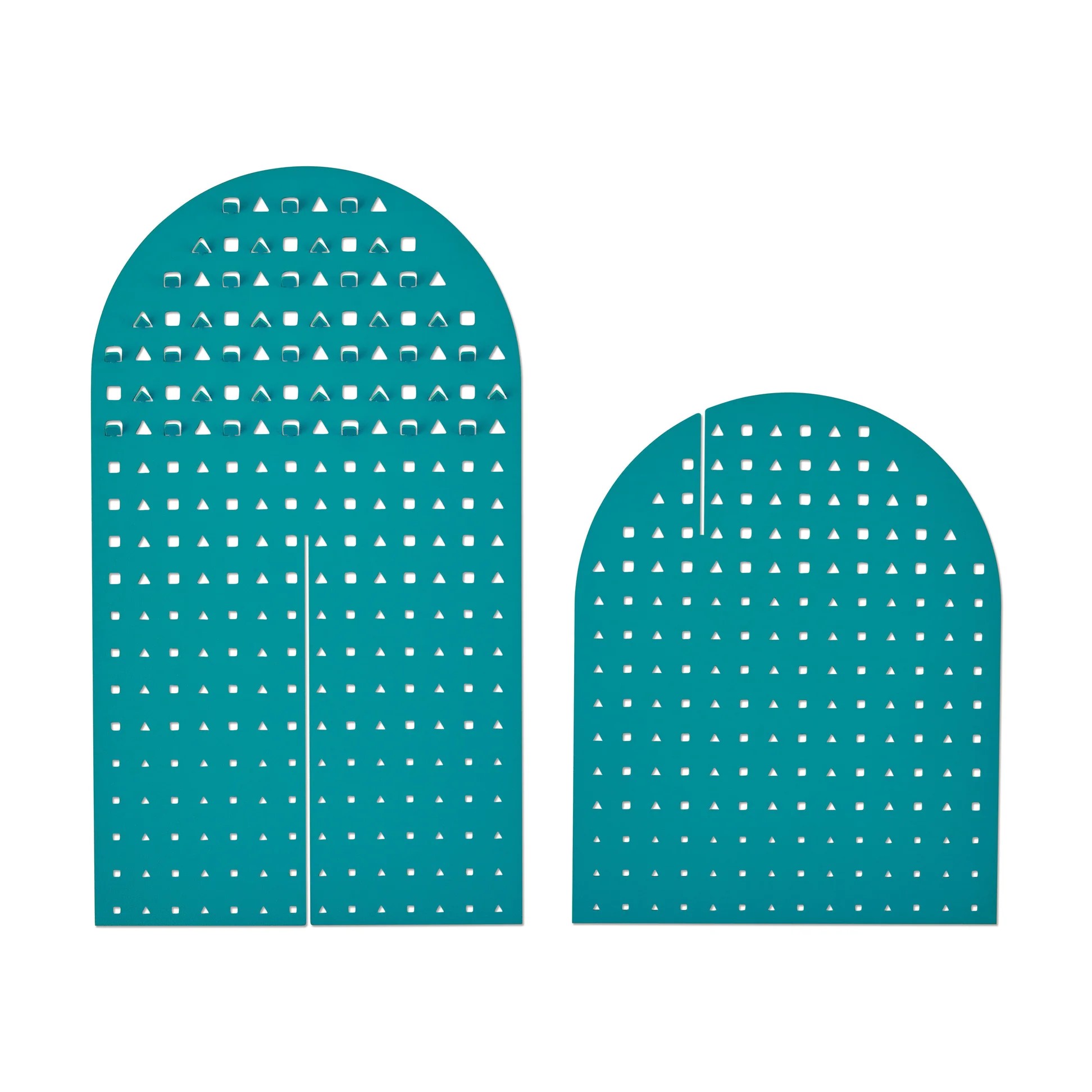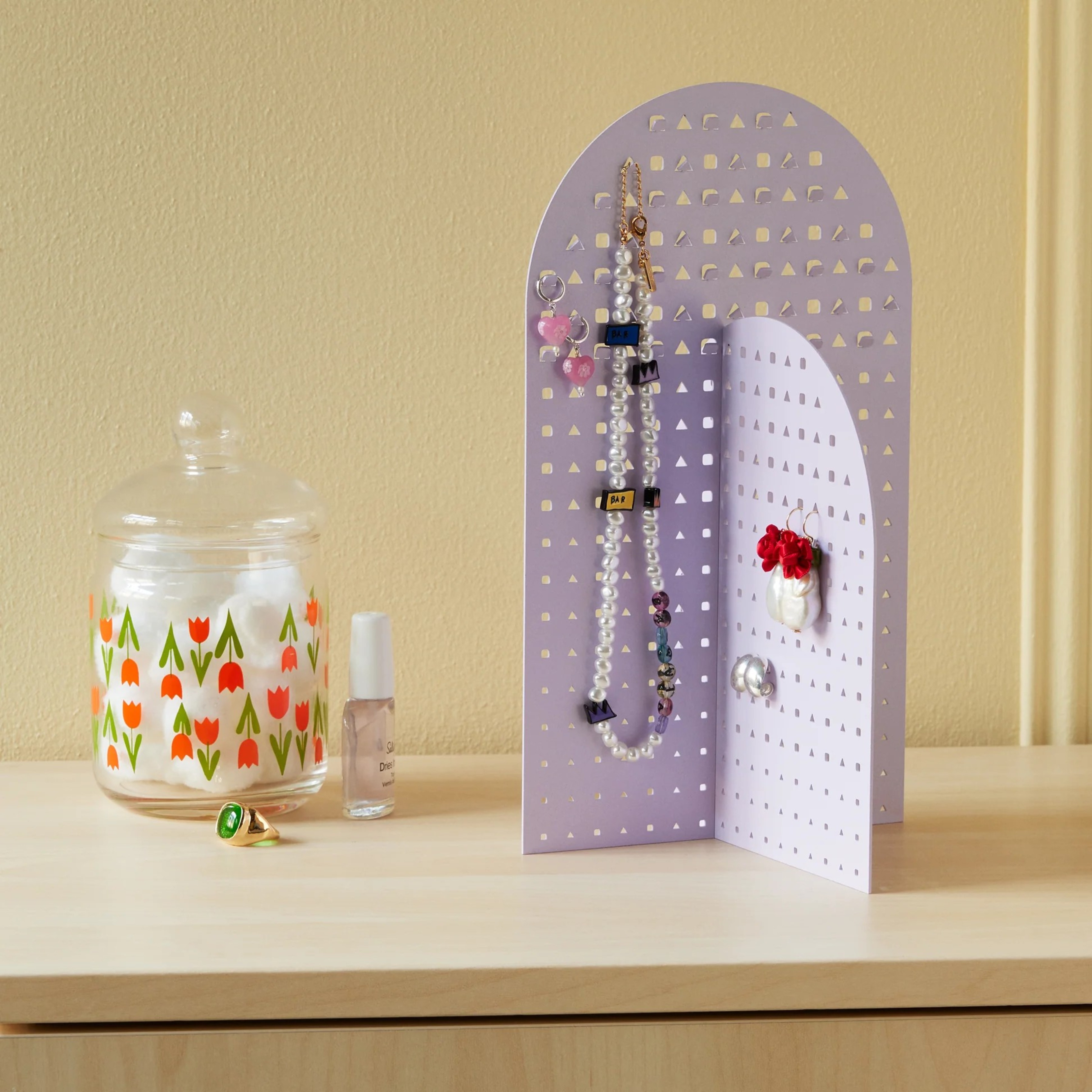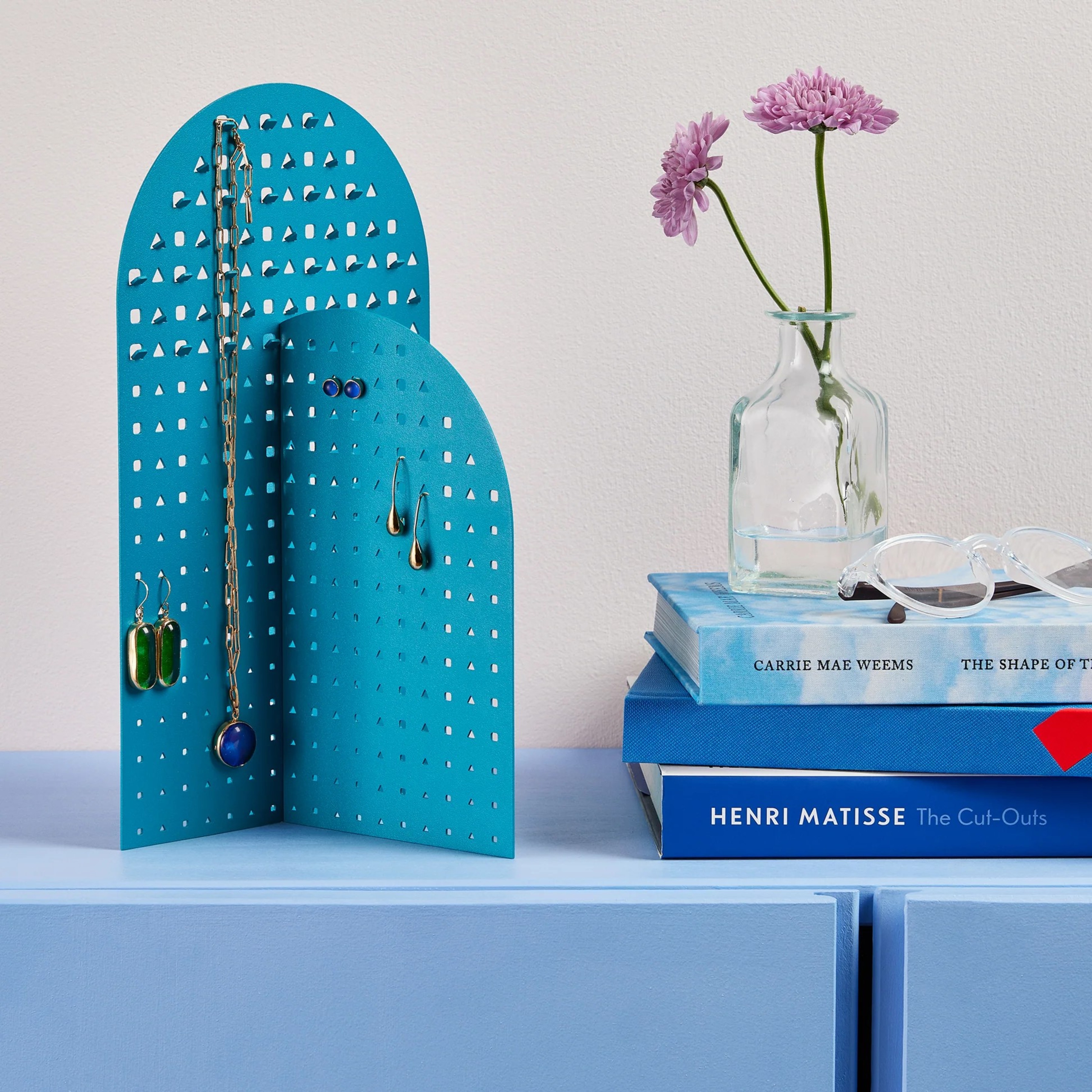 For those that value form and function, this Modern Geometry Jewelry Stand transforms the act of storing jewelry into a moment of joy. Crafted from powder-coated iron, the design features two arch-shaped panels—one tall, one short—that slot seamlessly into each other to create a sculptural, freestanding piece. The surfaces feature playful geometric perforations that function to attach earrings, while the small integrated hooks provide an easy solution for hanging necklaces and bracelets.