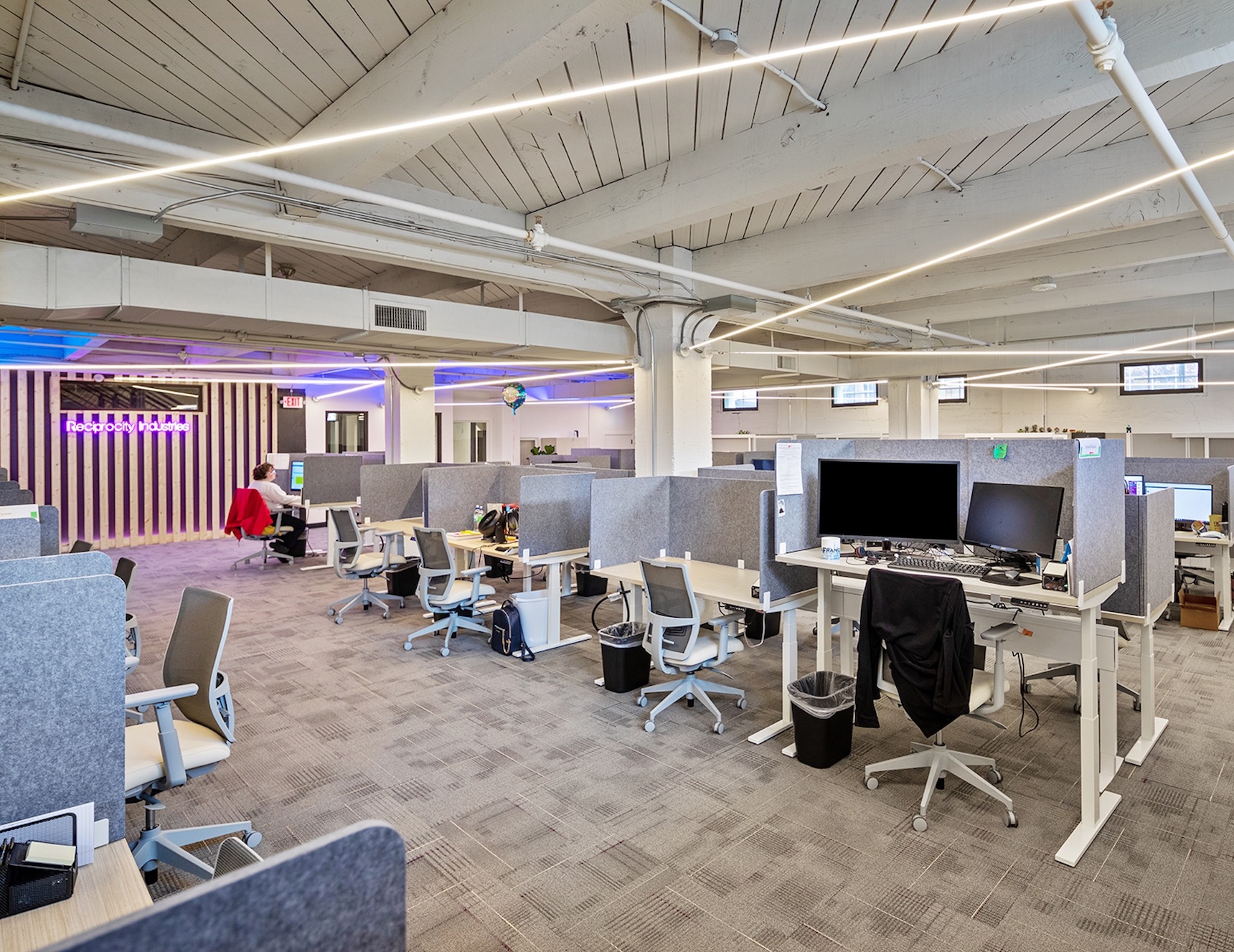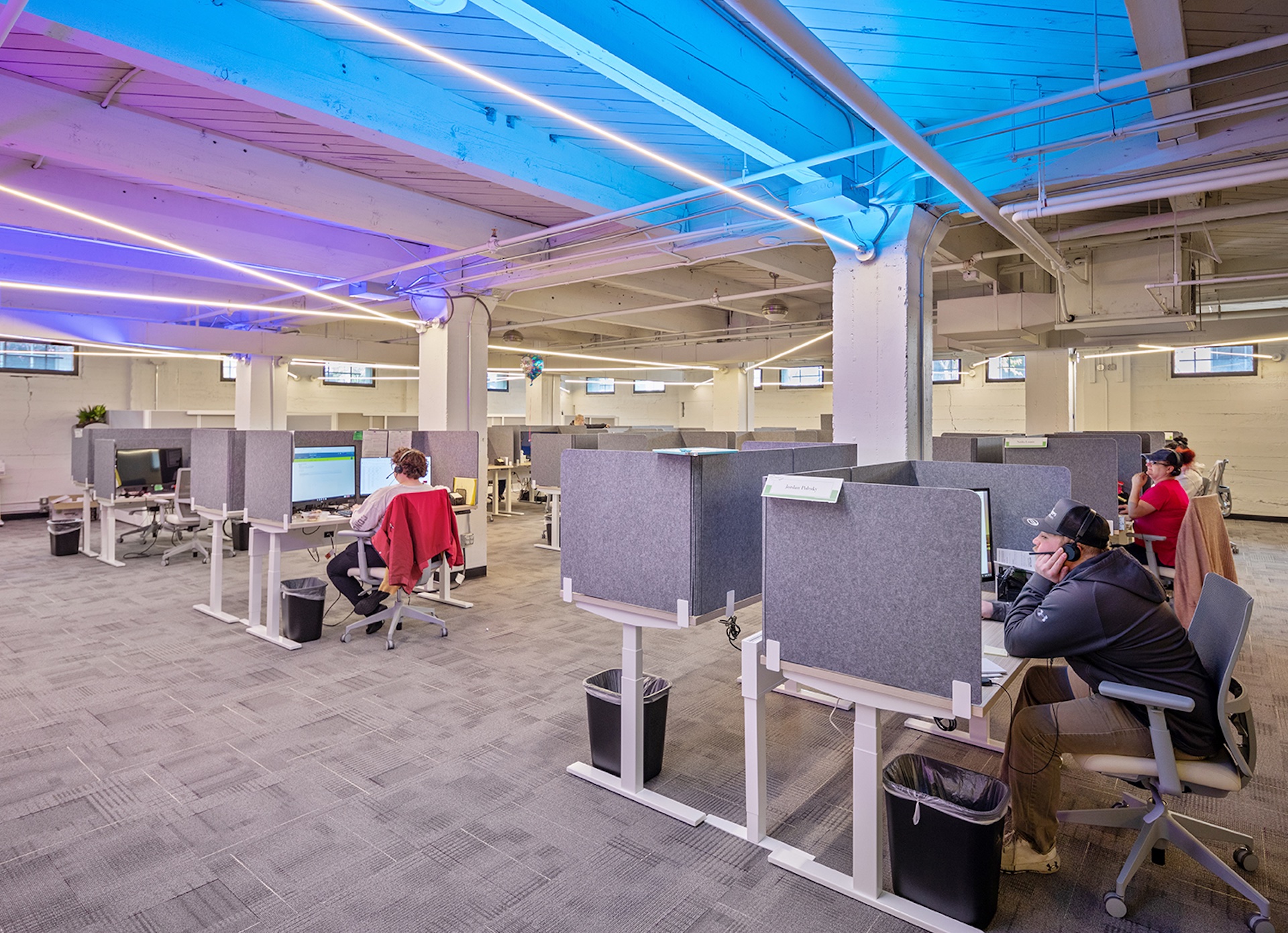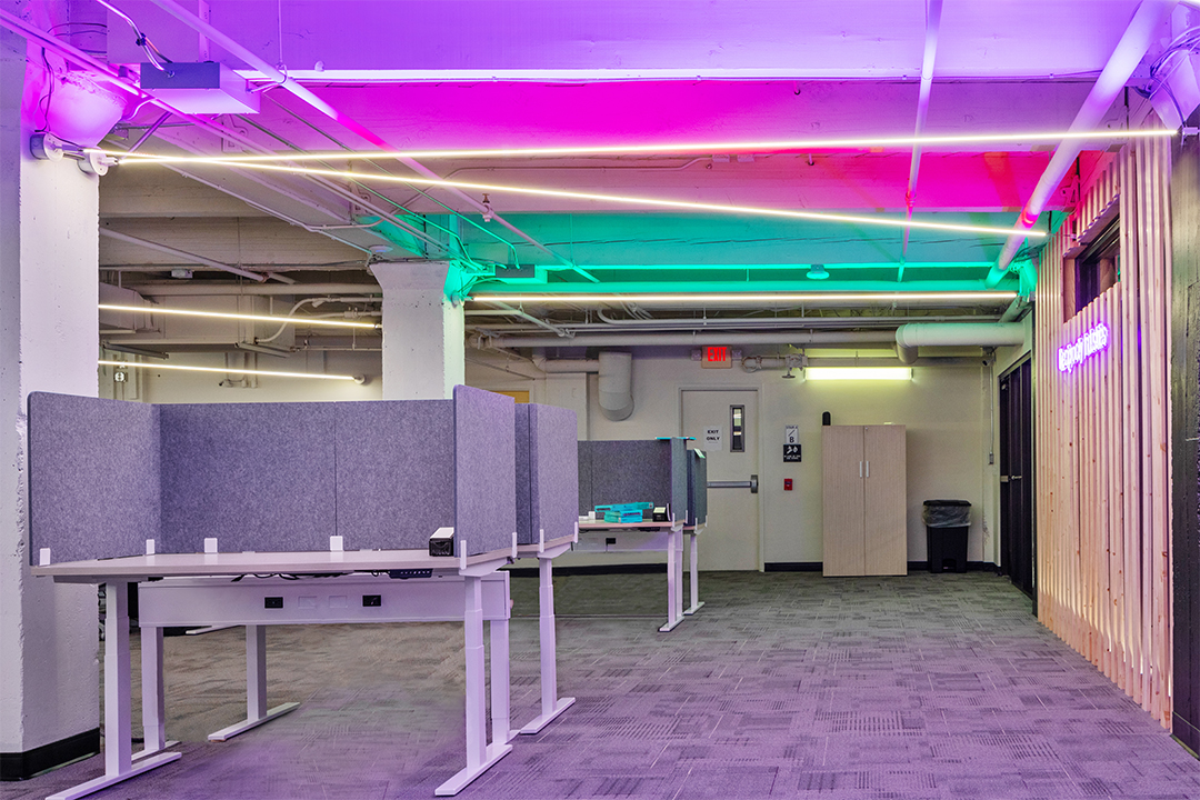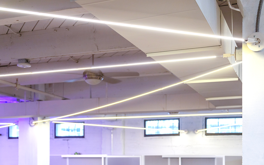 This project was an office space renovation. The lighting designer, Lauri Patterson of One Source Lighting - Billings, had a client that moved into the basement of an old building that was built in 1910 as a warehouse. It then has been renovated at times over the years and the basement most recently was a workout facility. Her clients were looking to expand their software business into this new office space. The aesthetic they wanted was cutting edge, modern, and unique. They also wanted to convey their culture and atmosphere using architectural lighting. Lauri had existing duct work and vents to work around and needed lighting that could easily do that. She selected Lazer Line Suspension for its unique uplight/downlight ability, with both being separately controlled. Lazer Line Suspension could also mount beneath the existing ceiling structures and span from wall-to-wall, up to 60 ft. before refeeding, illuminating the work space with no visible diodes. The downlight is a functional static white light, 3000k, while the uplight on some of the Lazer Line's are a unique and vibrant color-changing RGB. Lazer Line is a patented LED lighting system that creates a paradigm shift with how we use lighting and design within the environment. It utilizes heatsink tape which is fastened and tightened by turnbuckles plastered into the wall or ceiling for a seamless look. It enhances any space with pleasant soft light and delivers designer quality color rendering and multiple color temperatures, including warm dim and tunable white, creating a space that is visually spectacular.