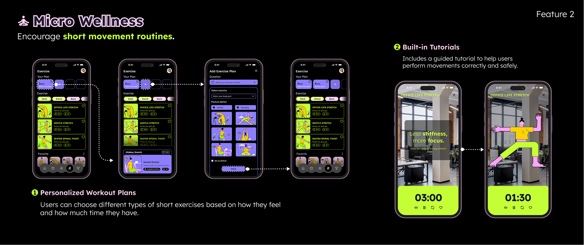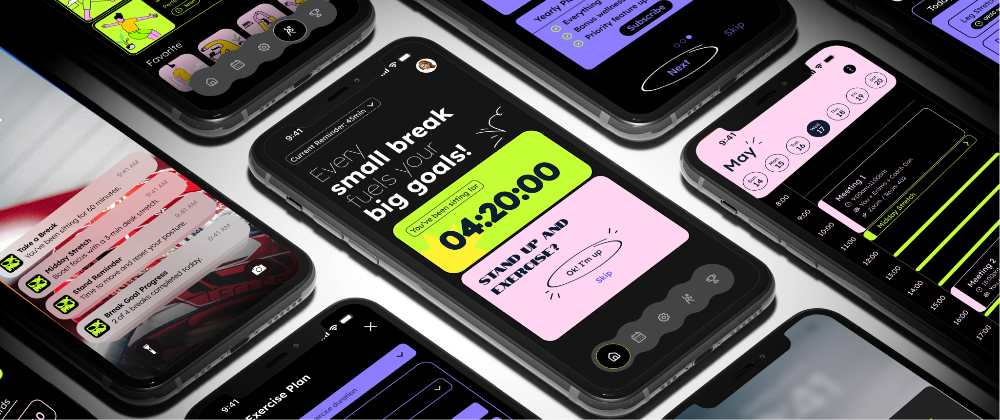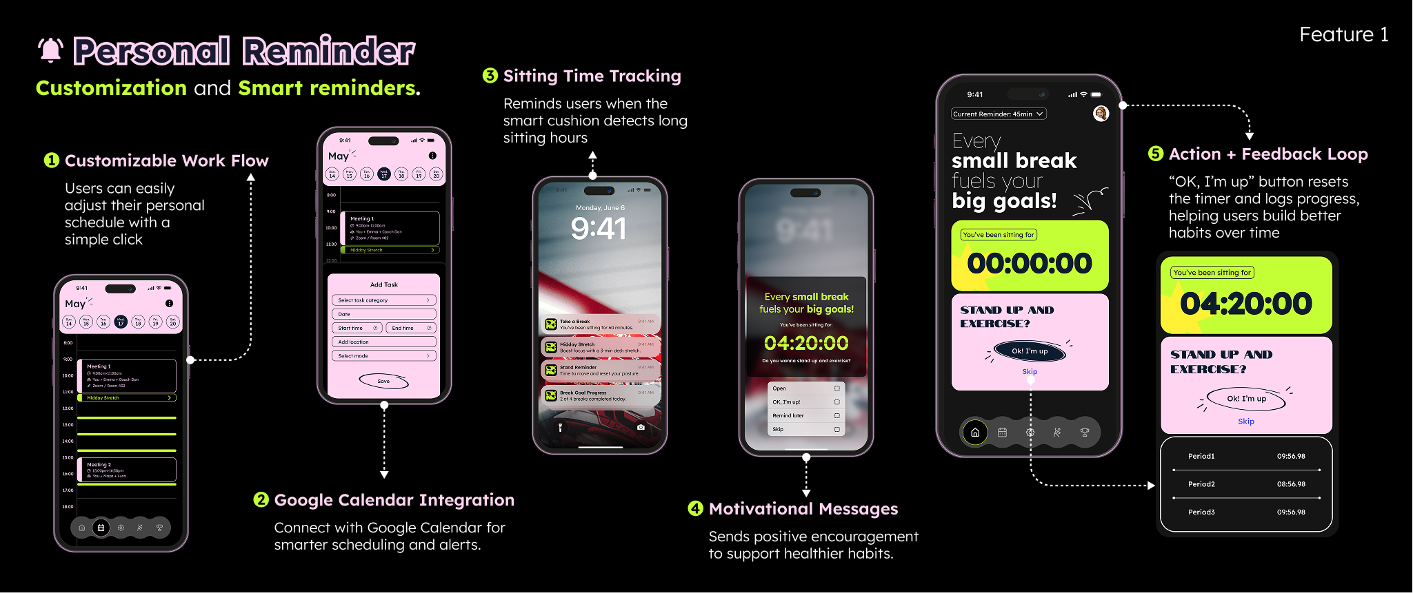 "OK, I’m Up" is an office wellness app paired with a smart cushion that tracks sitting time and syncs with Google Calendar to deliver well-timed reminders. After each reminder, users are guided through quick, desk-friendly micro workouts. Designed for Gen Z, this system builds healthy habits to cut pain and boost productivity.