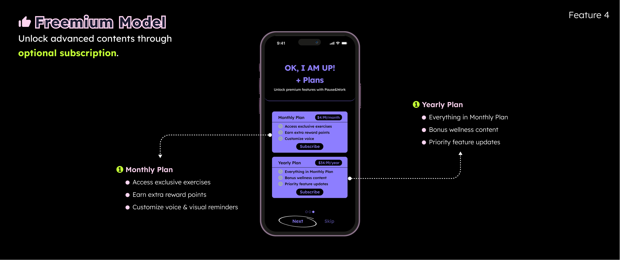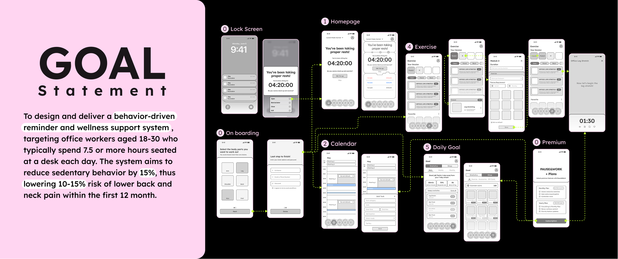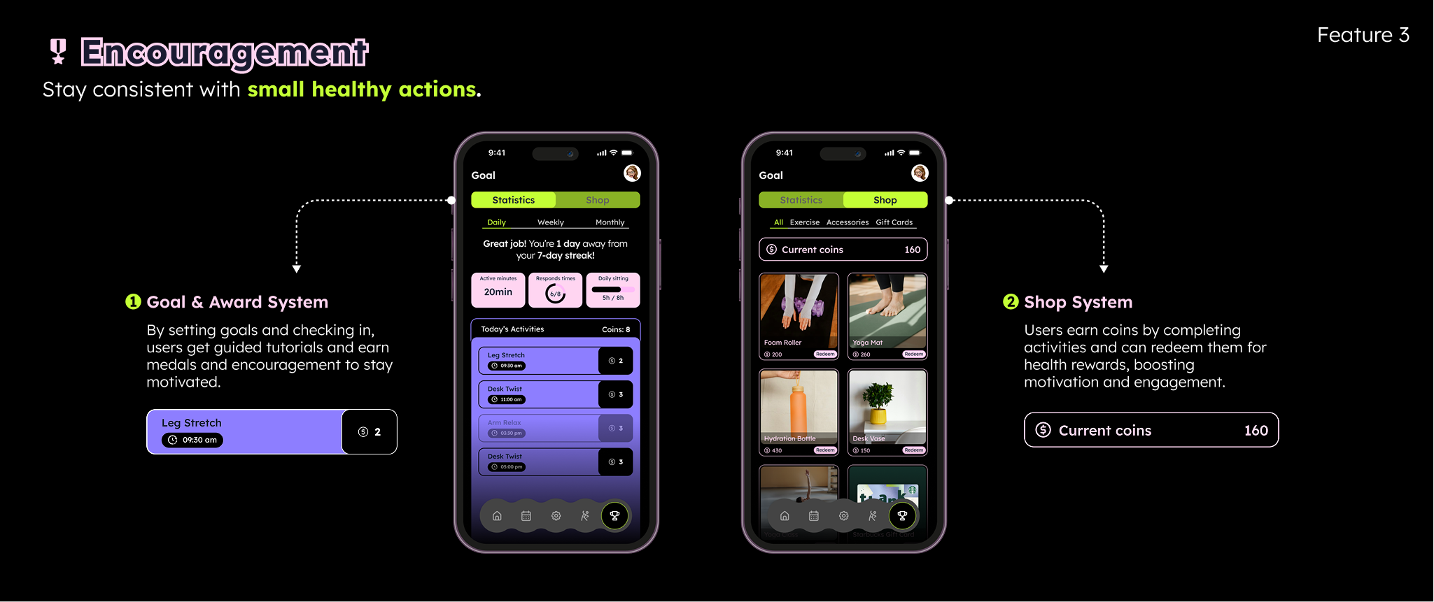 "OK, I’m Up" is an office wellness app paired with a smart cushion that tracks sitting time and syncs with Google Calendar to deliver well-timed reminders. After each reminder, users are guided through quick, desk-friendly micro workouts. Designed for Gen Z, this system builds healthy habits to cut pain and boost productivity.