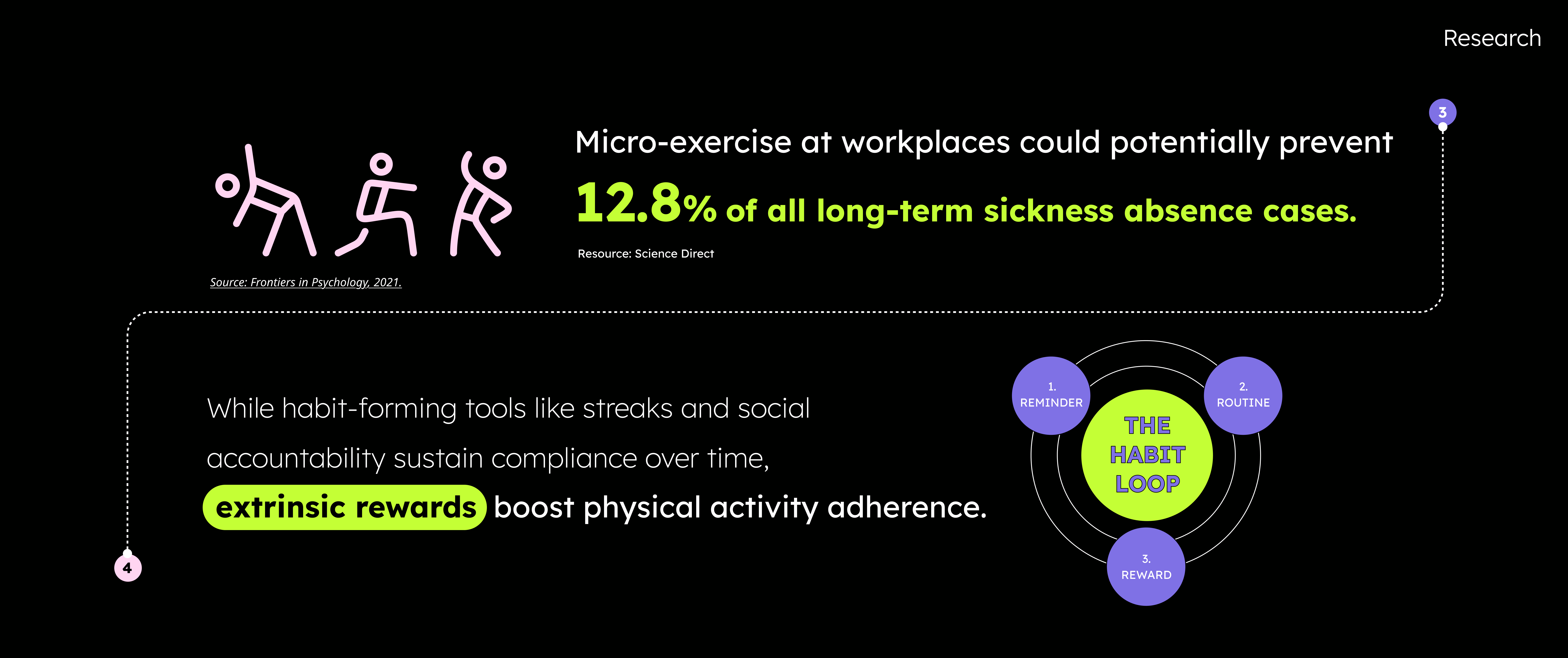 Workers sit an average of 7.5 hours a day, with 80% suffering from back and neck pain. Gen Z employees are especially affected, often losing productivity through sick days. Current solutions often interrupt meetings or focus time, leading users to abandon them.