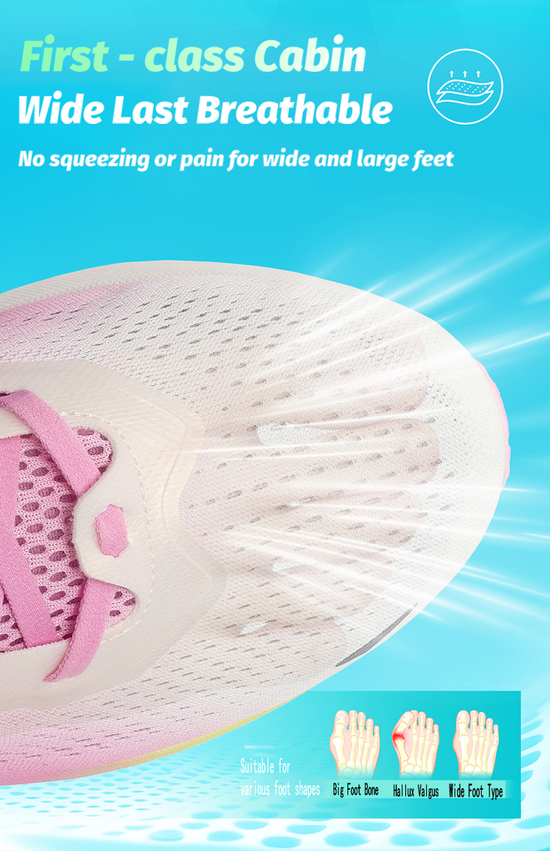 Double Ventilation for Freshness: lightweight mesh upper + funnel-shaped insole, providing dual ventilation to prevent foot stuffiness.
