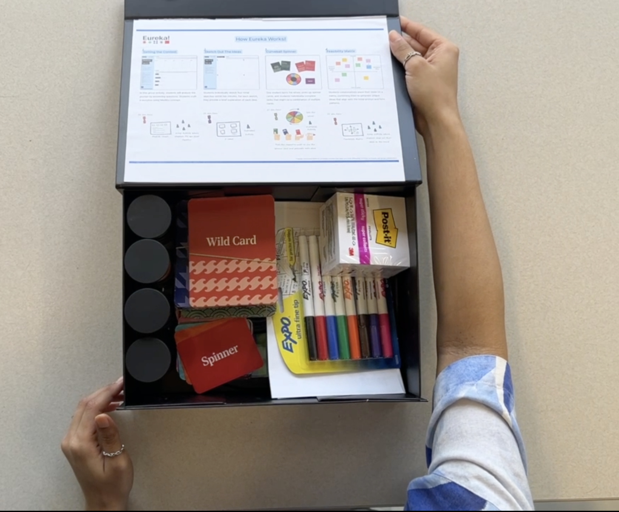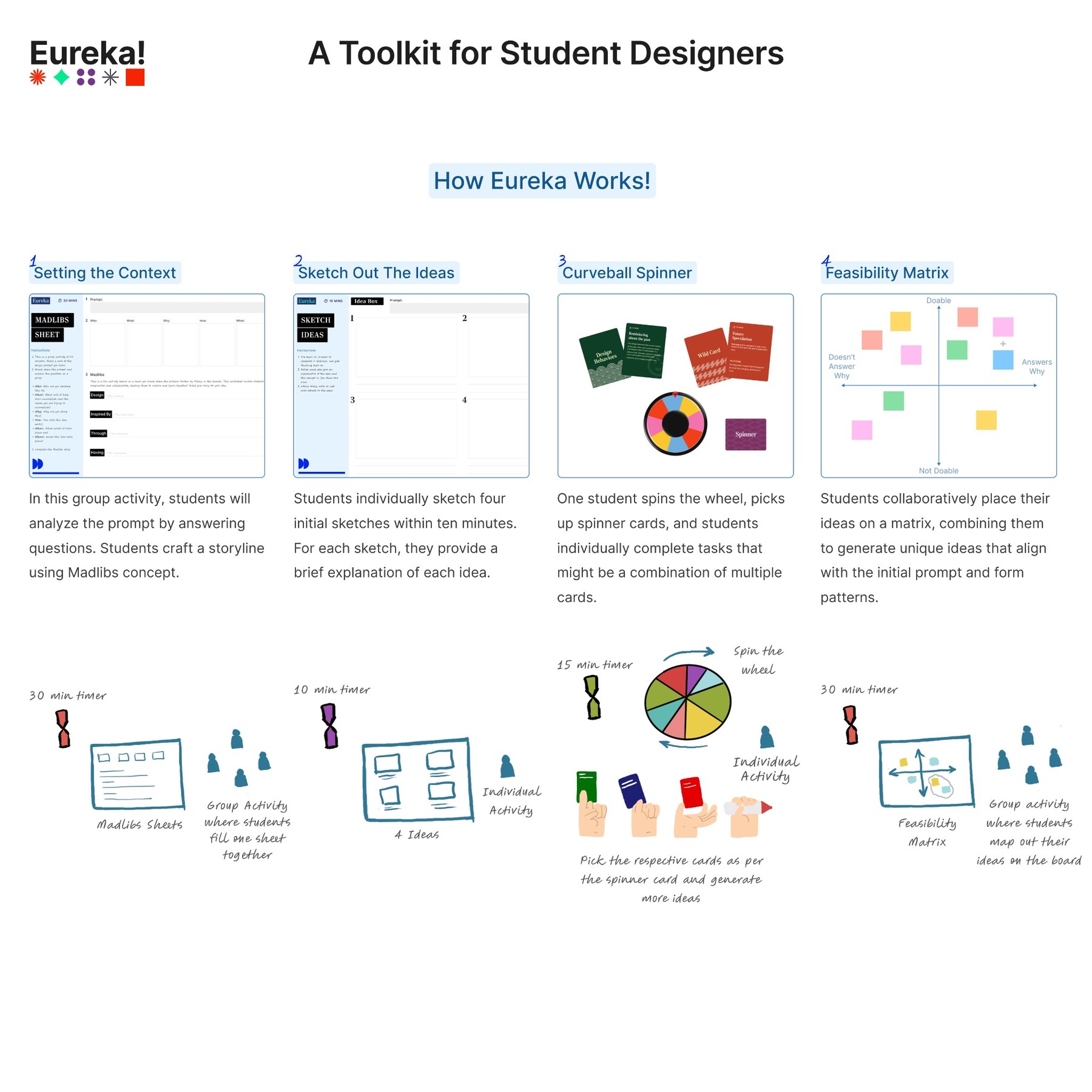 Eureka is a creative toolkit made for student designers to make idea generation fun, hands-on, and collaborative. It helps students move past creative blocks and turn brainstorming into an enjoyable experience where they can explore, sketch, and imagine freely.