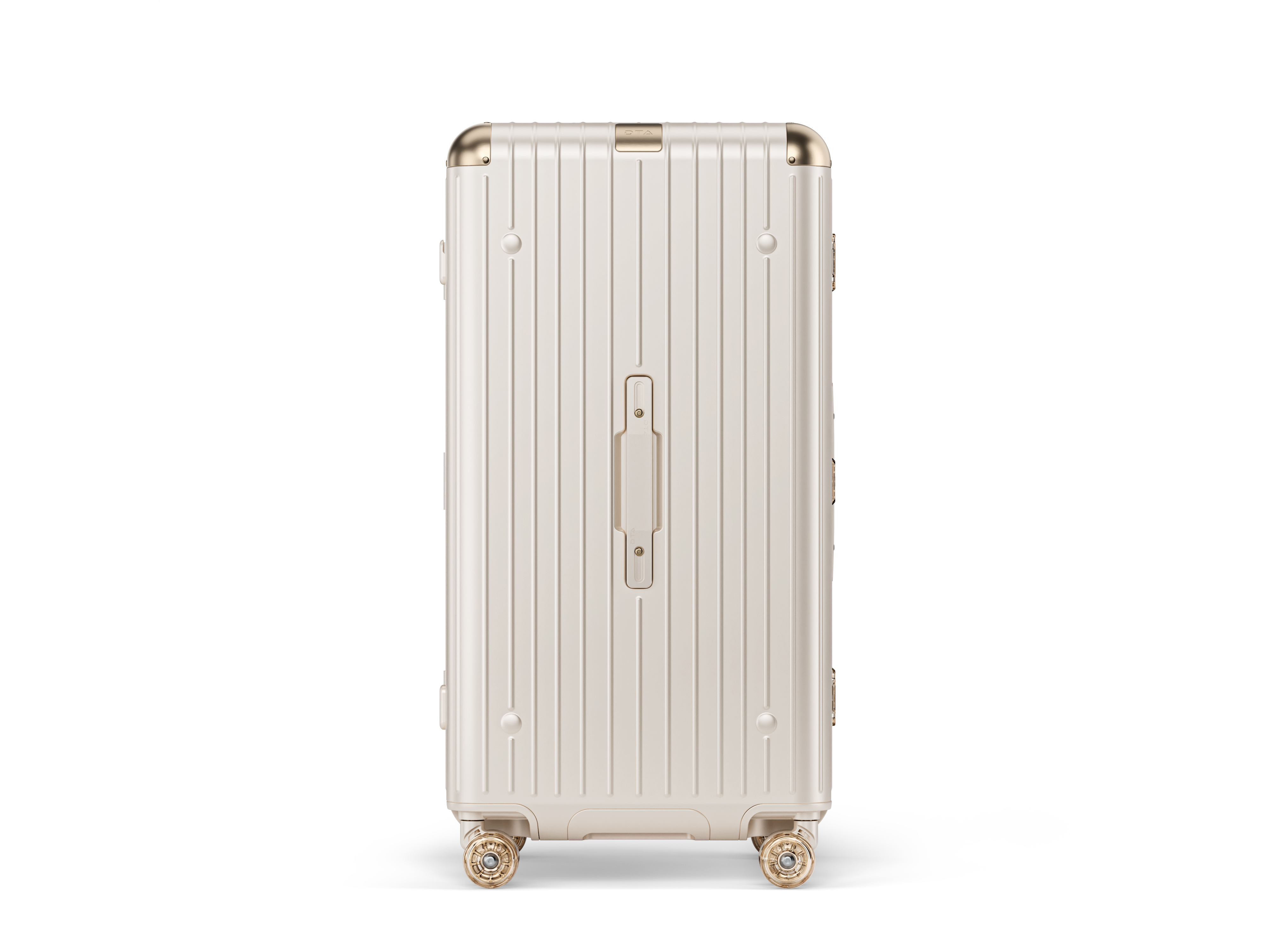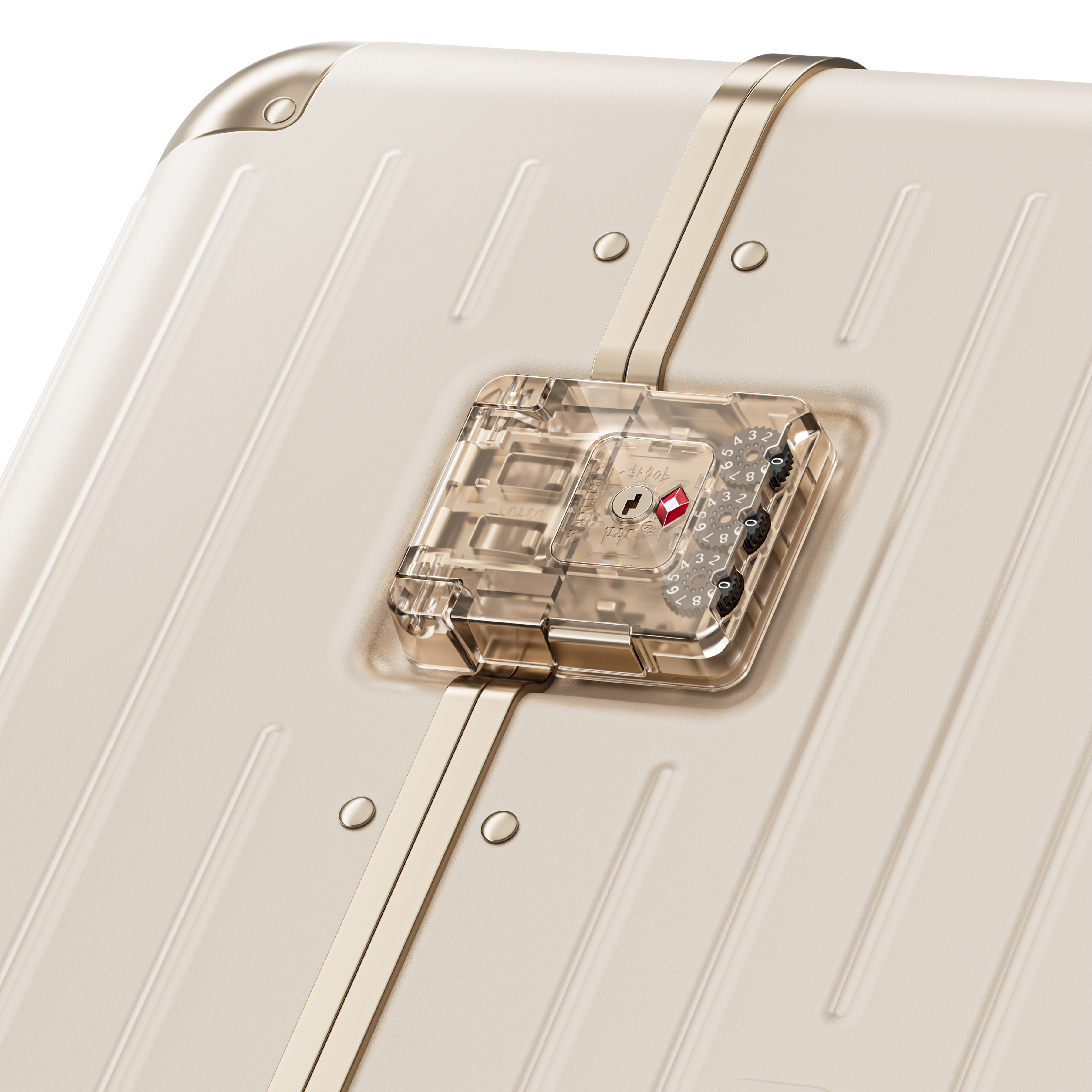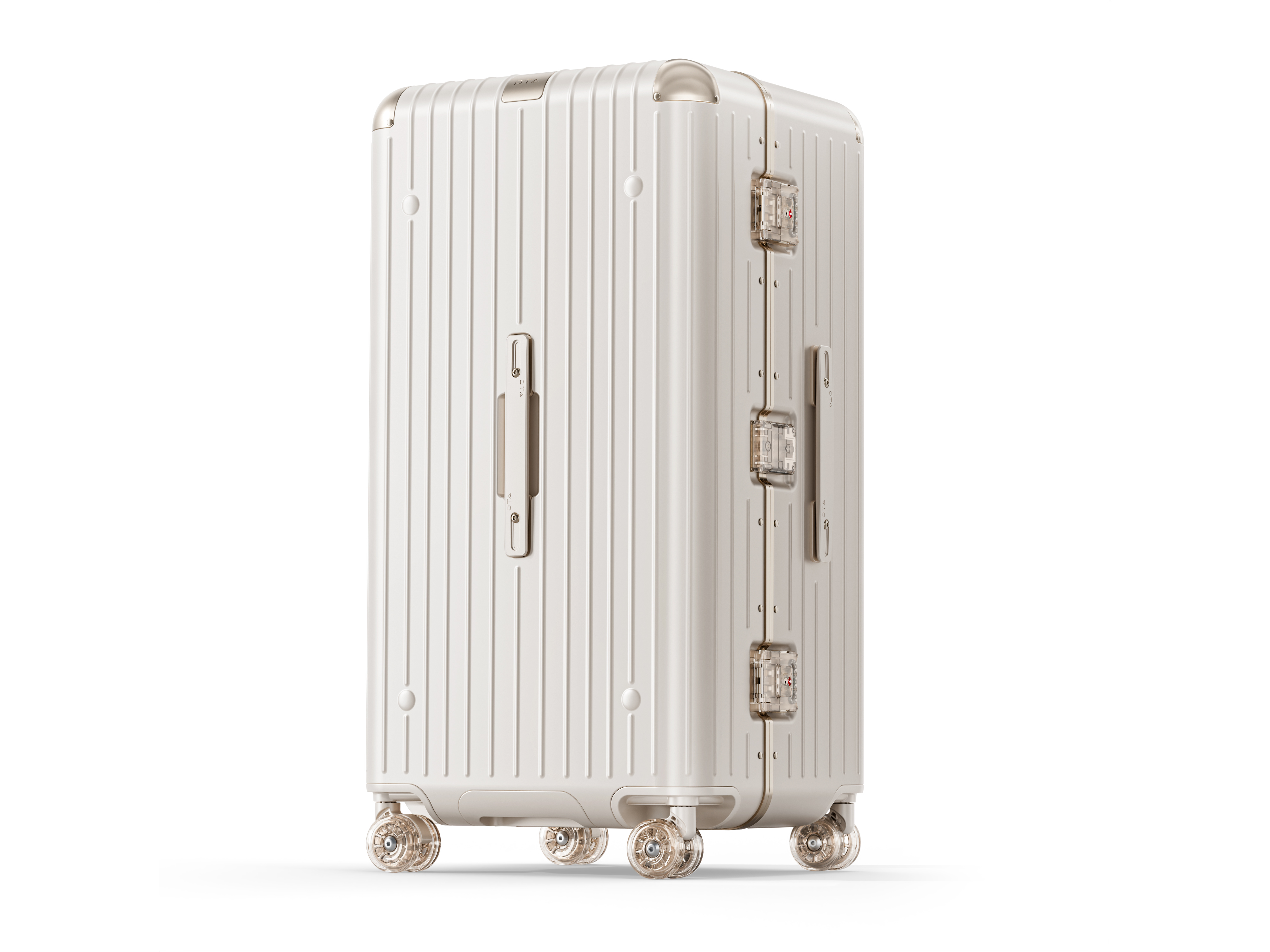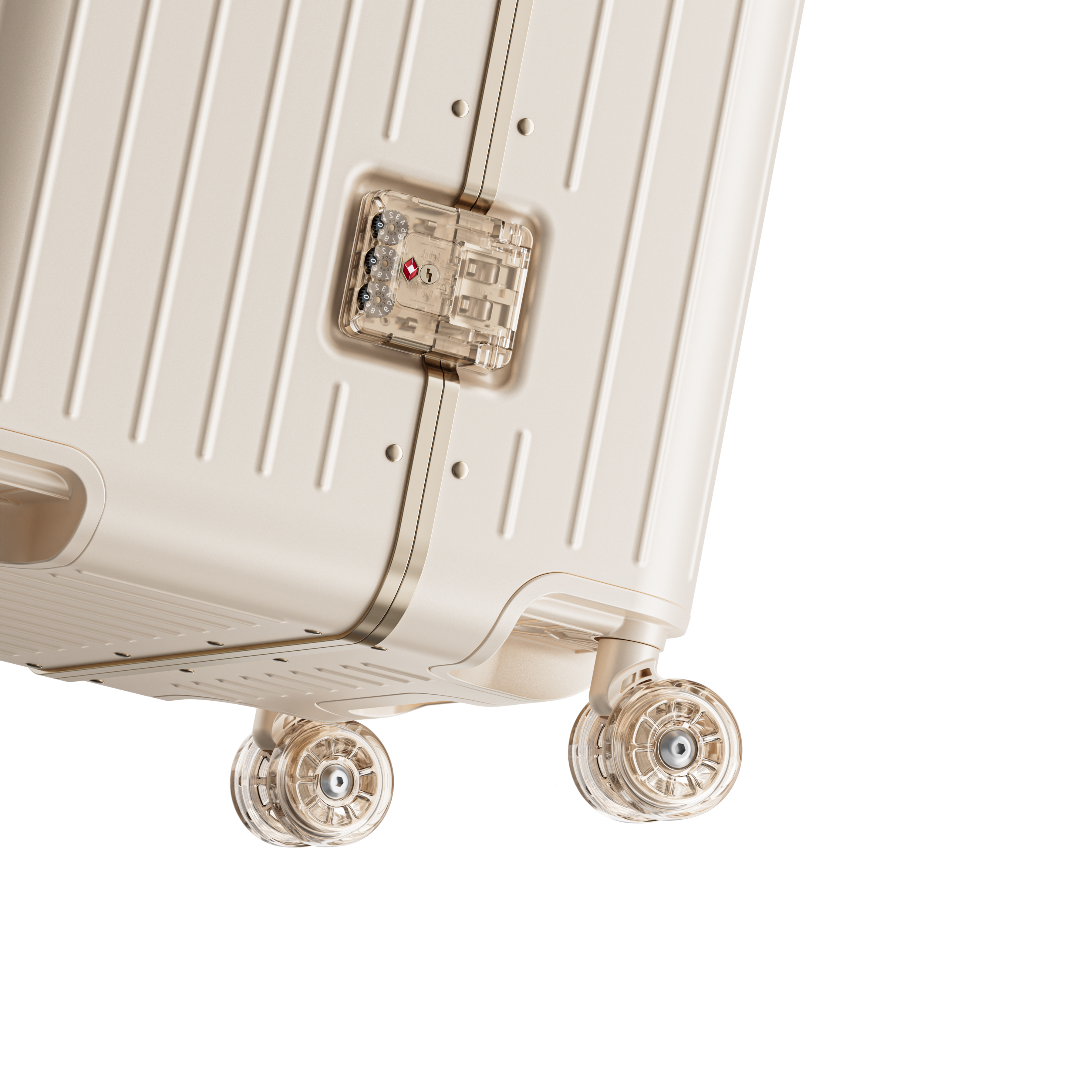 Visually, the design follows the principles of “functional-driven design” and “orderly aesthetics.” With clean vertical stripes as the main visual element, it reflects structural strength while shaping a slim silhouette that conveys a sense of rational elegance. Classic neutral tones are enhanced with tinted transparent and metallic accents, creating rich visual layers. The sturdy aluminum frame, high-tech transparent locks, and smooth PU wheels work together to deliver the dual promise of “strong protection” and “smooth mobility.”
