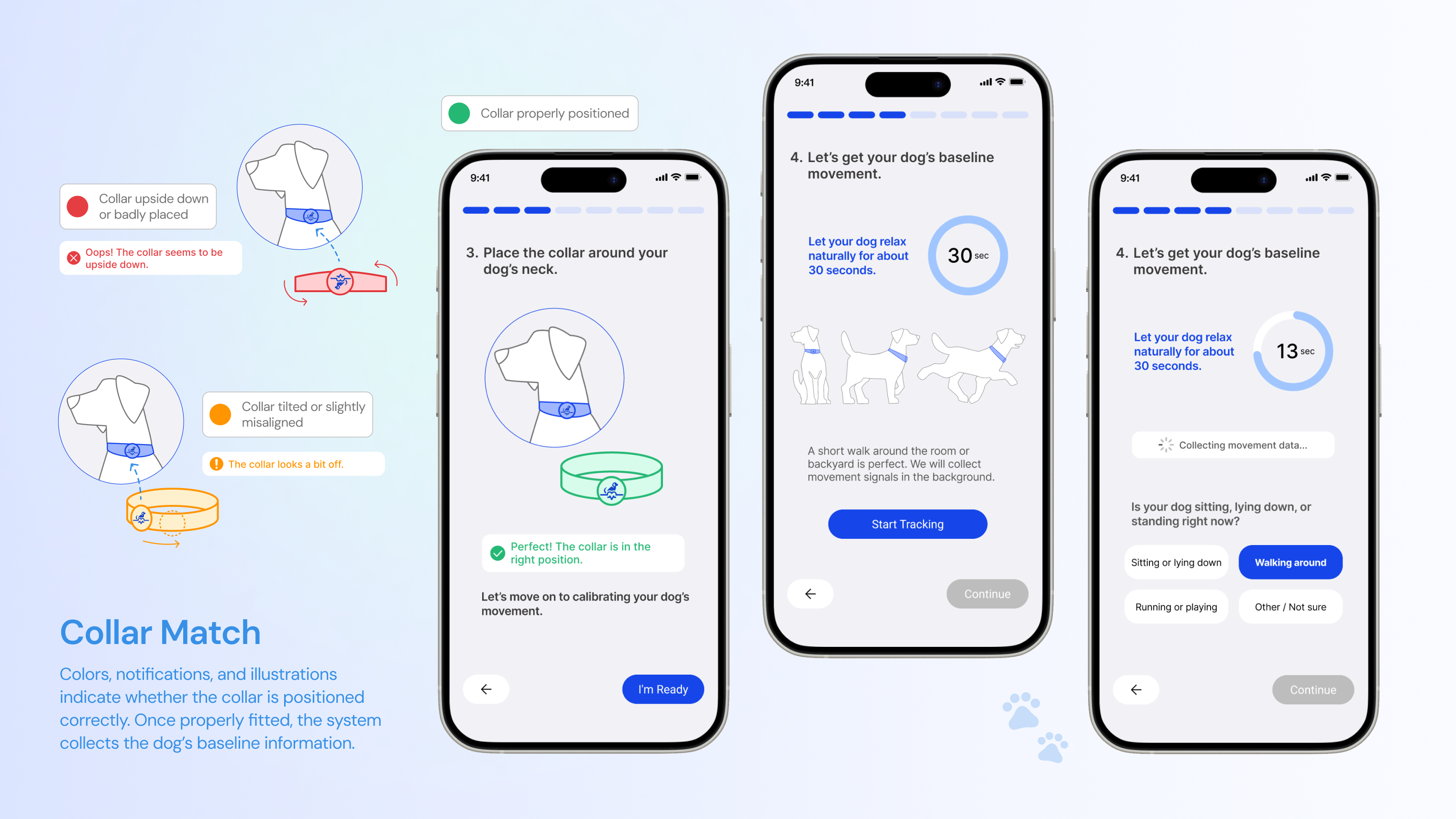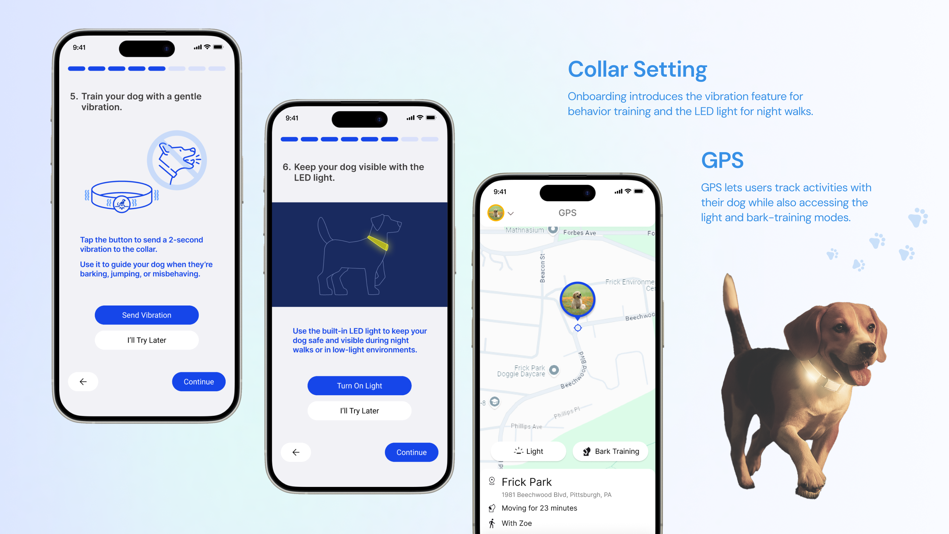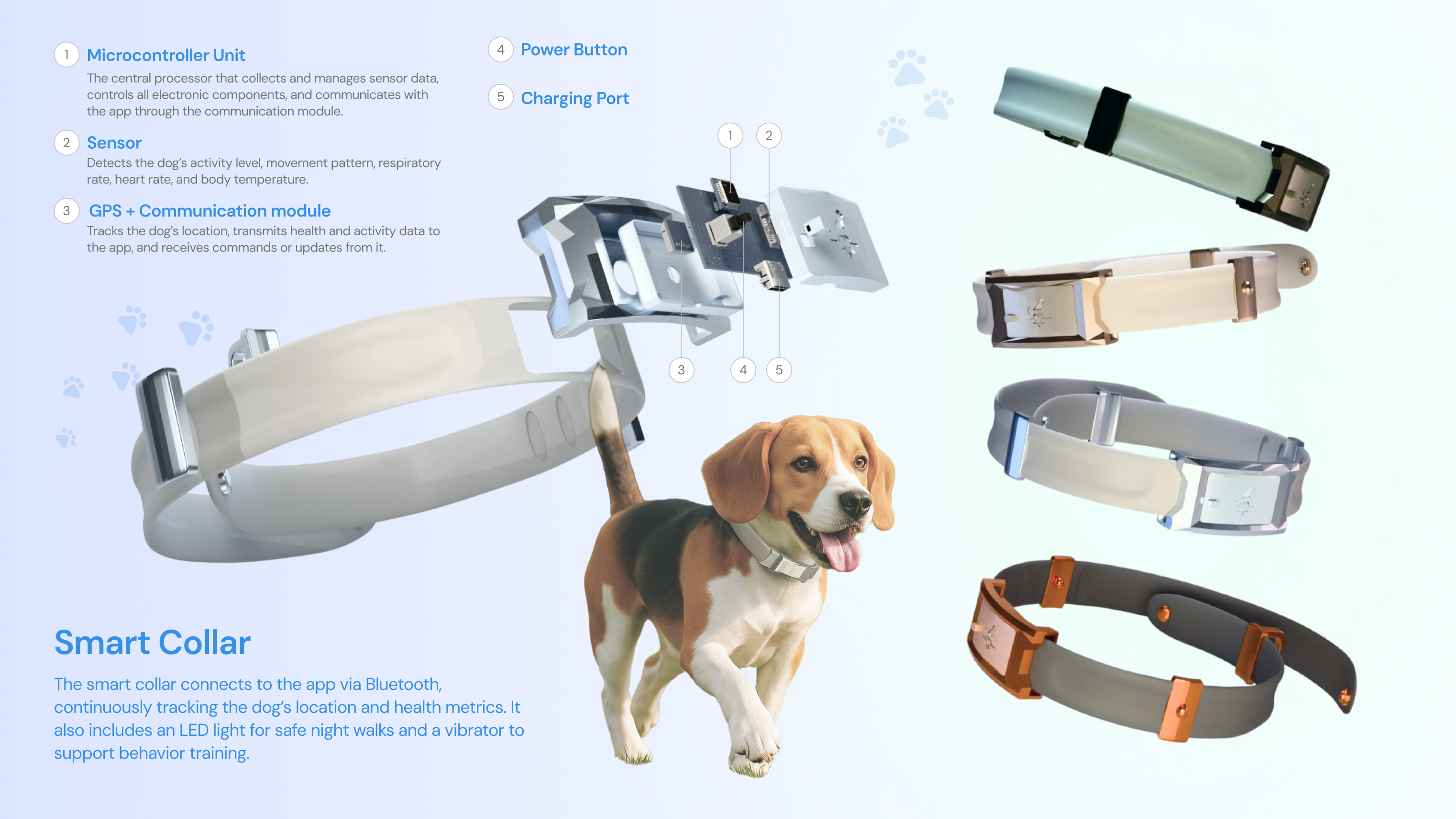 The smart collar extends the app’s capability by collecting physiological data, tracking location, and offering practical features like LED lighting for night walks and vibration-based training mode to correct unwanted behaviors.