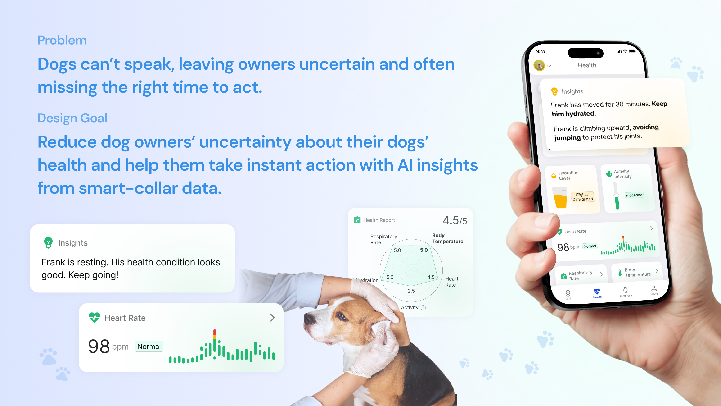 - Health Monitor Dashboard: Tracks vital signs in real time and flags abnormal readings, helping owners spot potential issues early. AI-generated insights evaluate the dog’s condition and alert users when immediate action is needed.