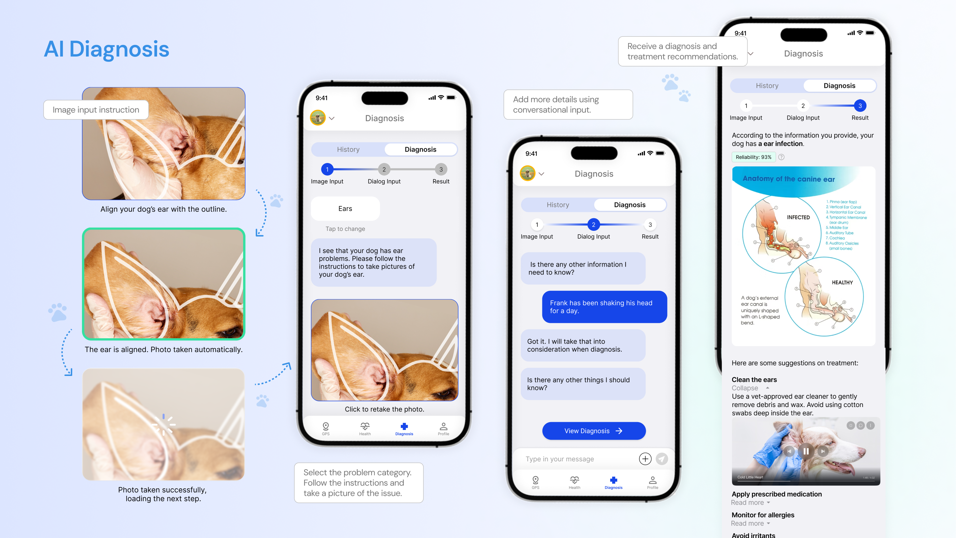 - AI Diagnosis: Guides users through selecting a symptom category, uploading images, and describing issues in natural language. The system then delivers likely diagnoses and treatment suggestions, helping owners make quick, informed decisions.