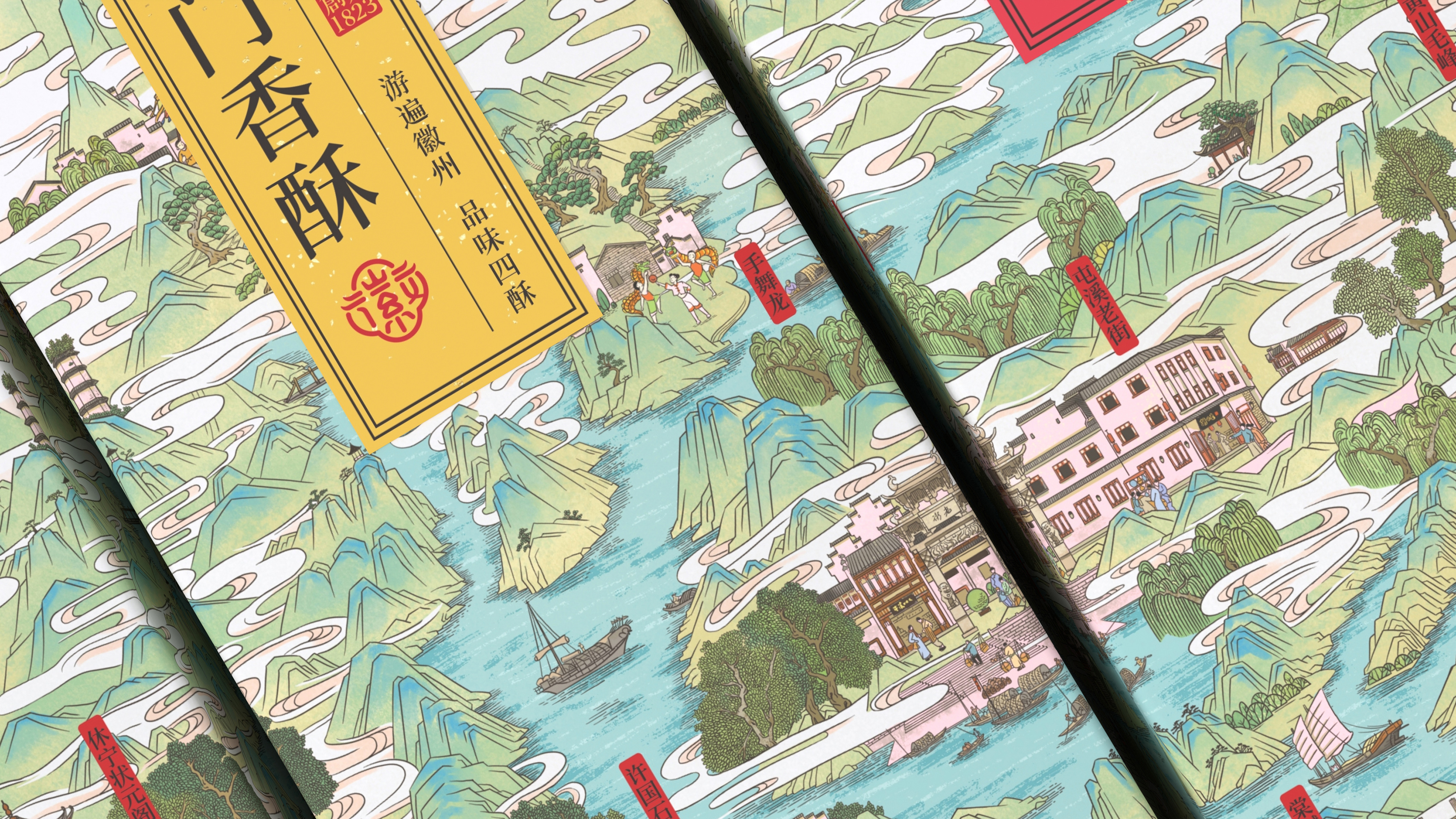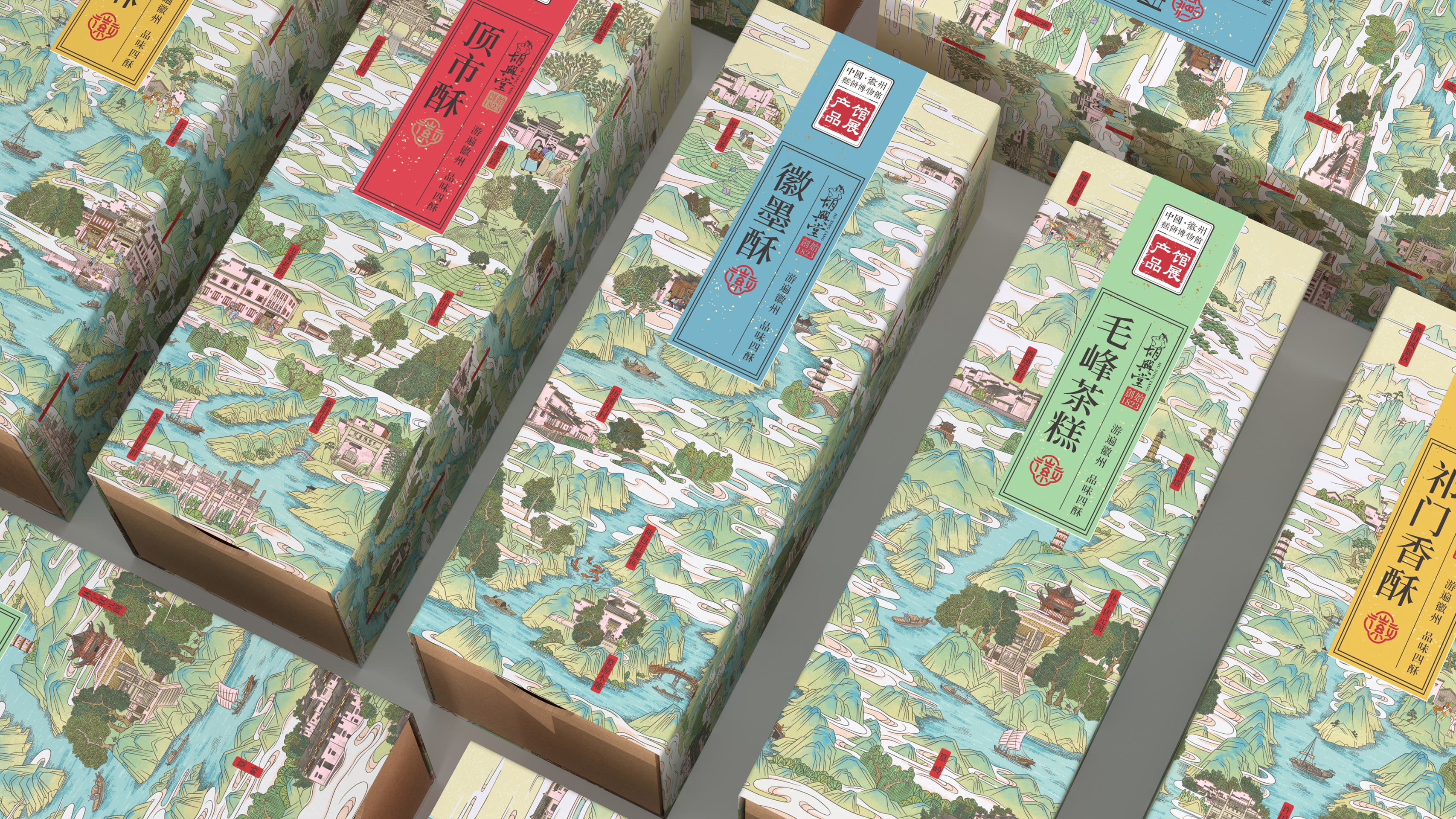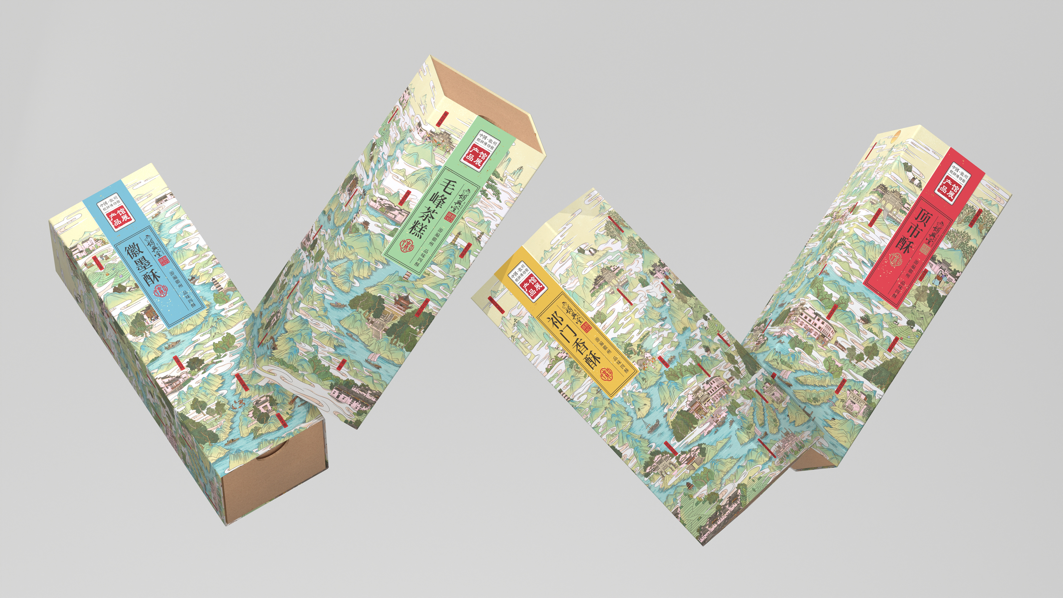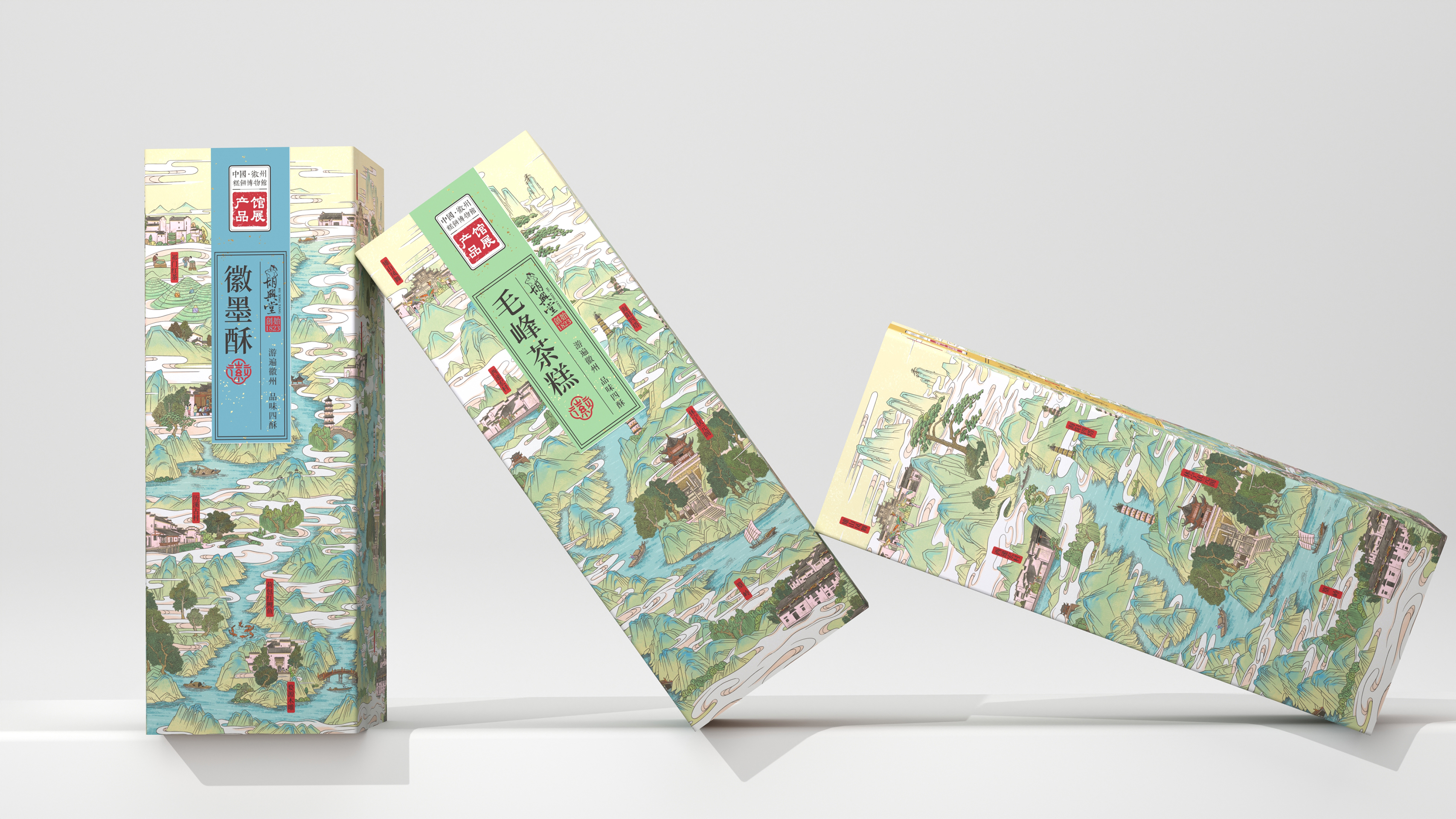 Huxingtang Series Packaging draws inspiration from the culture of Huizhou, Anhui Province, China. It delves deeply into the region's unique local traits and aesthetic connotations, creating a set of specialty food packaging products that combines profound cultural depth with modern visual expression. This packaging transforms the Huizhou map into a set of visual scrolls with a stepped, bird's-eye view, which serve as a unified design element for the series of packaging. Landmarks, local products and customs are also marked on the map. The moment users come into contact with the packaging, they are guided into a cultural journey through Huizhou—achieving a deep connection between the product and the region.