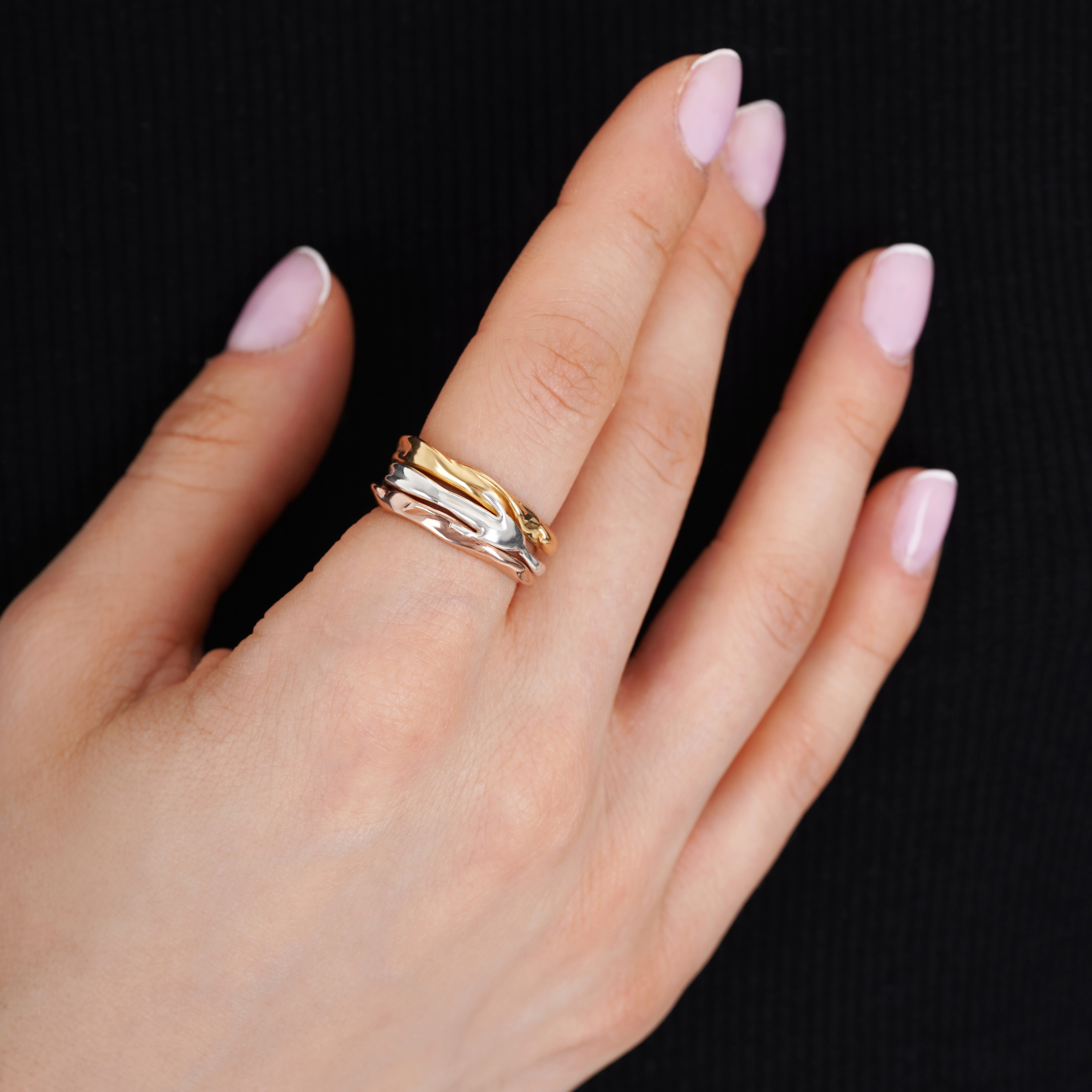 The Ring Set consists of three individual rings that can be worn separately, exchanged with friends, or combined in different alloys. The possibility of mixing silver, gold, and rose-gold-plated rings allows for limitless personalization, ensuring the rings complement various outfits and styles. Each ring is carefully designed with adaptability in mind, providing both comfort and versatility.