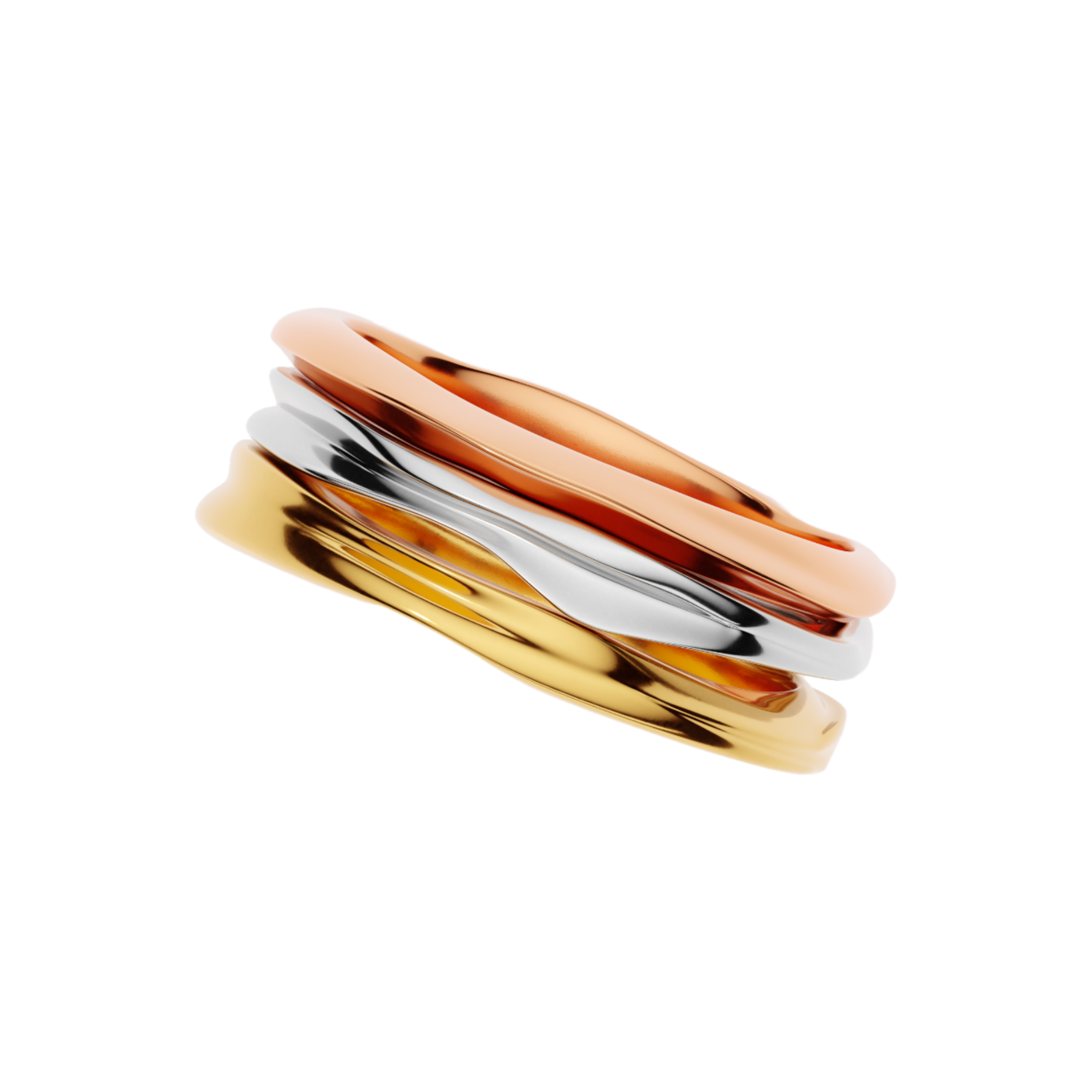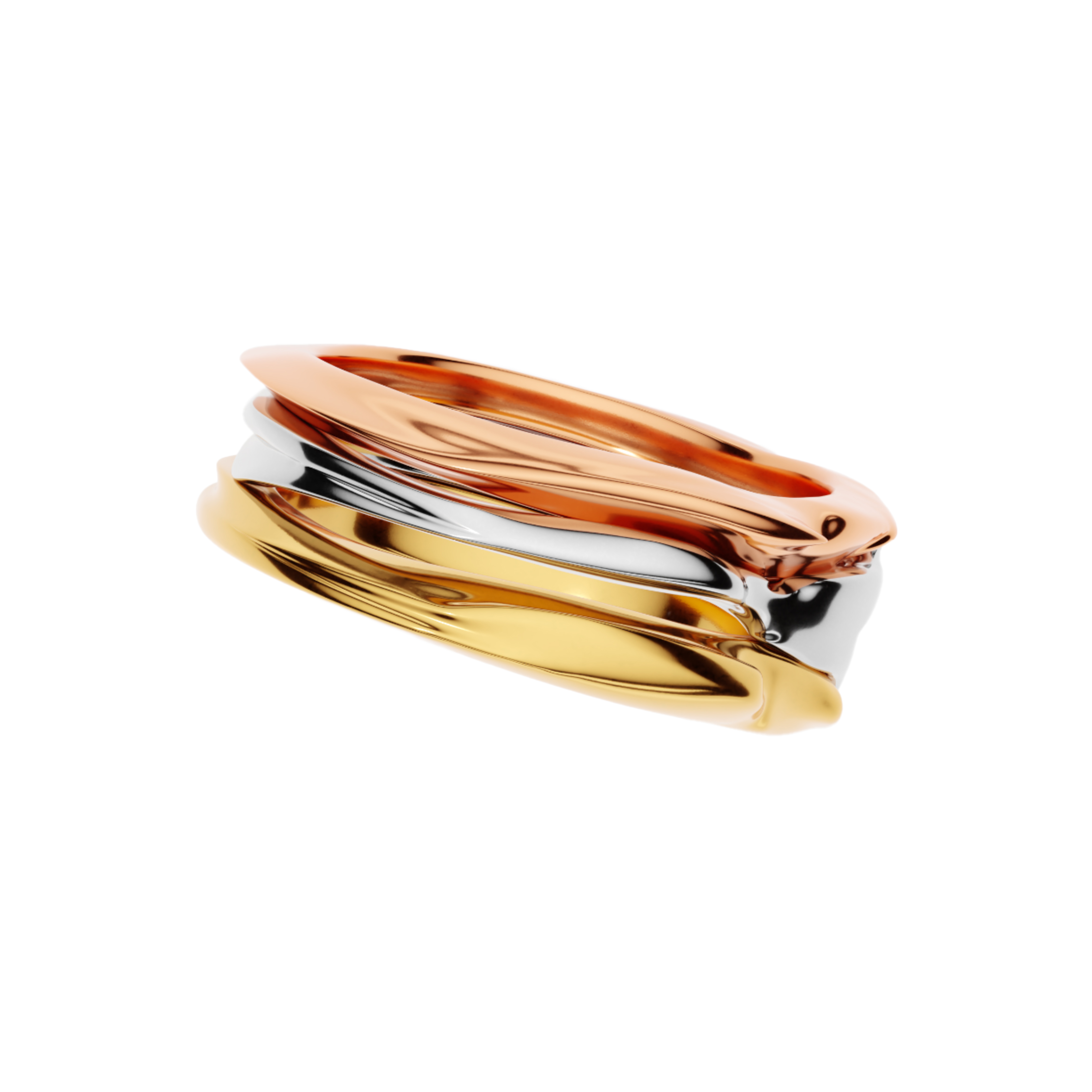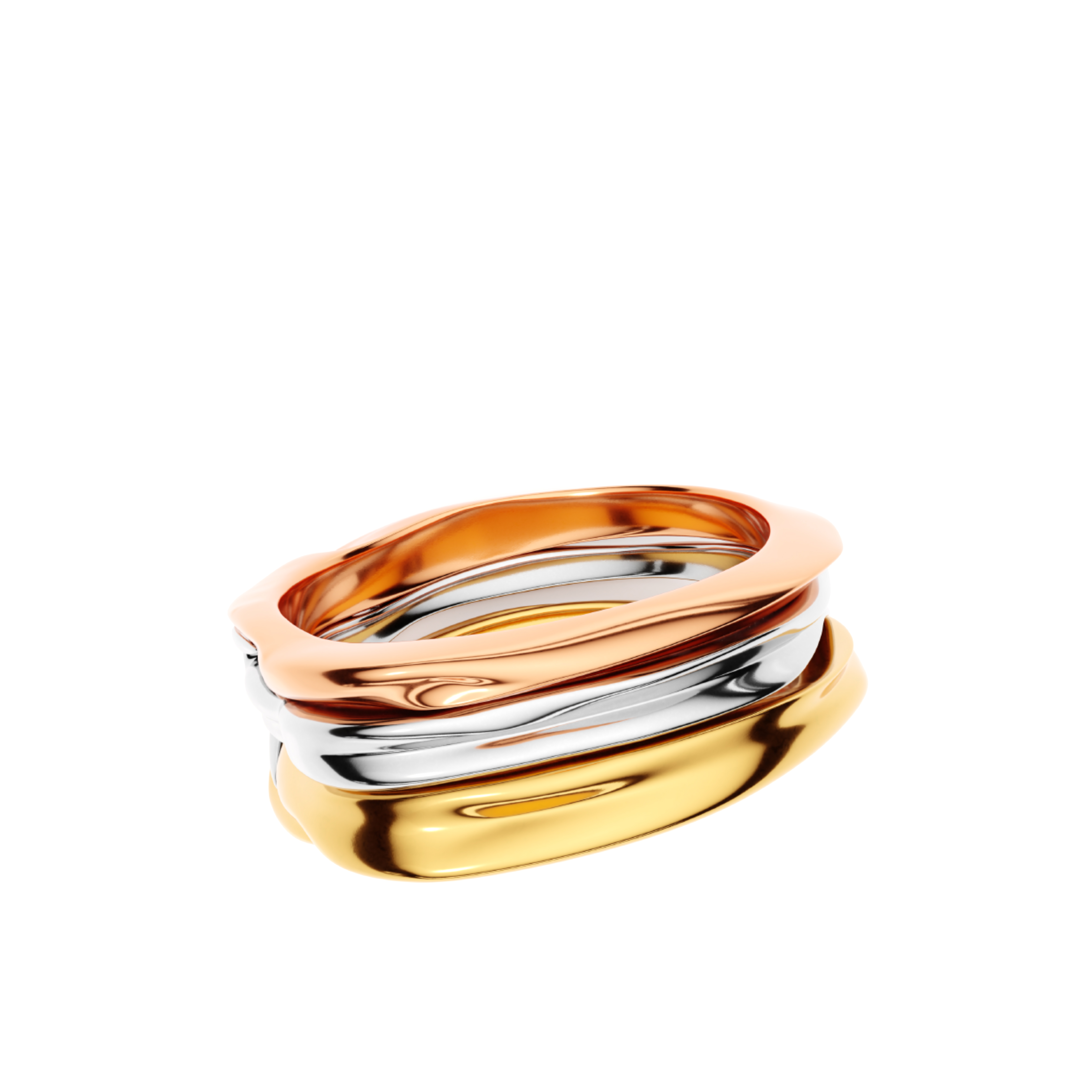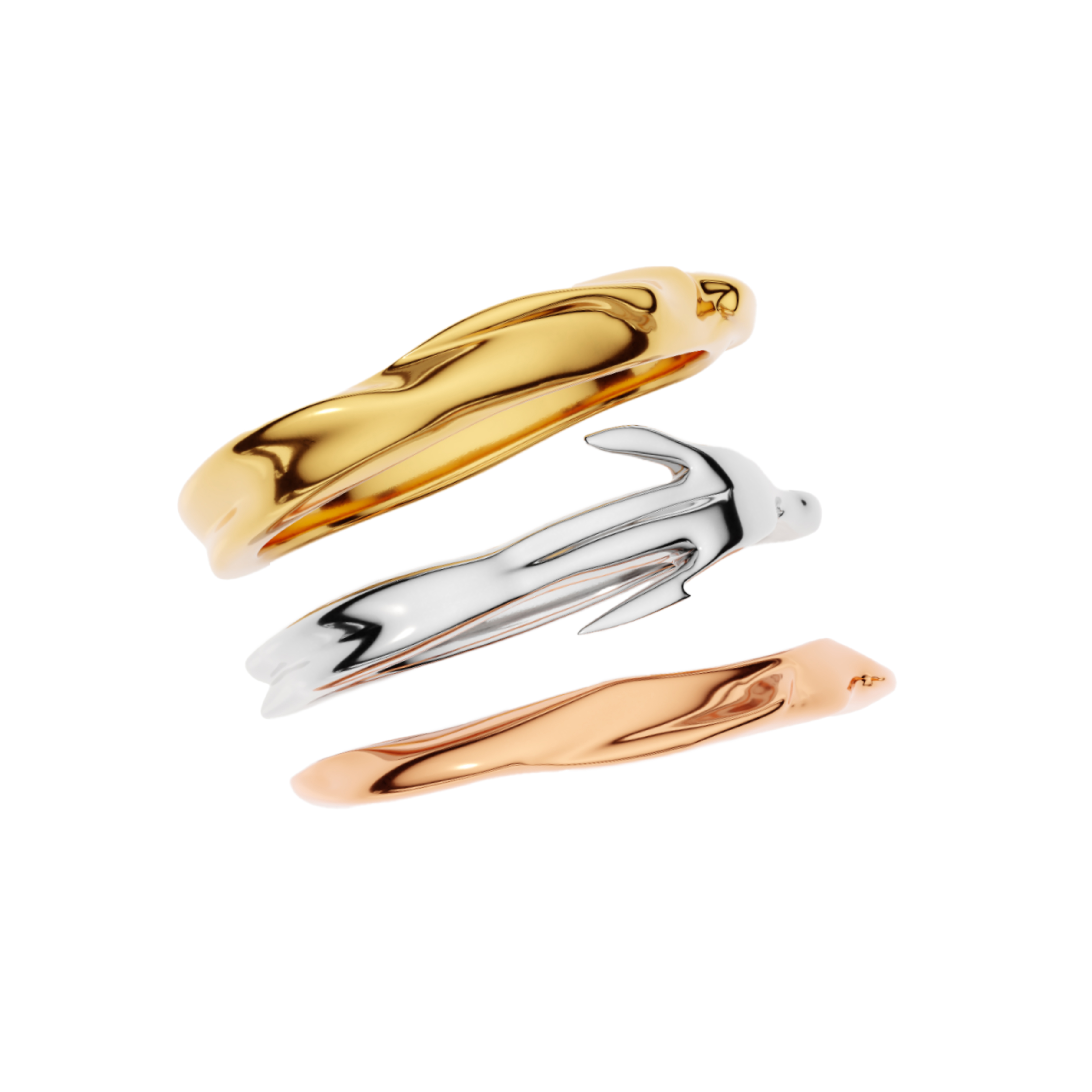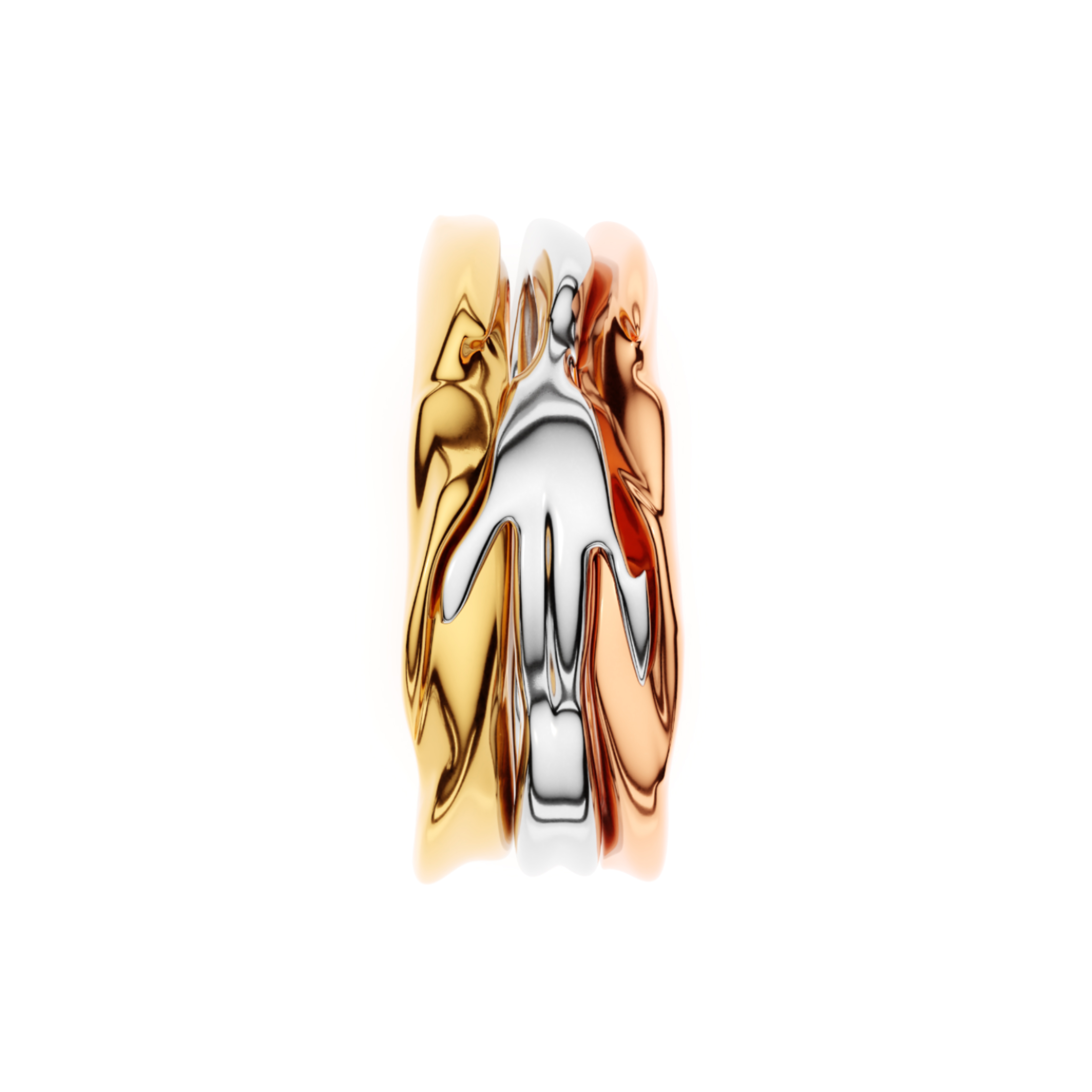 The middle ring overlaps the outer rings, creating an impression of connection while ensuring comfort. The slight spacing between the rings allows the skin to breathe and enhances wearability. One side of the assembled rings is intentionally made narrower to improve both comfort and aesthetic balance.