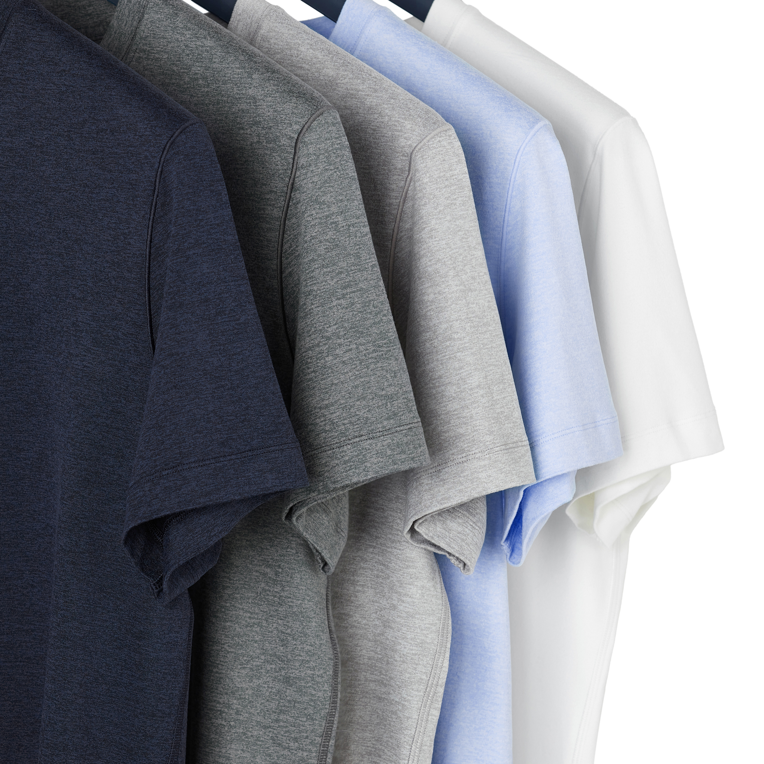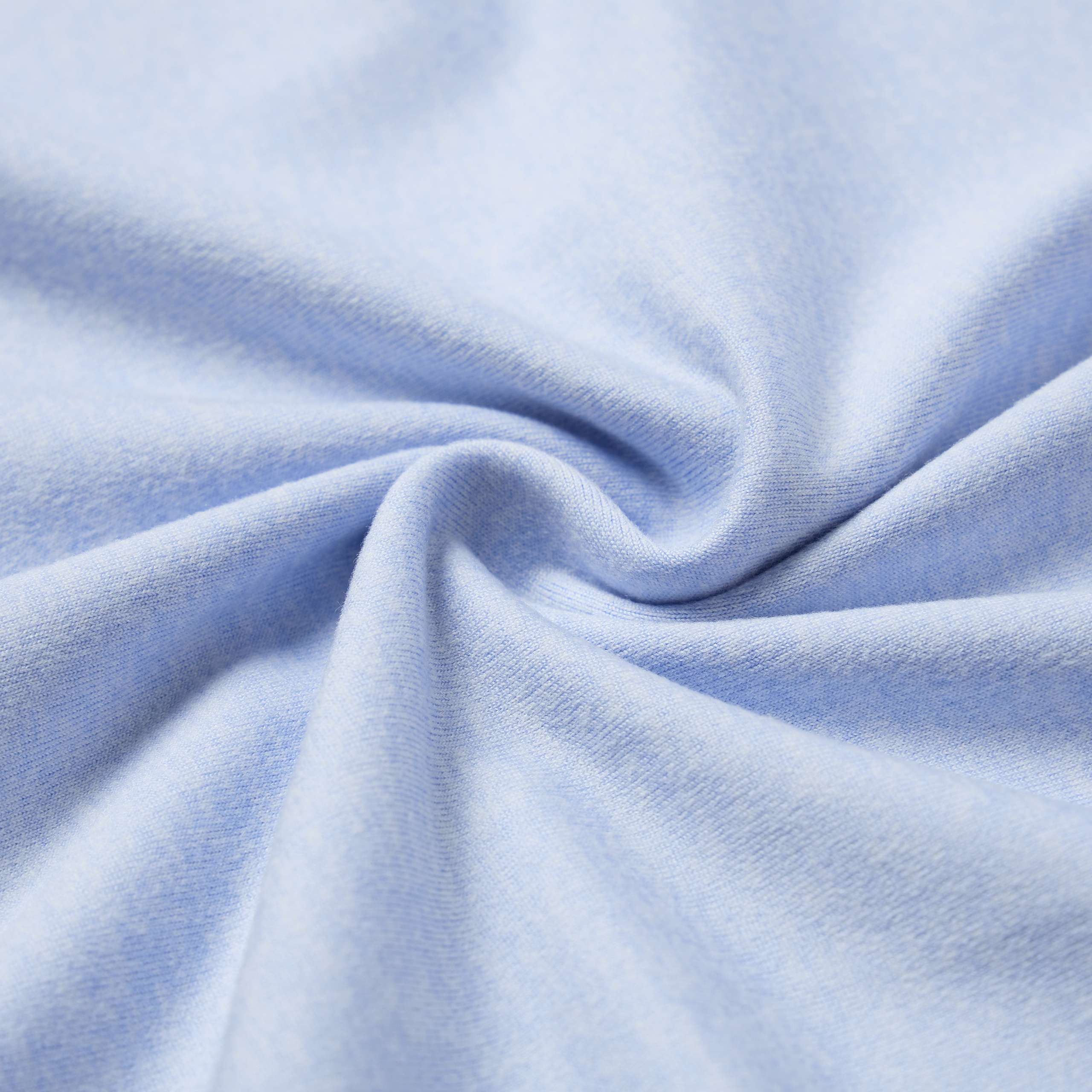 The fabric is made with tone-on-tone melange yarns, creating a soft gradient texture and matte finish. It introduces visual depth within a minimalist aesthetic. Though constructed with a single-knit structure, the fabric appears fuller and more dimensional thanks to the yarn-dyed process and subtle surface treatment. This delivers the comforting density of a double-knit, while maintaining the lightweight flexibility unique to single jerseys.