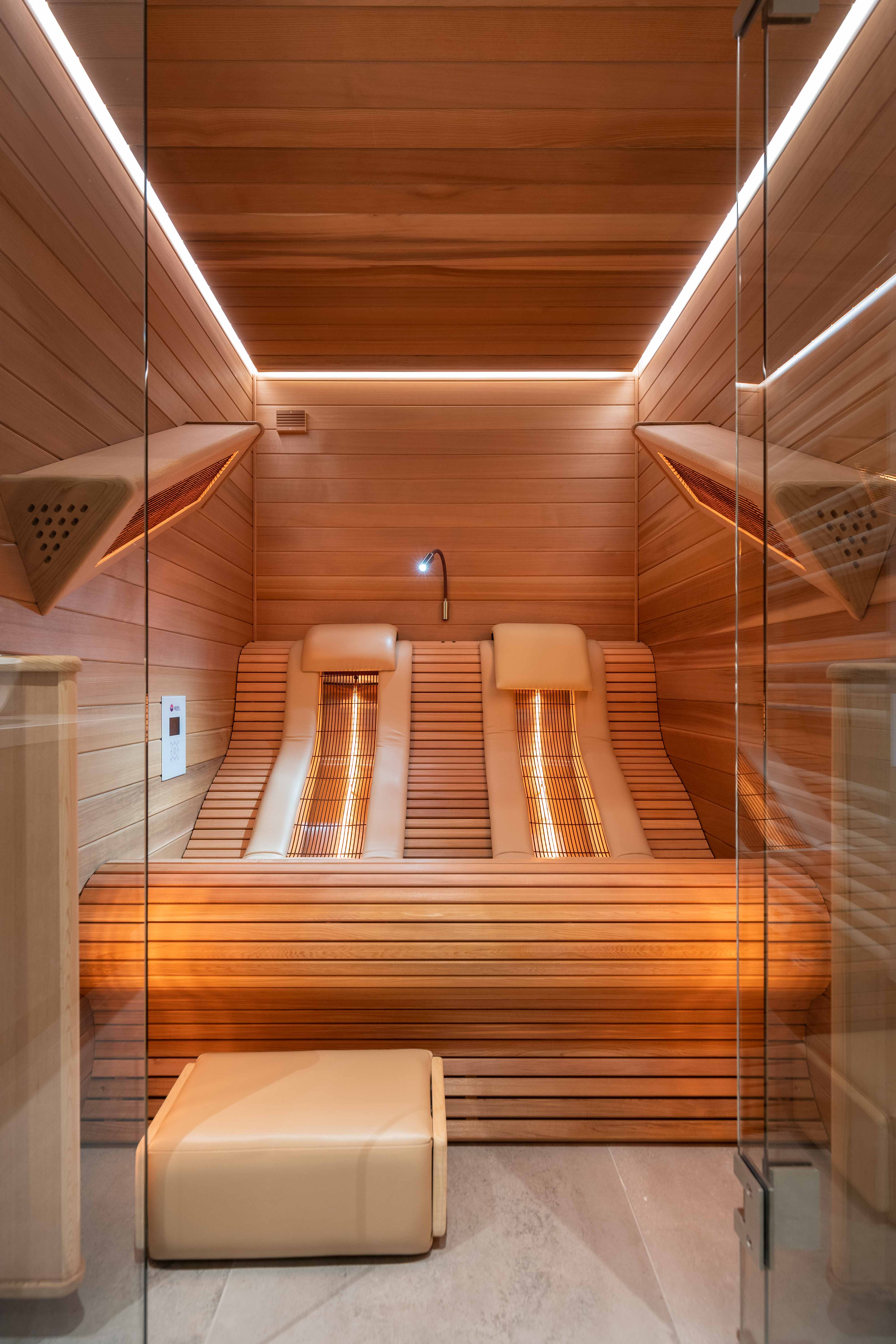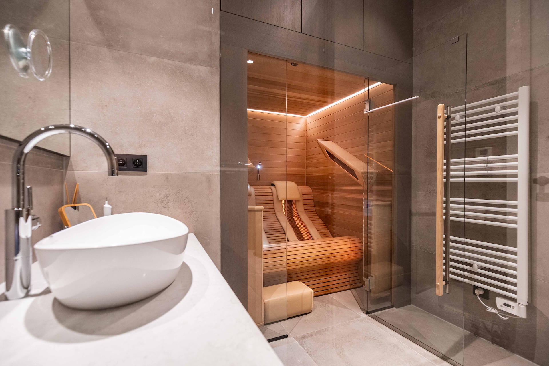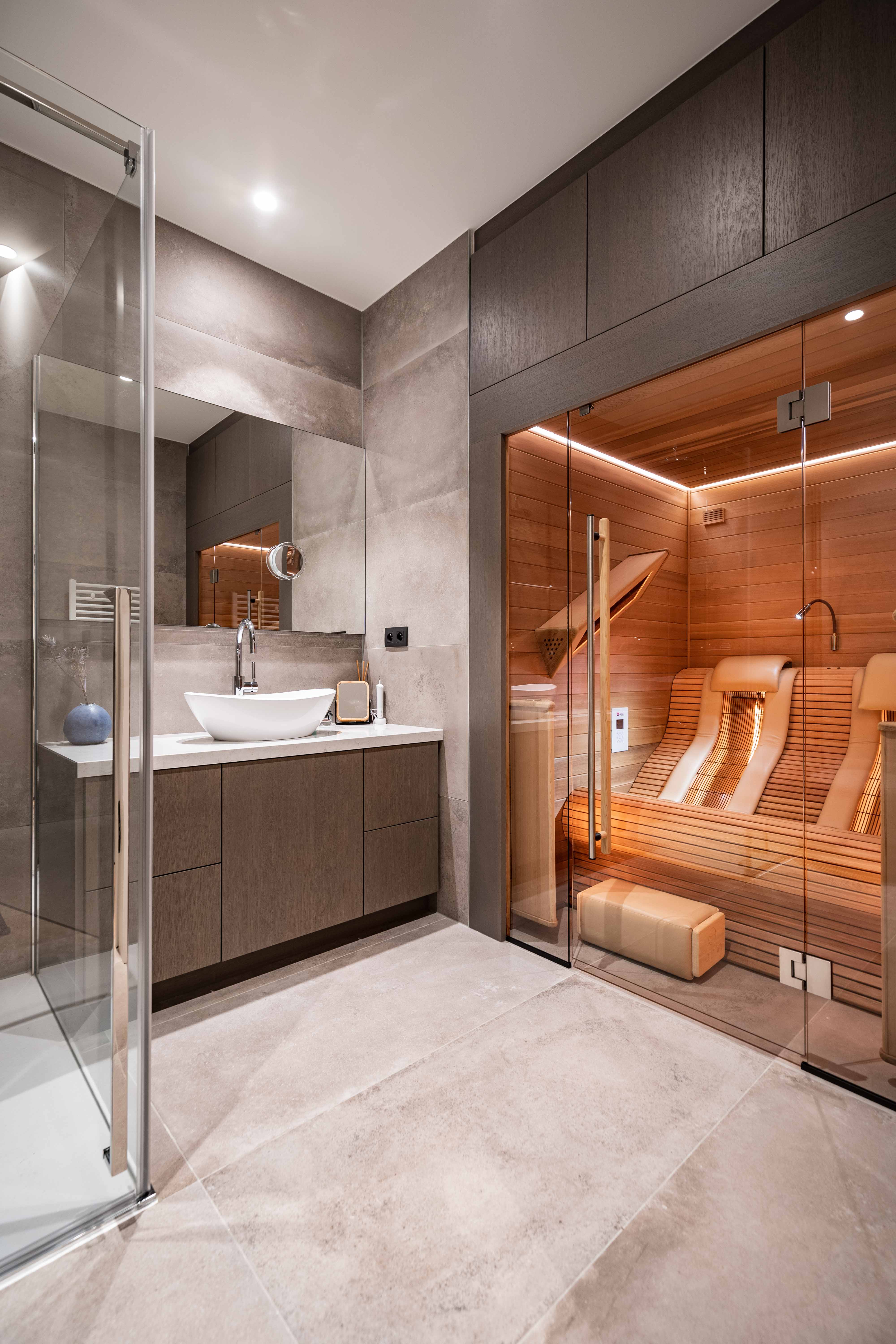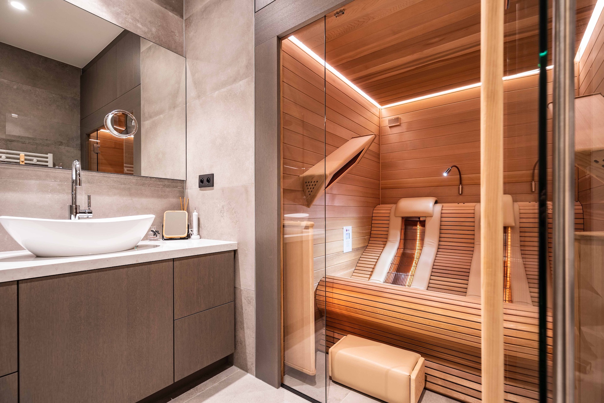 A compact master bathroom with rain head shower, vessel sink and 2-person full spectrum infrared sauna. The expansive front glazing of the sauna with a frameless 36" door and stainless steel hinges complements the luxurious clear grade cedar interior. The ergonomic lounger is equipped with self-adjusting heaters that track in real-time the heart rate of the bather and covered with vegan leather cushions. The sauna can be controlled via the wall-mounted panel or smartphone application, including the moisture-resistant wireless speakers concealed under the lounger. The cove light feature is delivered by a heatproof LED RGB strip with an integrated Wi-Fi drive.