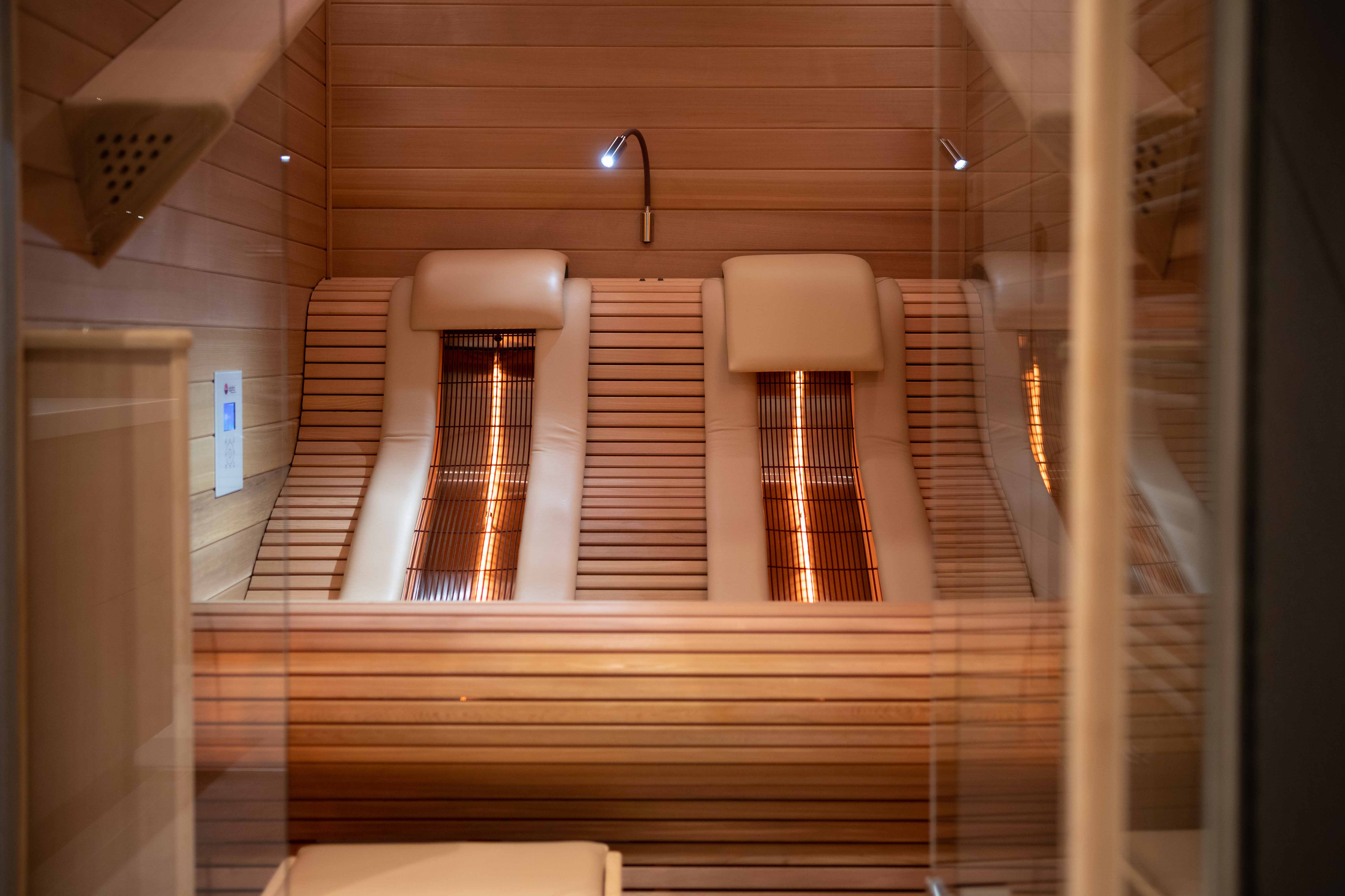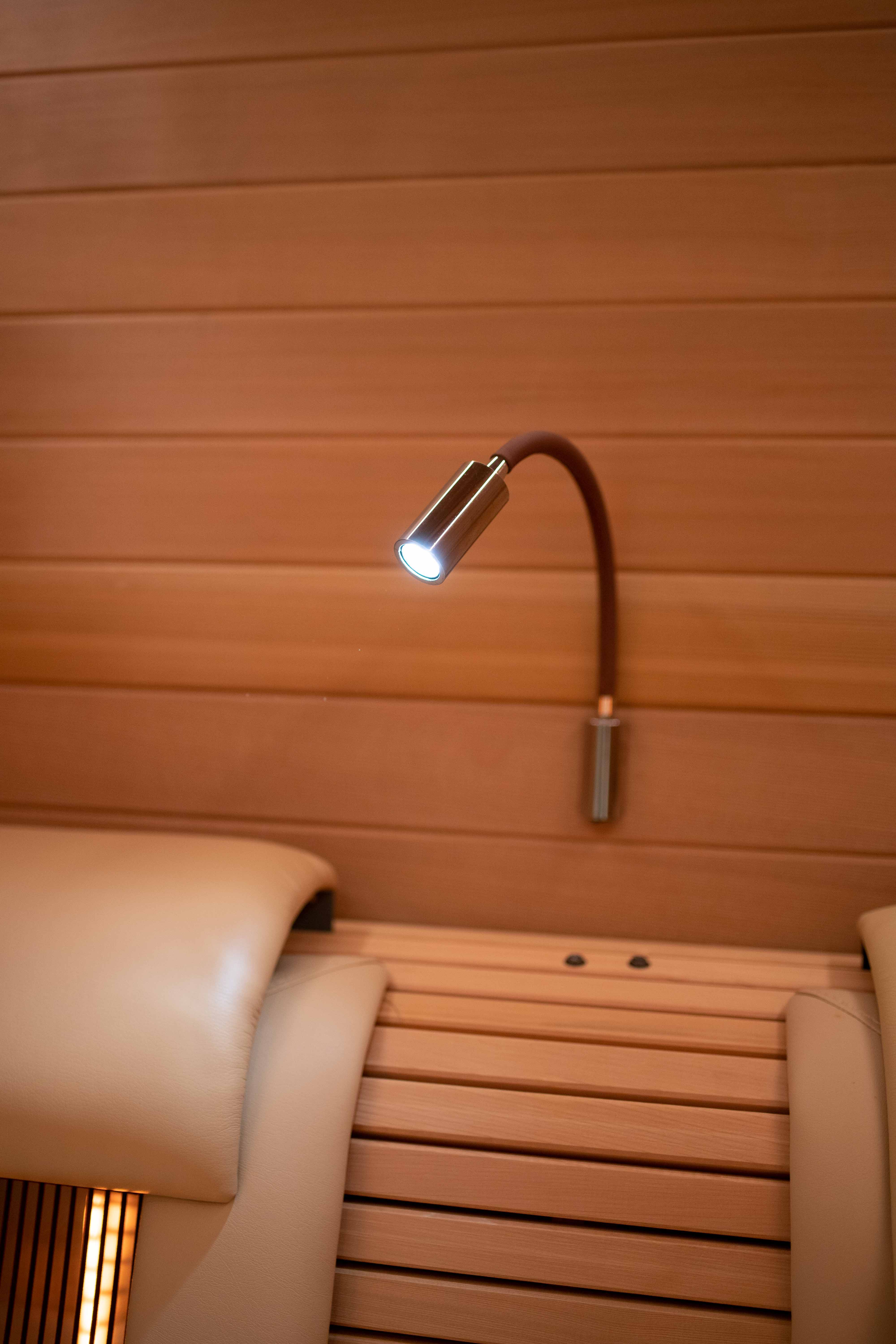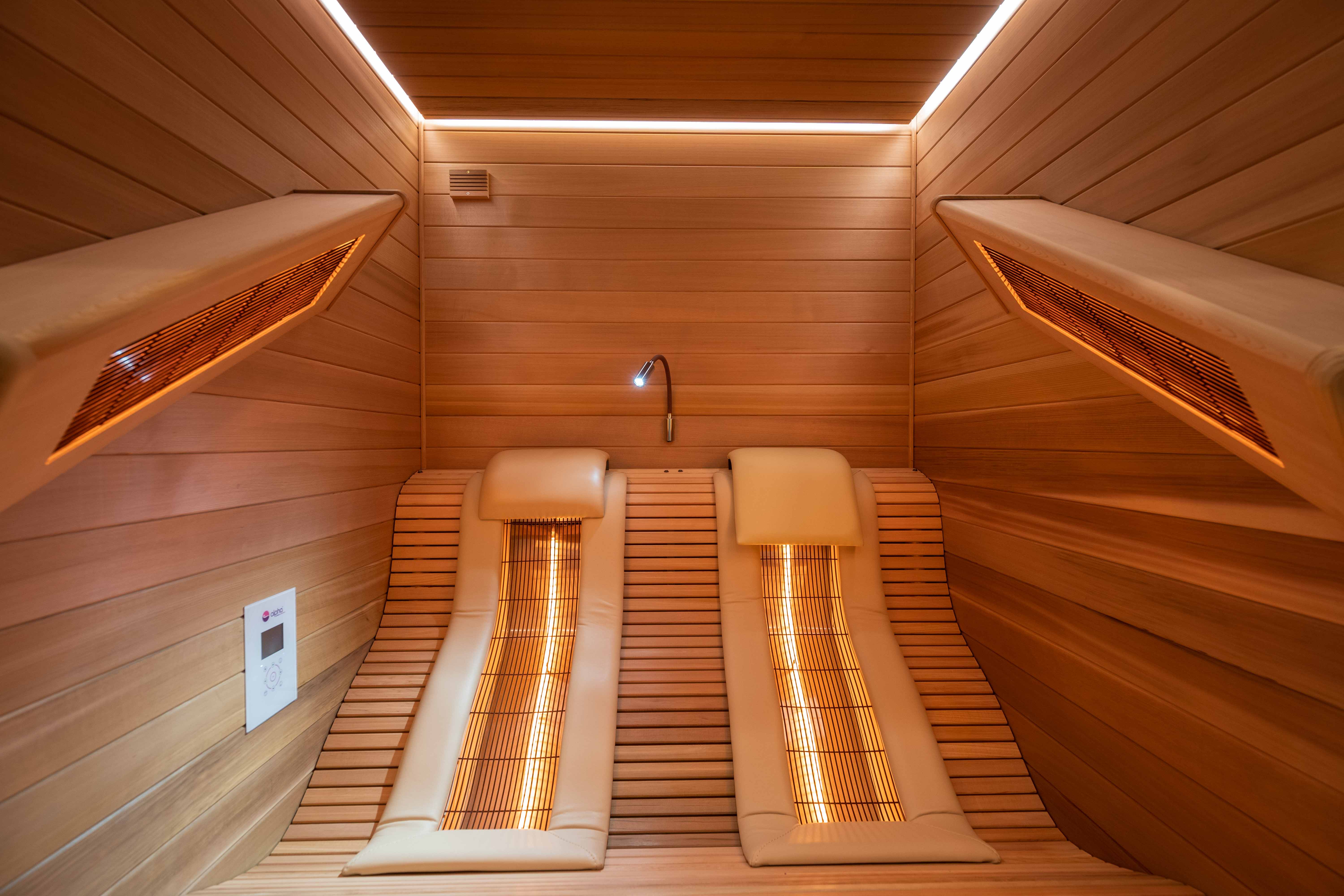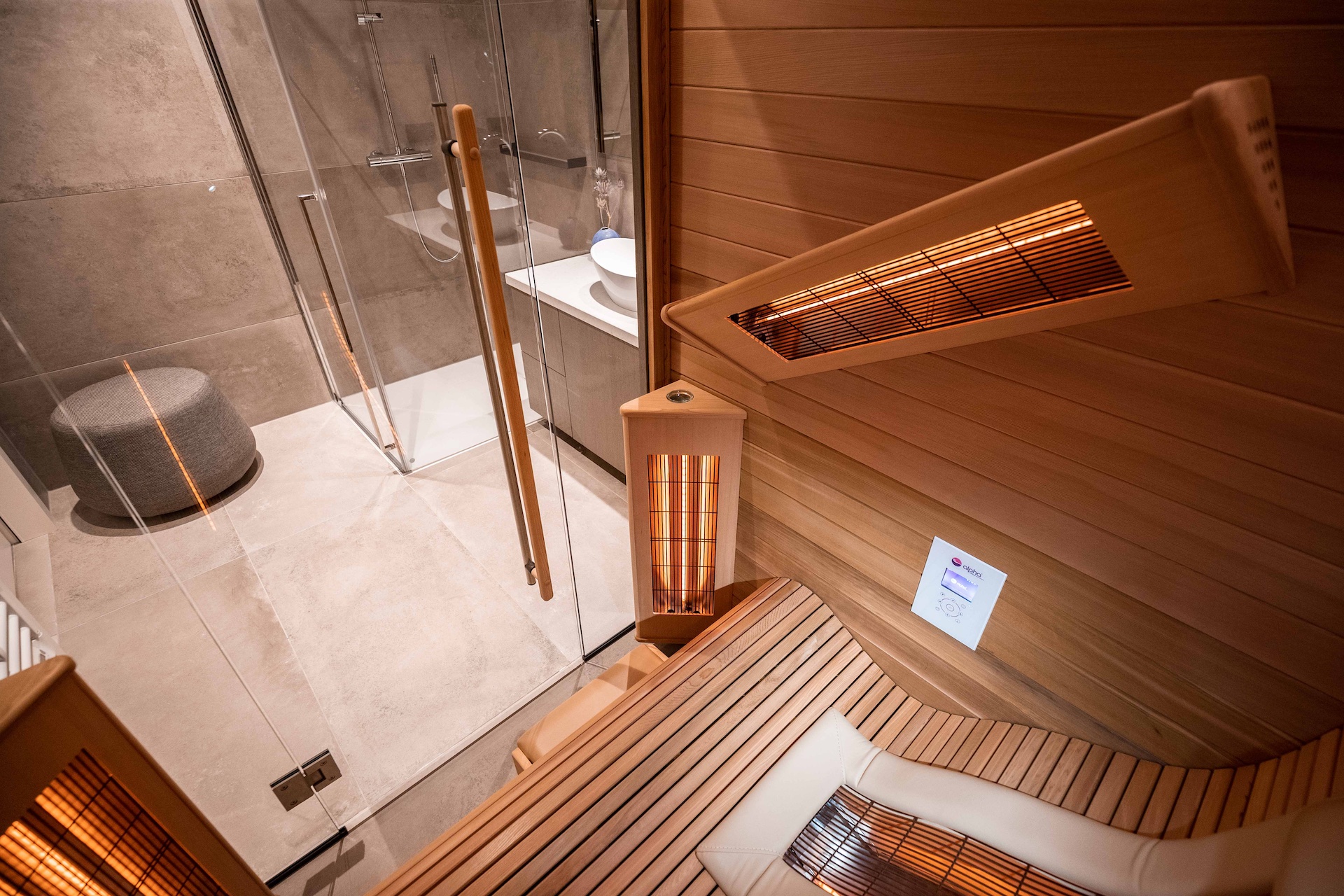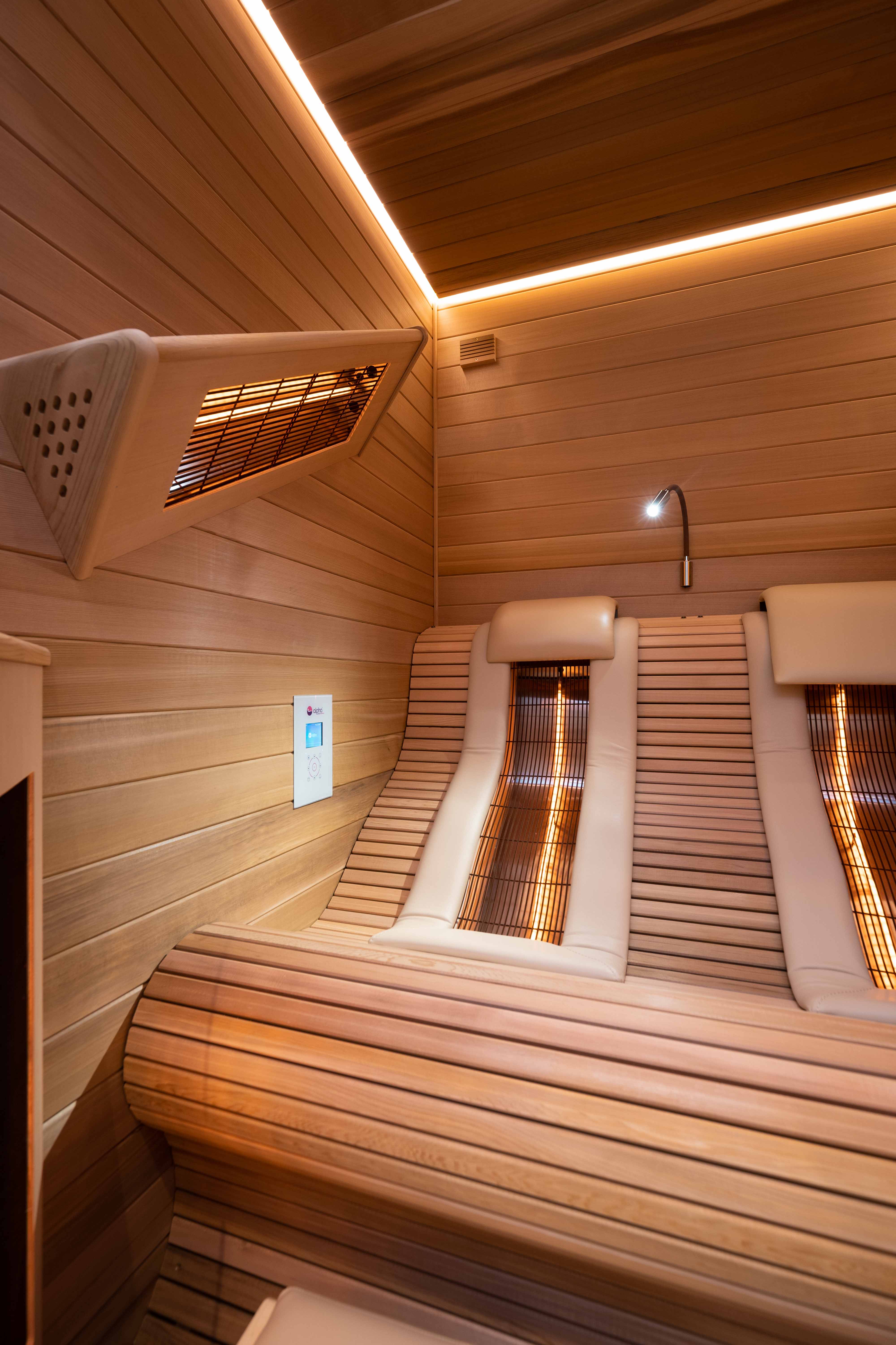 A compact master bathroom with rain head shower, vessel sink and 2-person full spectrum infrared sauna. The expansive front glazing of the sauna with a frameless 36" door and stainless steel hinges complements the luxurious clear grade cedar interior. The ergonomic lounger is equipped with self-adjusting heaters that track in real-time the heart rate of the bather and covered with vegan leather cushions. The sauna can be controlled via the wall-mounted panel or smartphone application, including the moisture-resistant wireless speakers concealed under the lounger. The cove light feature is delivered by a heatproof LED RGB strip with an integrated Wi-Fi drive.