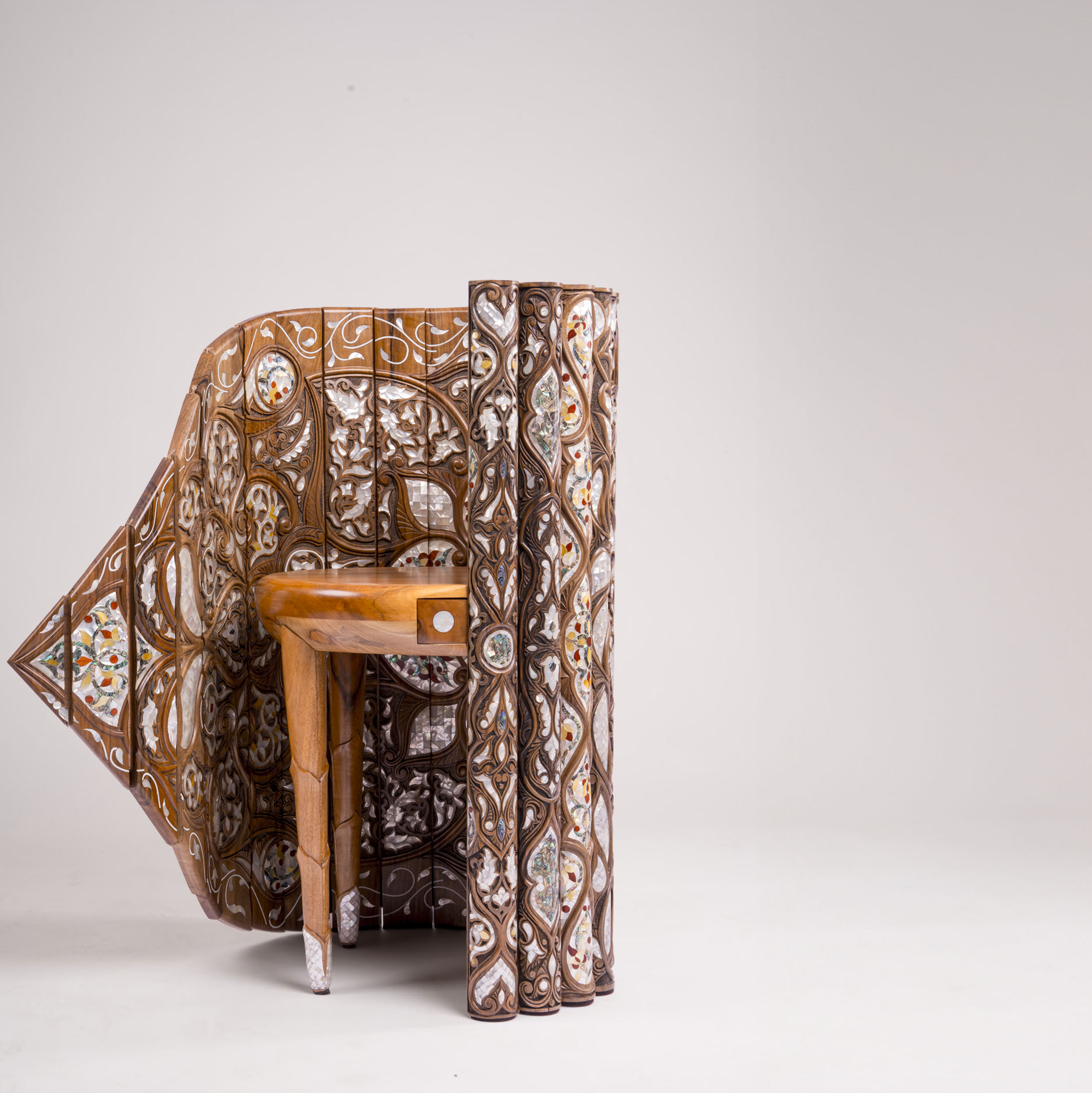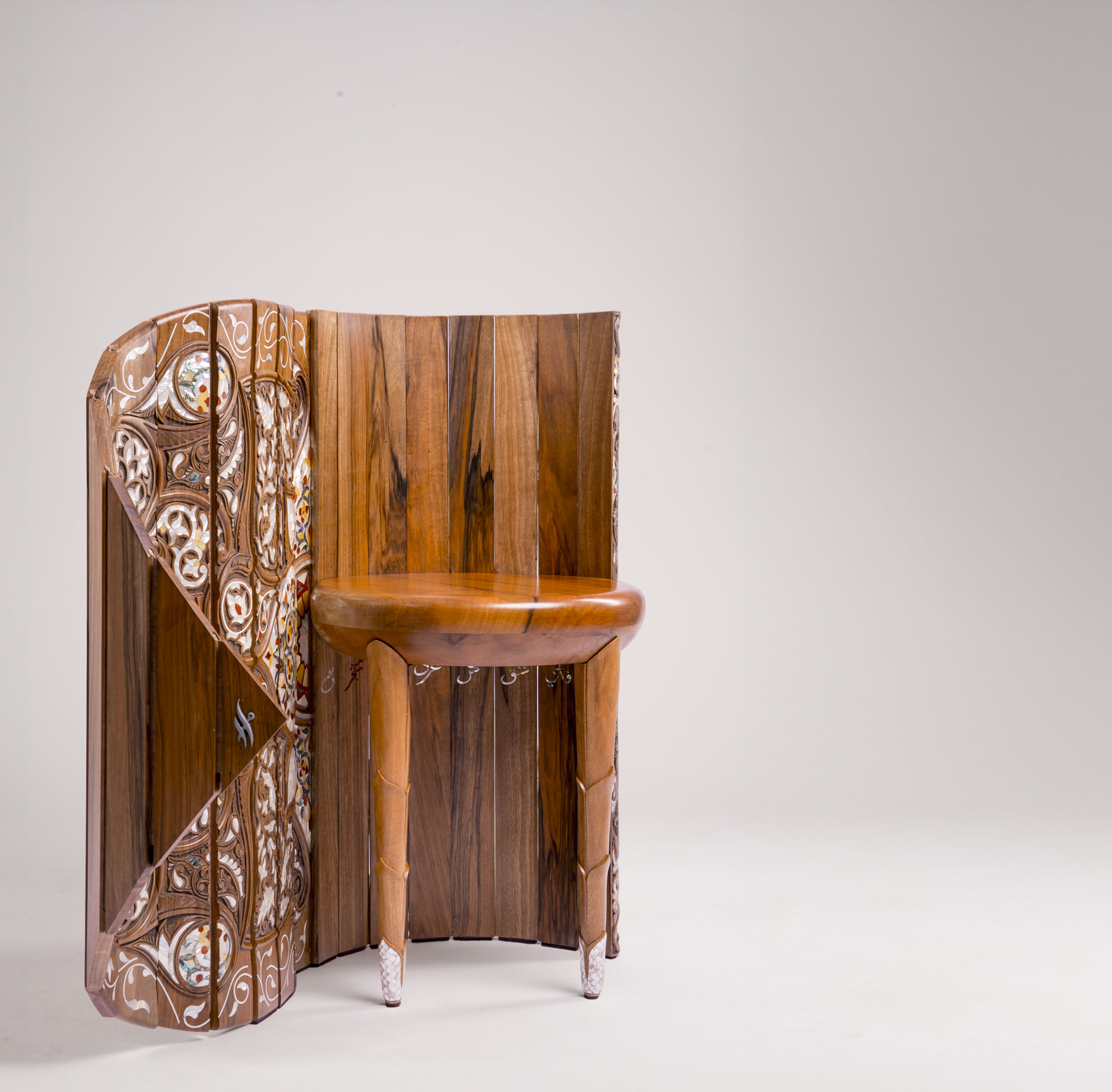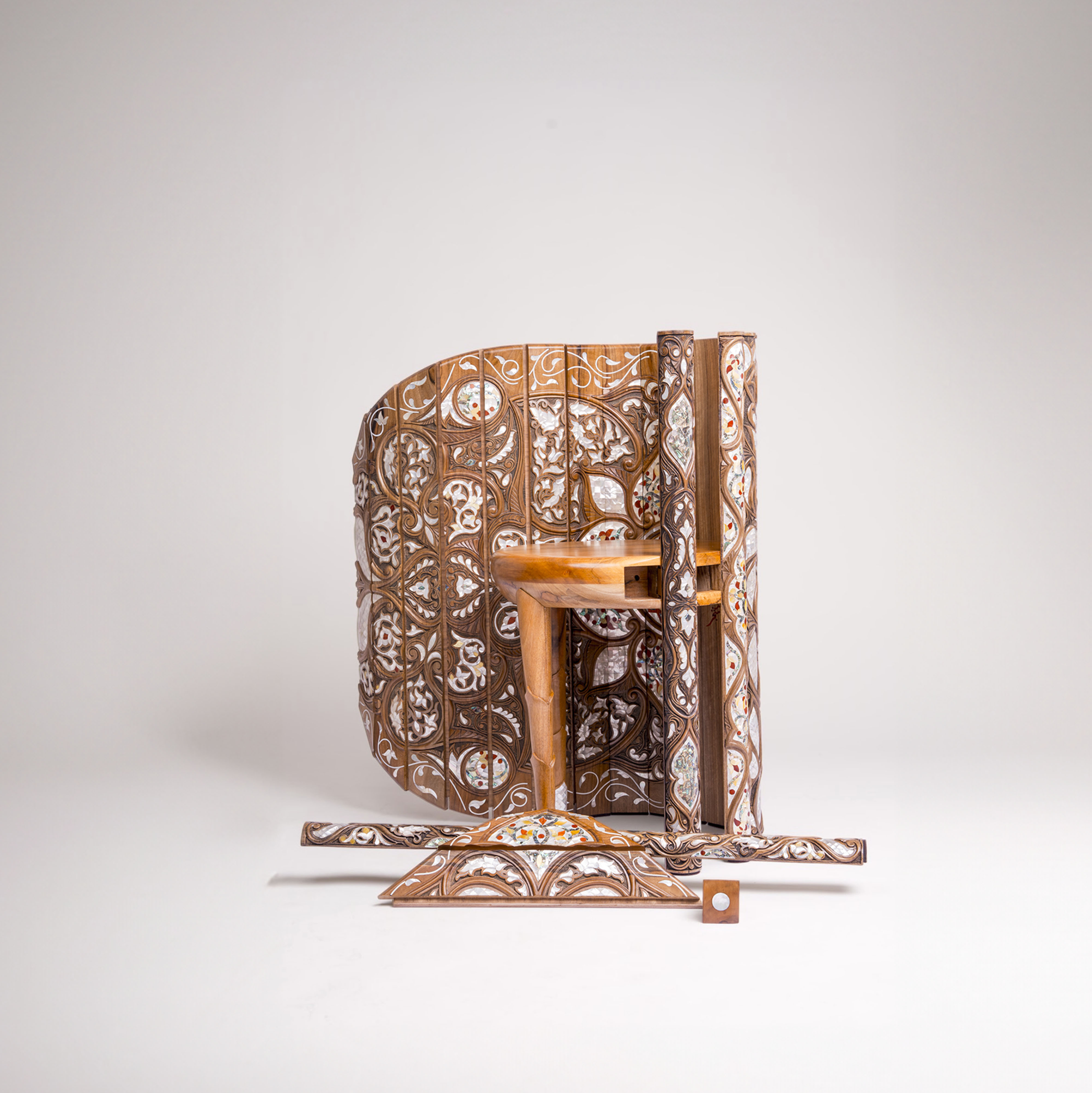Crafted from walnut and inlaid mother-of-pearl, the chair preserves the authentic material palette of Islamic woodworking while reinterpreting it through engineered tension that reduces waste and extends lifespan through repairability.