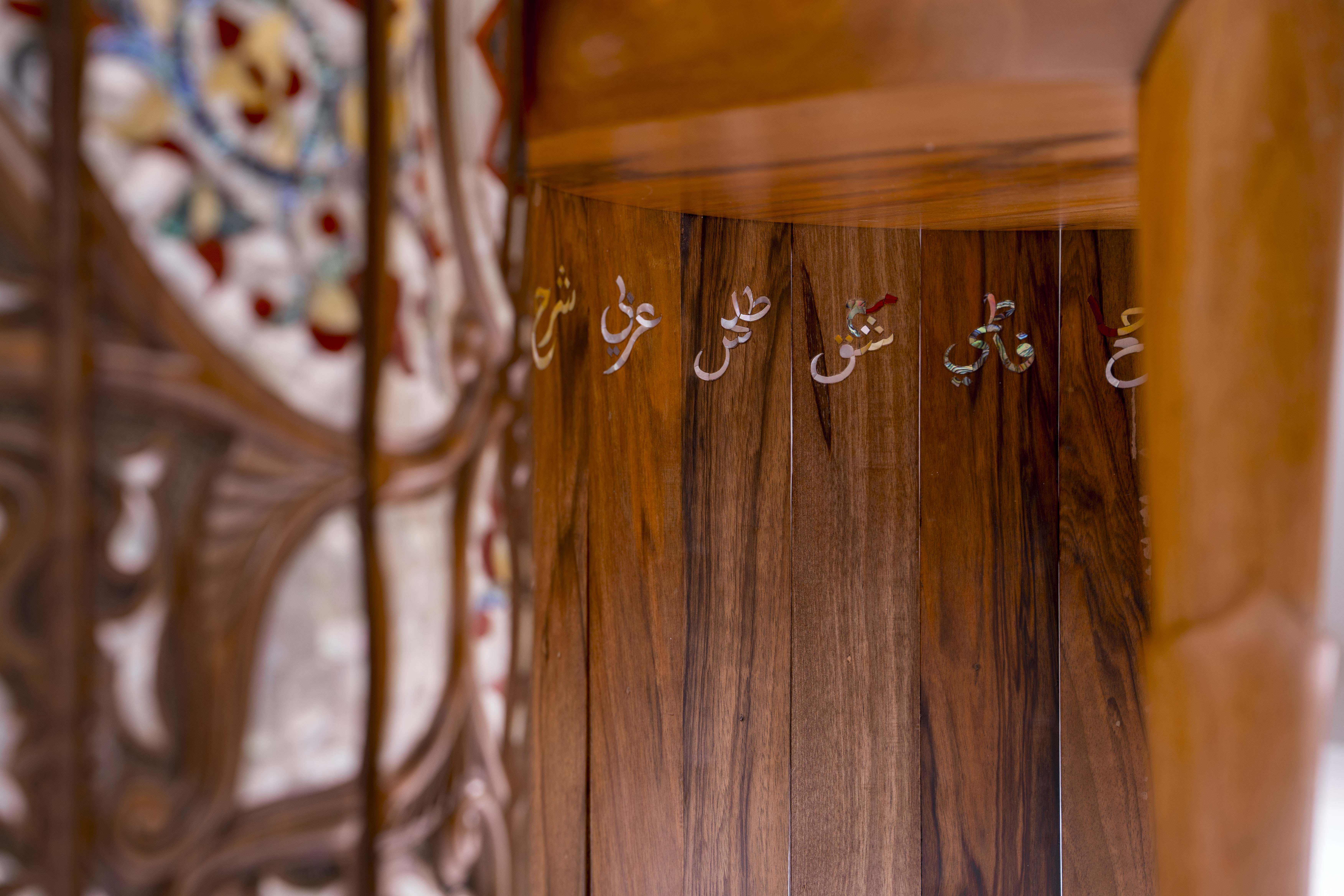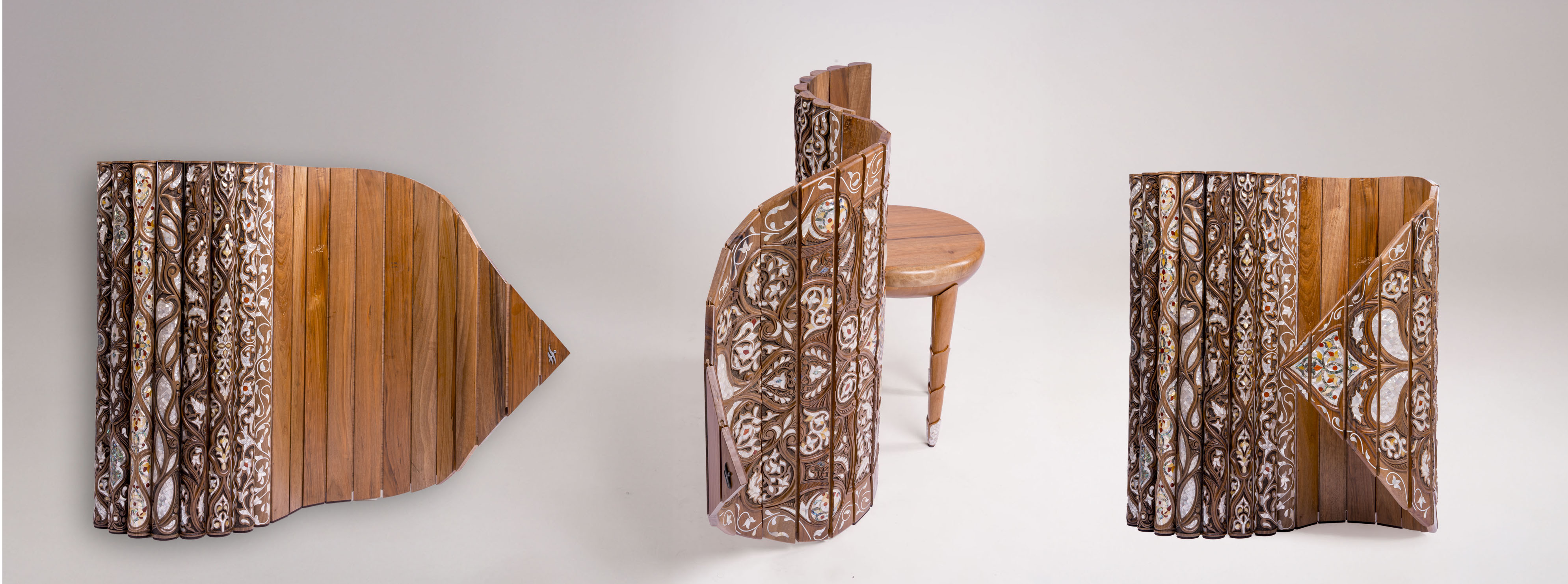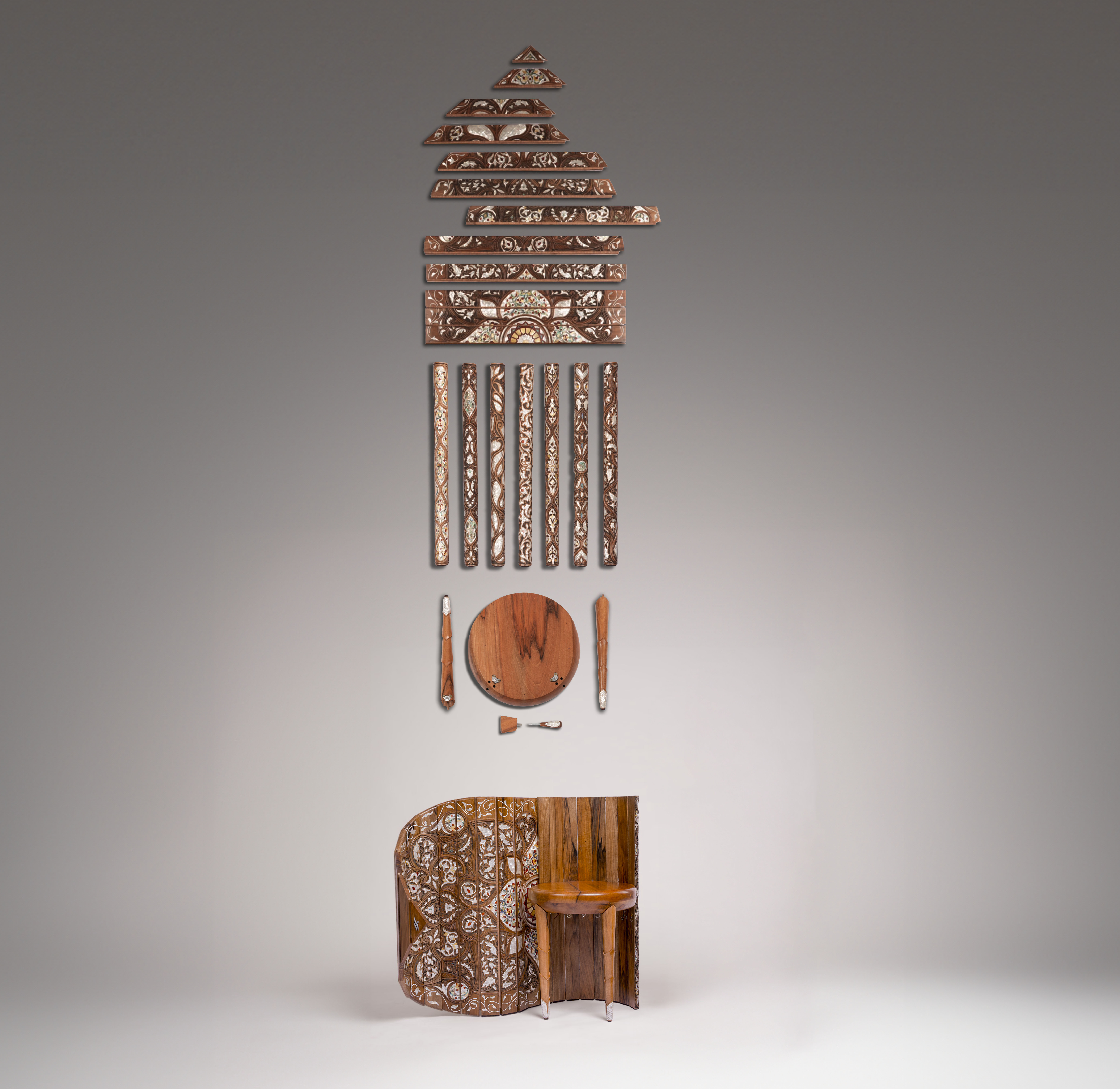 Crafted from walnut and inlaid mother-of-pearl, the chair preserves the authentic material palette of Islamic woodworking while reinterpreting it through engineered tension that reduces waste and extends lifespan through repairability.