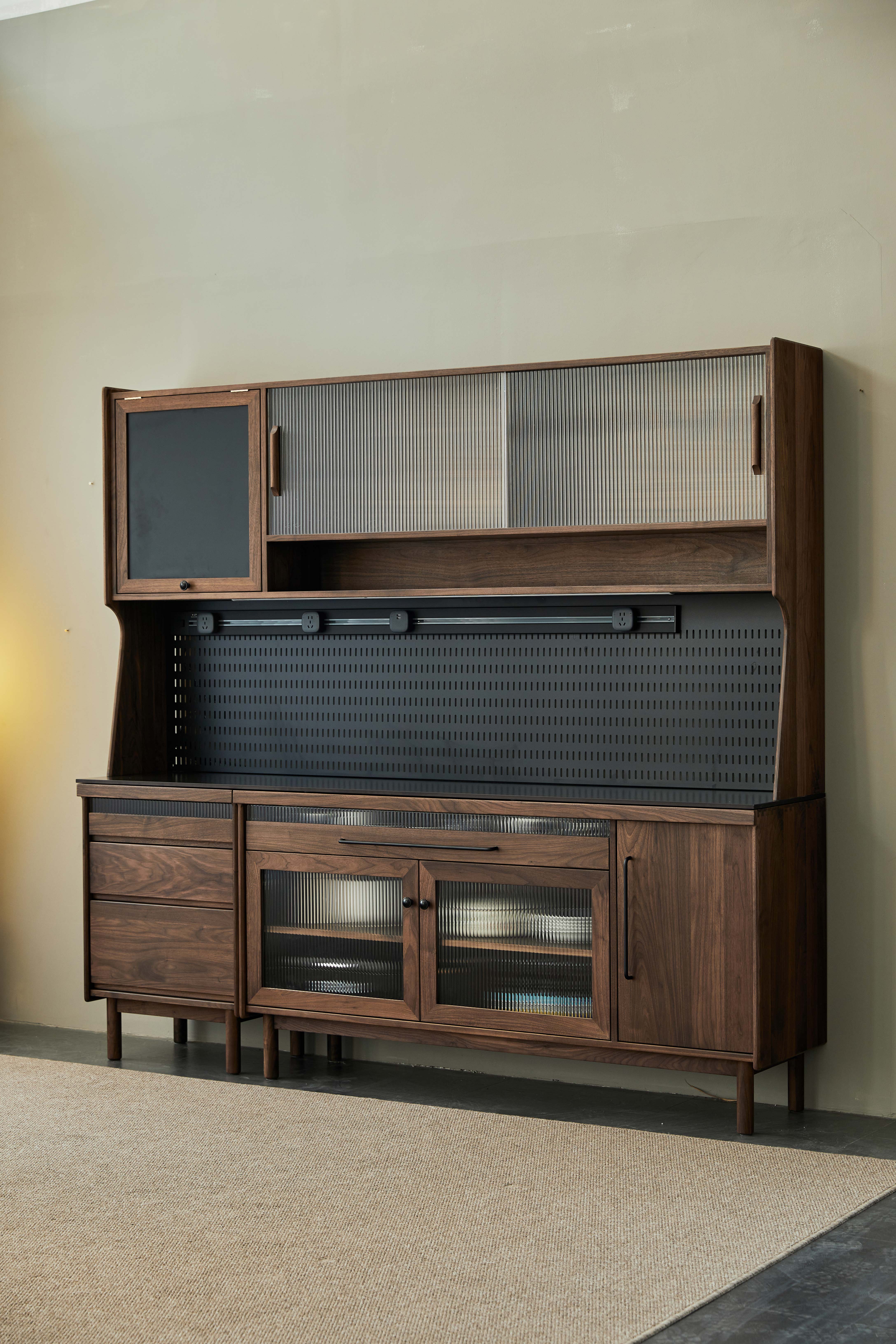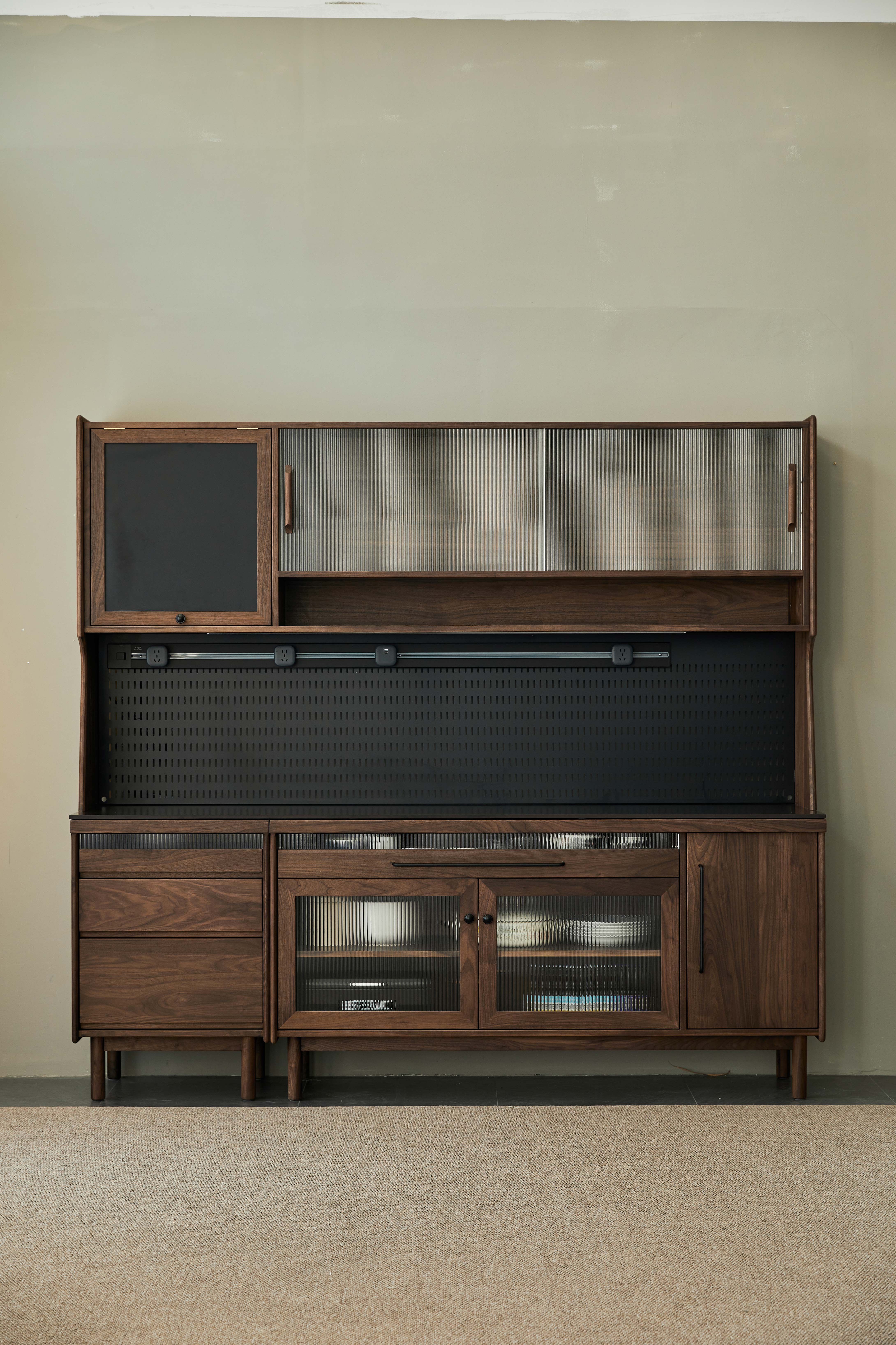 A symphony of materials creates a harmony of warmth and reason. The cabinet is crafted from select FAS-grade North American black walnut, its rich color and flowing grain patterns infusing the space with natural warmth. The doors feature expansive panels of fluted glass that refract light for a soft, poetic effect. This design maintains a sense of visual openness while cleverly concealing clutter, achieving a perfect balance between "hiding" and "revealing." The black metal handles and track provide a finishing touch, adding a sleek, modern edge.
