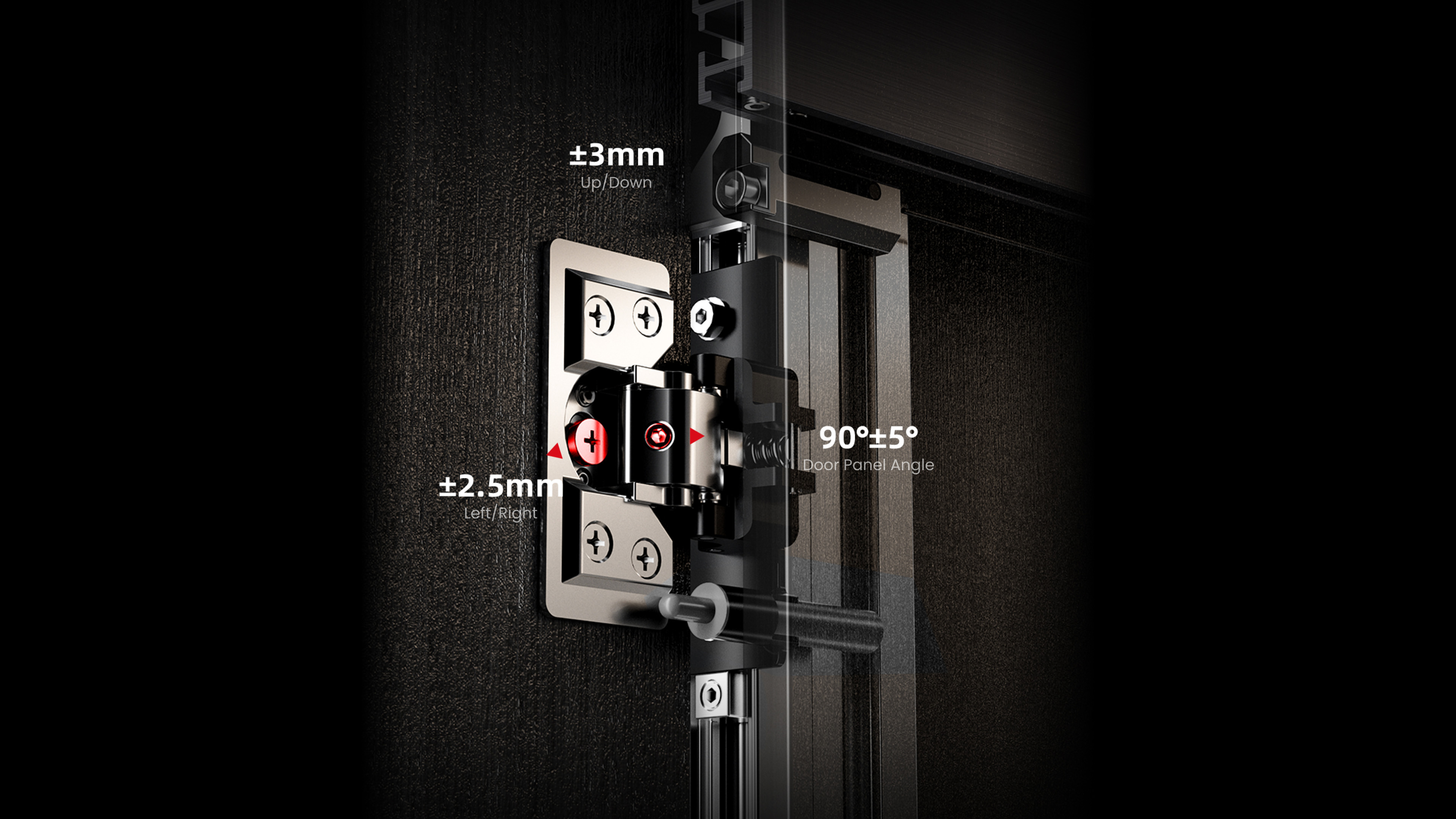 Multi-dimensional Adjustment and Efficient Installation: Supports multi-dimensional fine adjustment of the door panel: up/down ±3mm, left/right ±2.5mm, and door panel angle 90°±5°, ensuring precise and convenient installation. Hinges are two-dimensionally adjustable, and the rebounder track depth is adjustable, adapting to different installation needs.