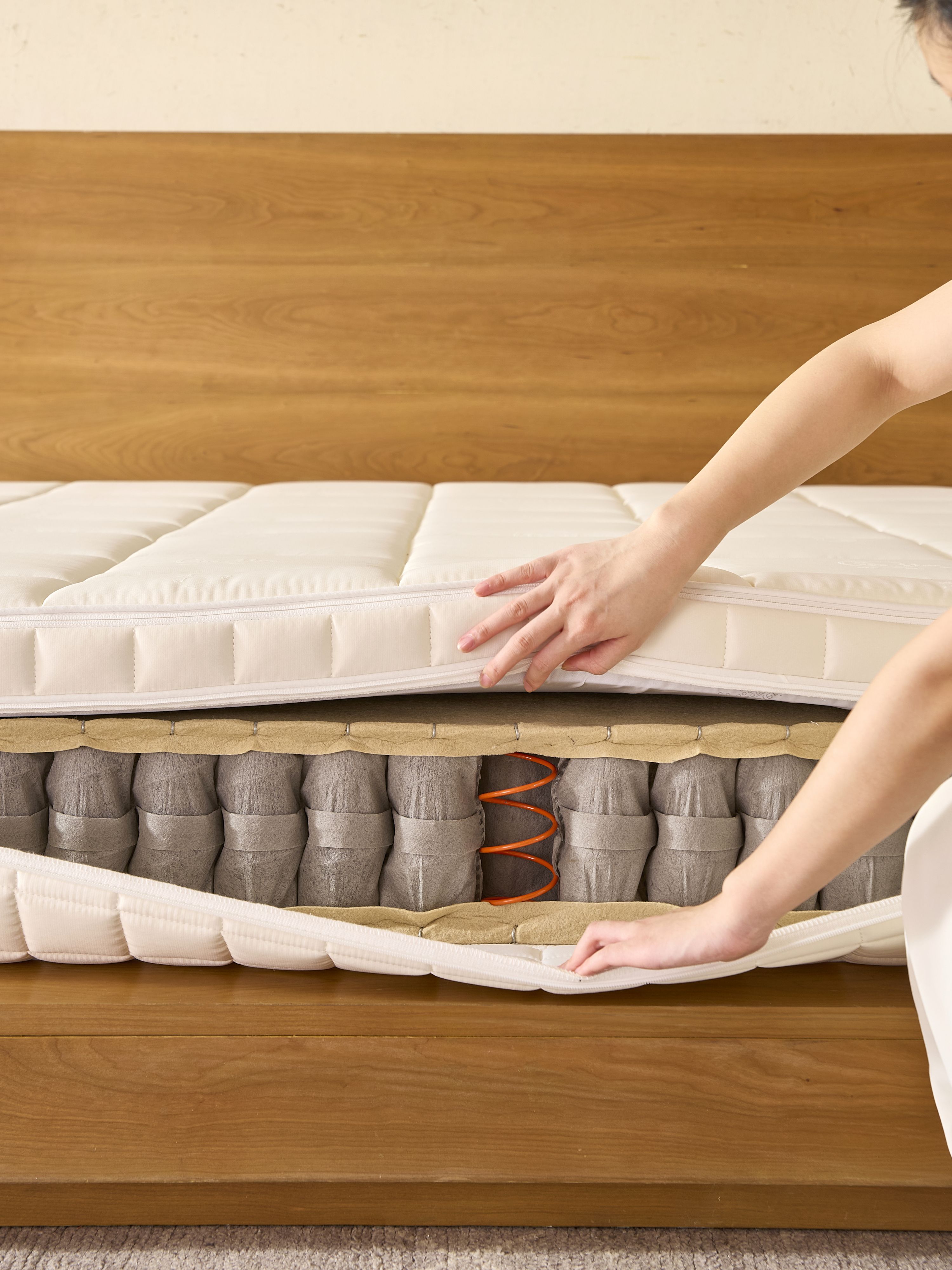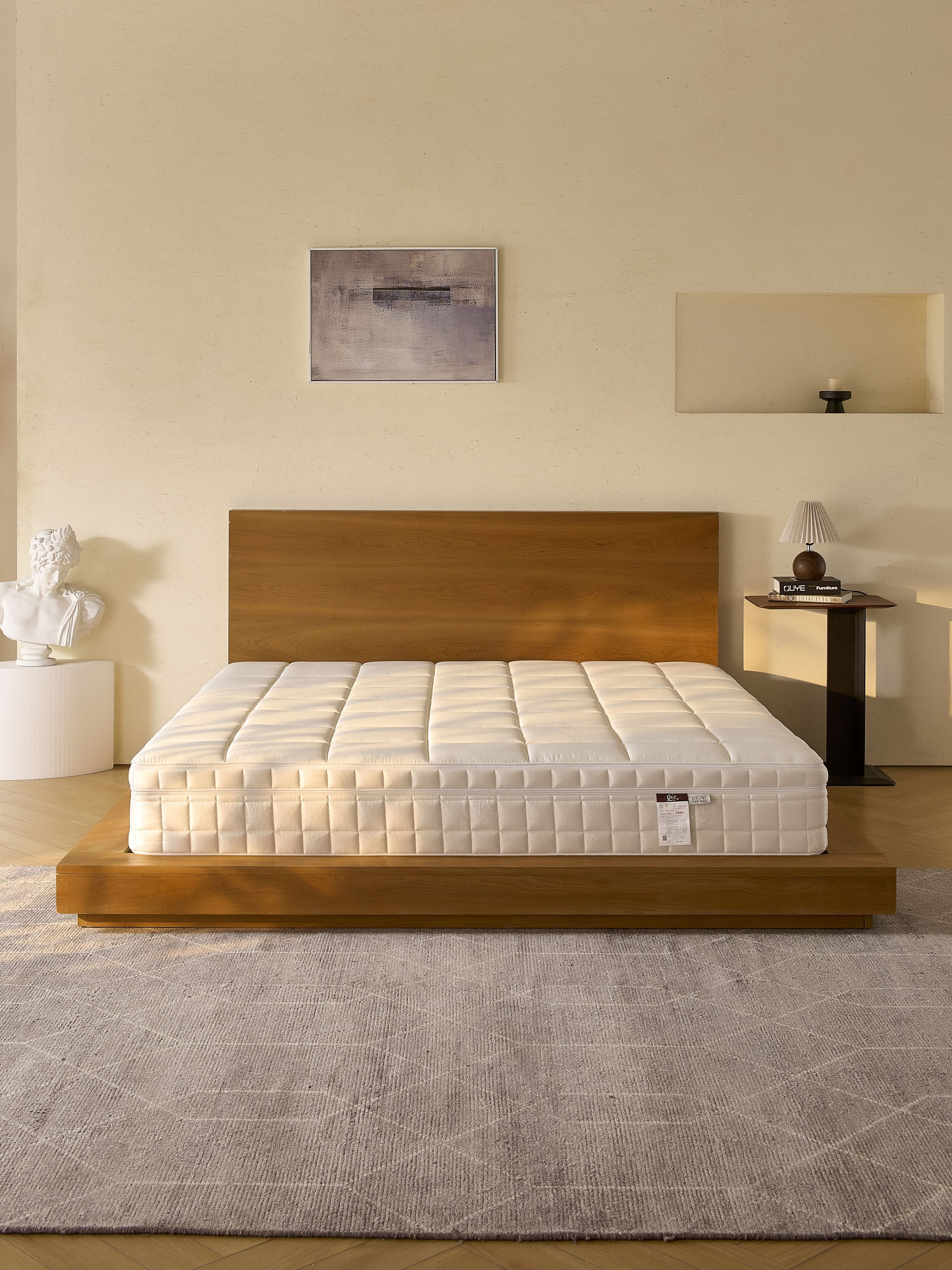 The mattress employs an advanced layered system to create comprehensive sleep support: a cotton-linen-silk cover offers a smooth feel and integrates high-efficiency antibacterial and anti-mite agents, achieving >99% repellent rate and inhibition rate to safeguard sleep health; high-elastic 4D air fiber with a three-dimensional hollow structure markedly enhances breathability, while 1.4 million precise support points cradle body pressure, high resilience disperses load, and responsive conformity adapts to posture changes for full-body care; a bio-based blue pad contains 25% soybean-oil derivatives, delivering natural eco benefits and 2 cm of dynamic support that resists long-term sagging; jute fiber cotton undergoes high-temperature de-sugaring and sterilization, paired with a glue-free hot-press process for zero formaldehyde and zero adhesives, offering breathability, moisture management, and flexibility; in addition, a 3-zone cooling-fabric pocketed-spring unit, engineered to ergonomic principles, precisely protects spinal alignment, while dual edge-support springs combined with eight heavy-gauge coils provide reinforced perimeter strength, robust support, and excellent motion isolation.
