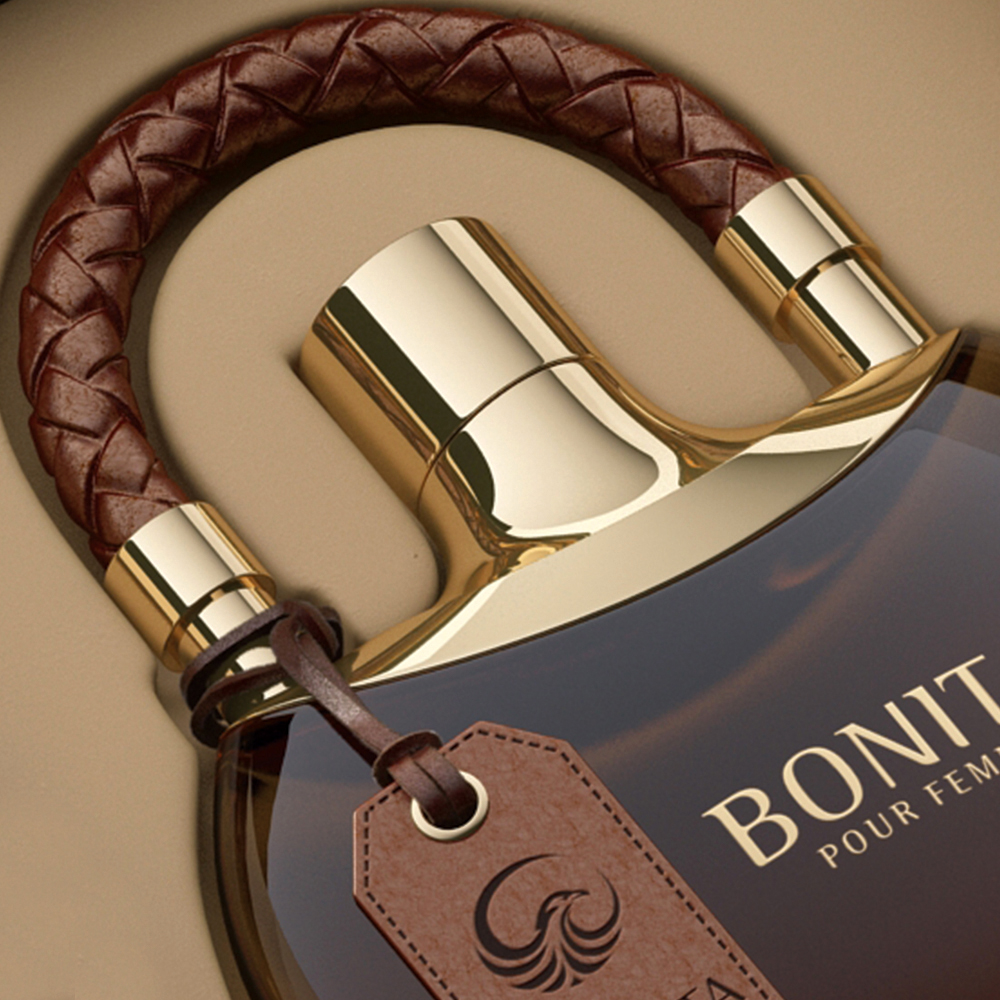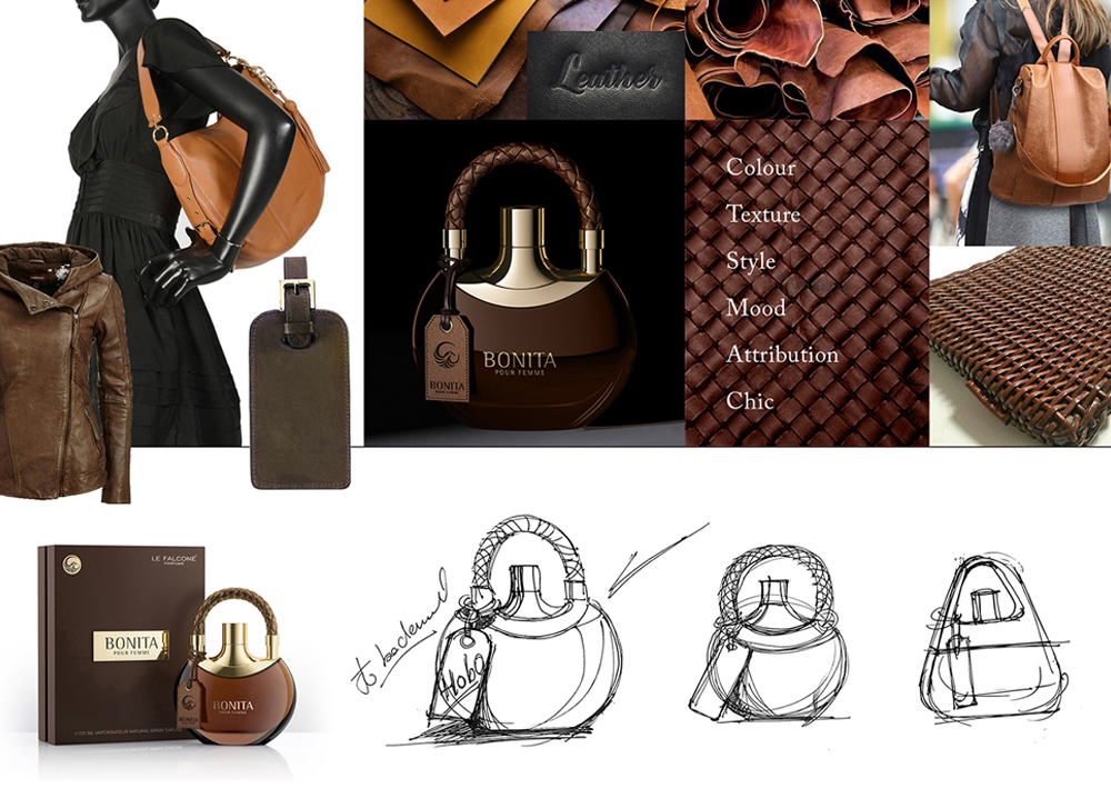 This product concept was further enhanced by using right set of material, finish and production technique. Because the material was the key factor to get the right end product, the color palette was kept minimal with Brown and Gold as prominent with dark brown leather aspects. Overall product comes across as miniature bag gives very strong attention grabbing perfume flacon on the shelf.