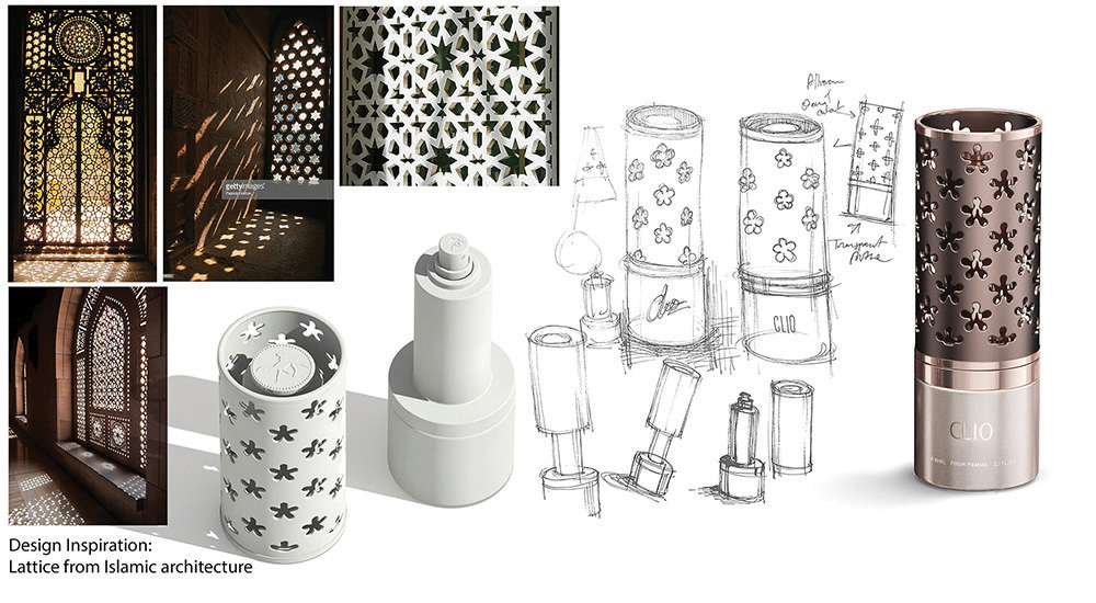 Brief: Brief was to create a Feminine perfume product that is unconventional in term of look and feel Meant for Middle East Market Challenge: The challenge was to break the notion of how we perceive perfume bottle in general. Entire design exercise was to create a visual language for effective Packaging that can build a powerful story. Solution: CLIO is an enigmatic poetry crafted in bottle that tells the story of feminity, elegance and Beauty. It’s a depiction of Arabian ethos, infinite love and serenity, We took inspiration from lattice from Islamic architecture We took the flower as a mnemonic and crafted a cylindrical product with Floral pattern Lattice in aluminium as an Oversized Cap, The concept emphasised rich with modern charm and would make an intriguing object of design for woman, Manifestation of craftsmanship, modern-day-elegance, simplicity, sophistication and transcend the ordinary are the elements that gone into making this design,