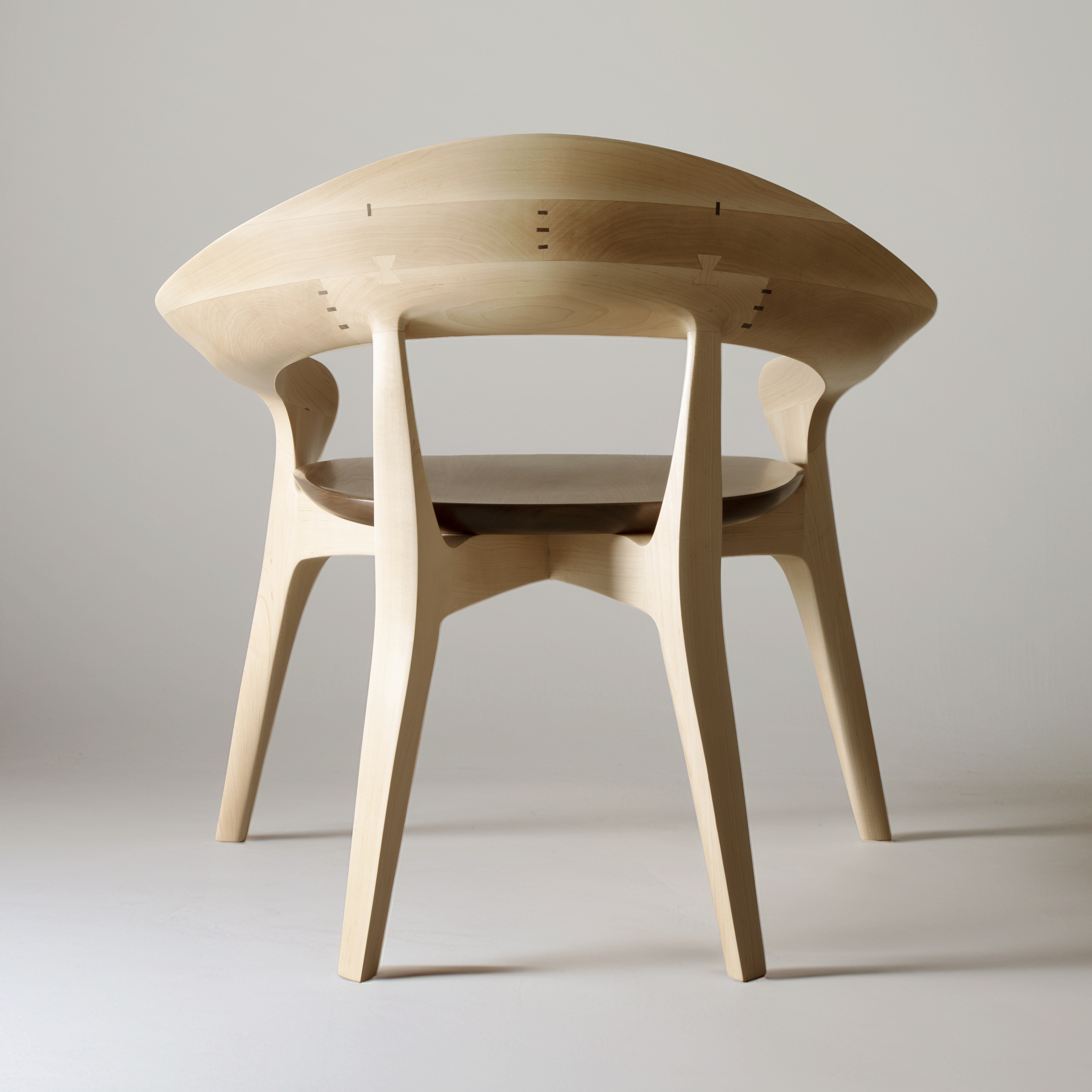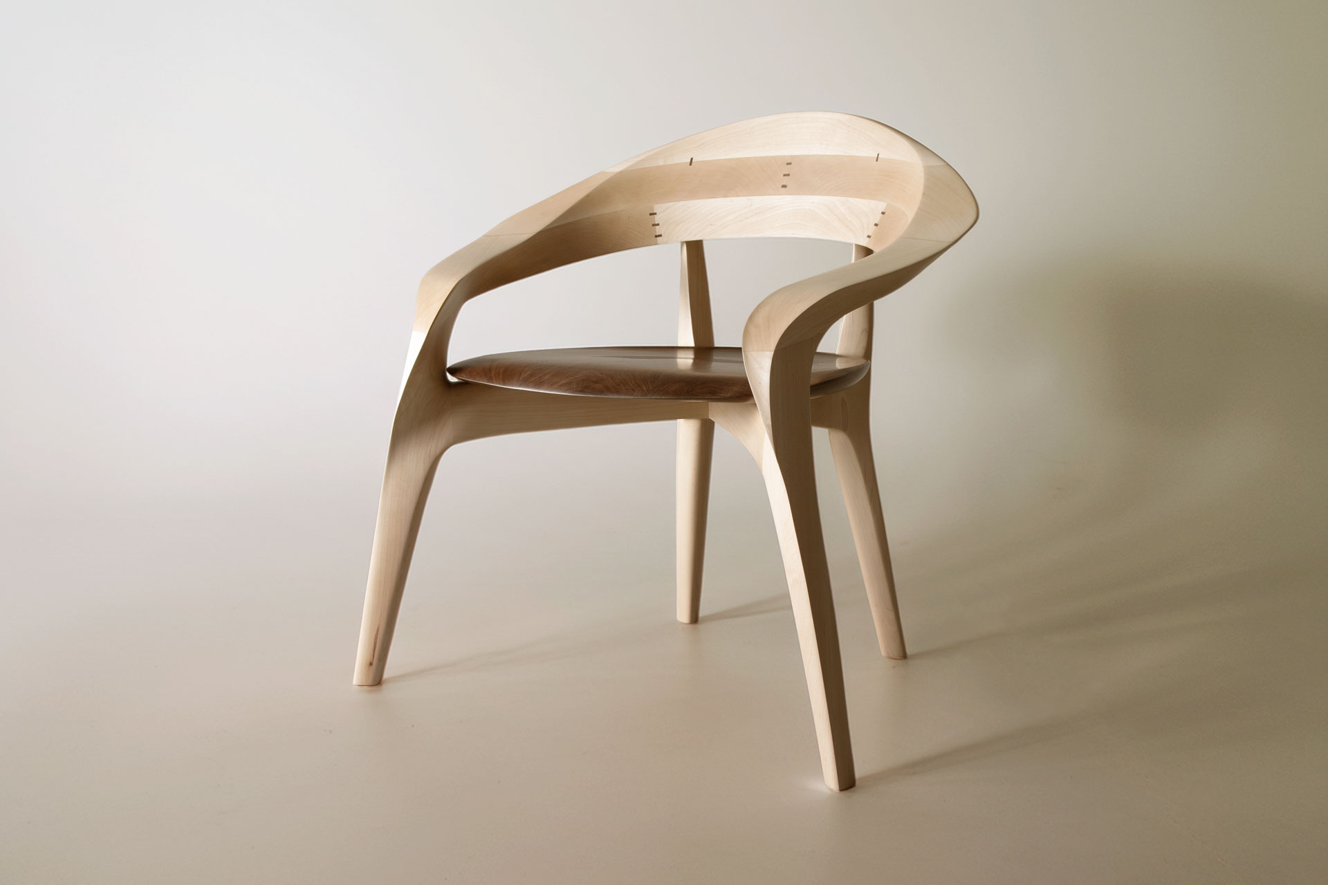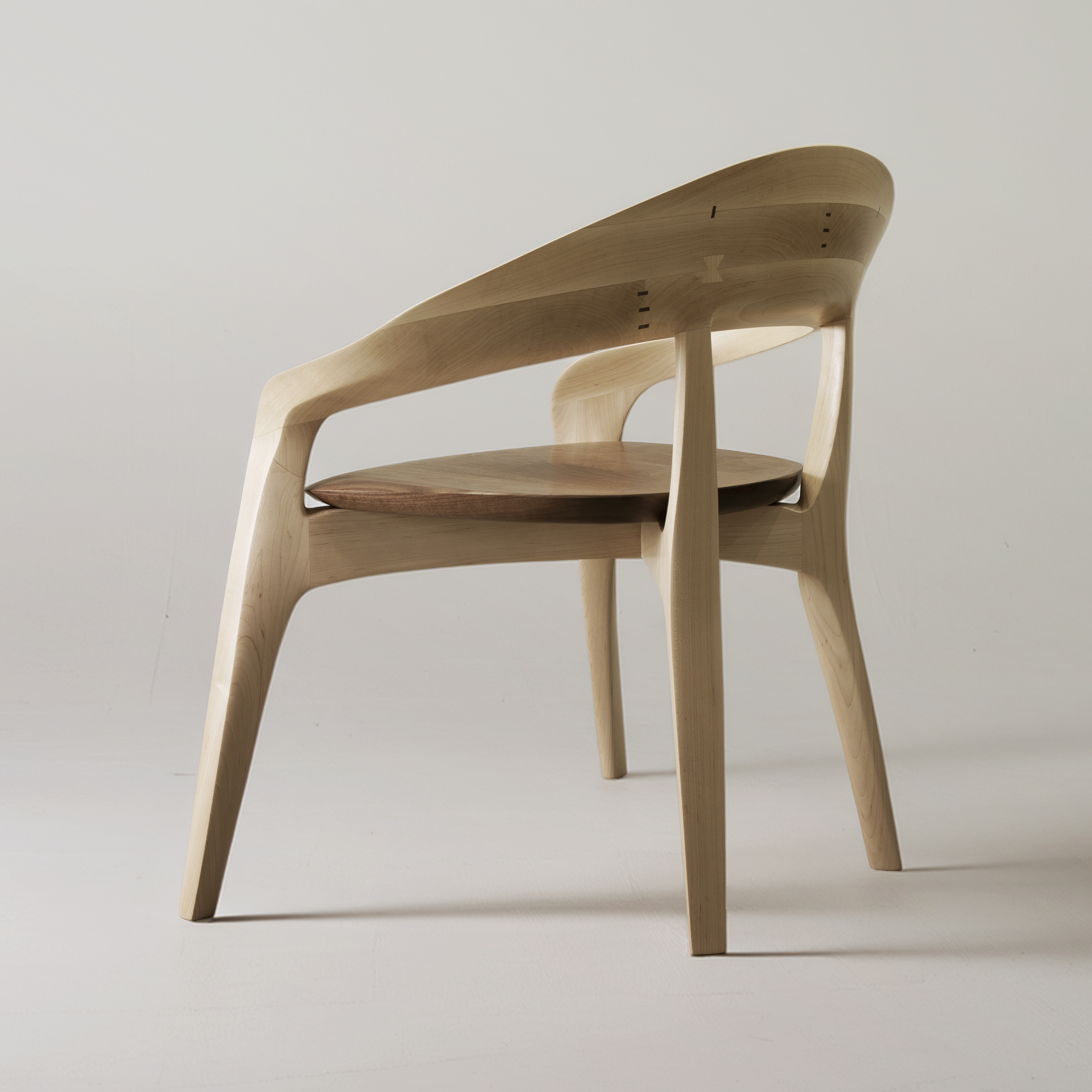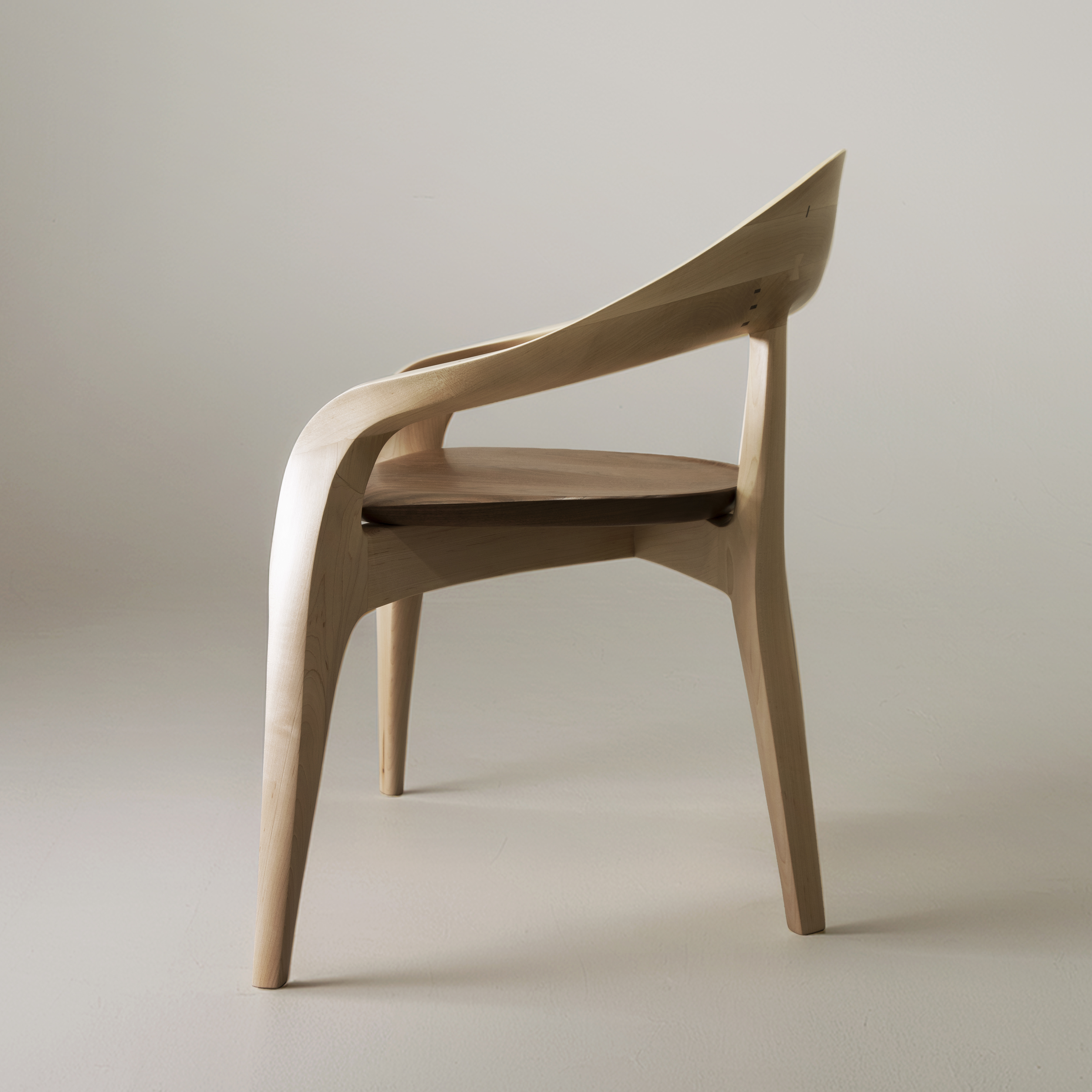 The form was realized by carving directly from solid wood using traditional Japanese hand tools. Rather than imposing a predetermined geometry, the final shape emerged through continuous interaction with the material. Balance, weight distribution, and surface transitions were adjusted through repeated physical testing, allowing the chair to achieve stability and comfort while maintaining a strong visual identity. The resulting geometry could not be achieved through industrial or automated processes, as its complexity relies on tactile judgment and material response.