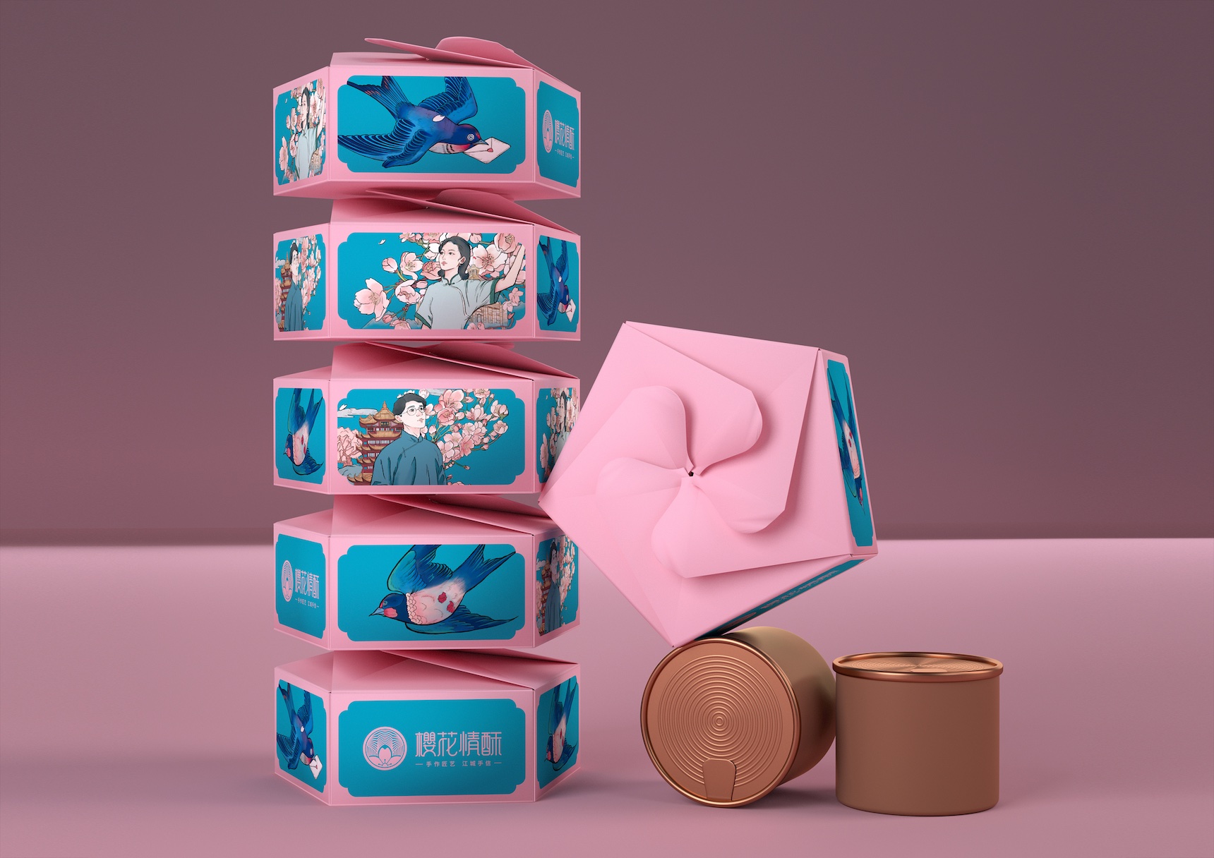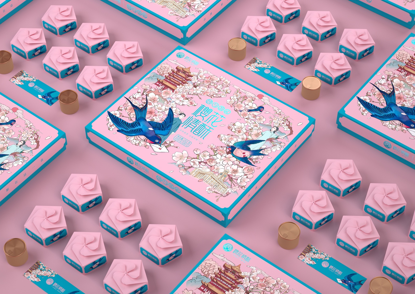 When you see a cherry blossom petal falling on the lake, accompanied by the breeze, the scenery is charming, which represents the characteristics of Wuhan. The name of this gift box is closely related to cherry blossoms. As a hand gift for the cherry blossom season in Wuhan, the designer hopes to integrate this beautiful scenery into the packaging design and keep it forever for customers to remember this moment. The gift box is covered with cherry blossoms in full bloom, which is matched with Wuhan landmark buildings such as East Lake tower, Yellow Crane Tower and Jianghan pass, showing spring vitality and local characteristics; The swallow with love letter gives the picture romantic emotion; The portrayal of characters in the 1990s adds a retro sense to this romance and highlights the characteristics of the brand's century old craftsmanship; The inner box design can be cleverly folded into the shape of cherry blossoms, which matches the blue bottom box of the lake to form the aesthetic feeling of "cherry blossoms falling on the lake". The inner box needs to be opened slowly along the petals to see the cherry cake wrapped in tin foil. After eating, the inner box can be folded along the petals as decoration, and the outer box can be used as a storage box, which is both beautiful and environmentally friendly.