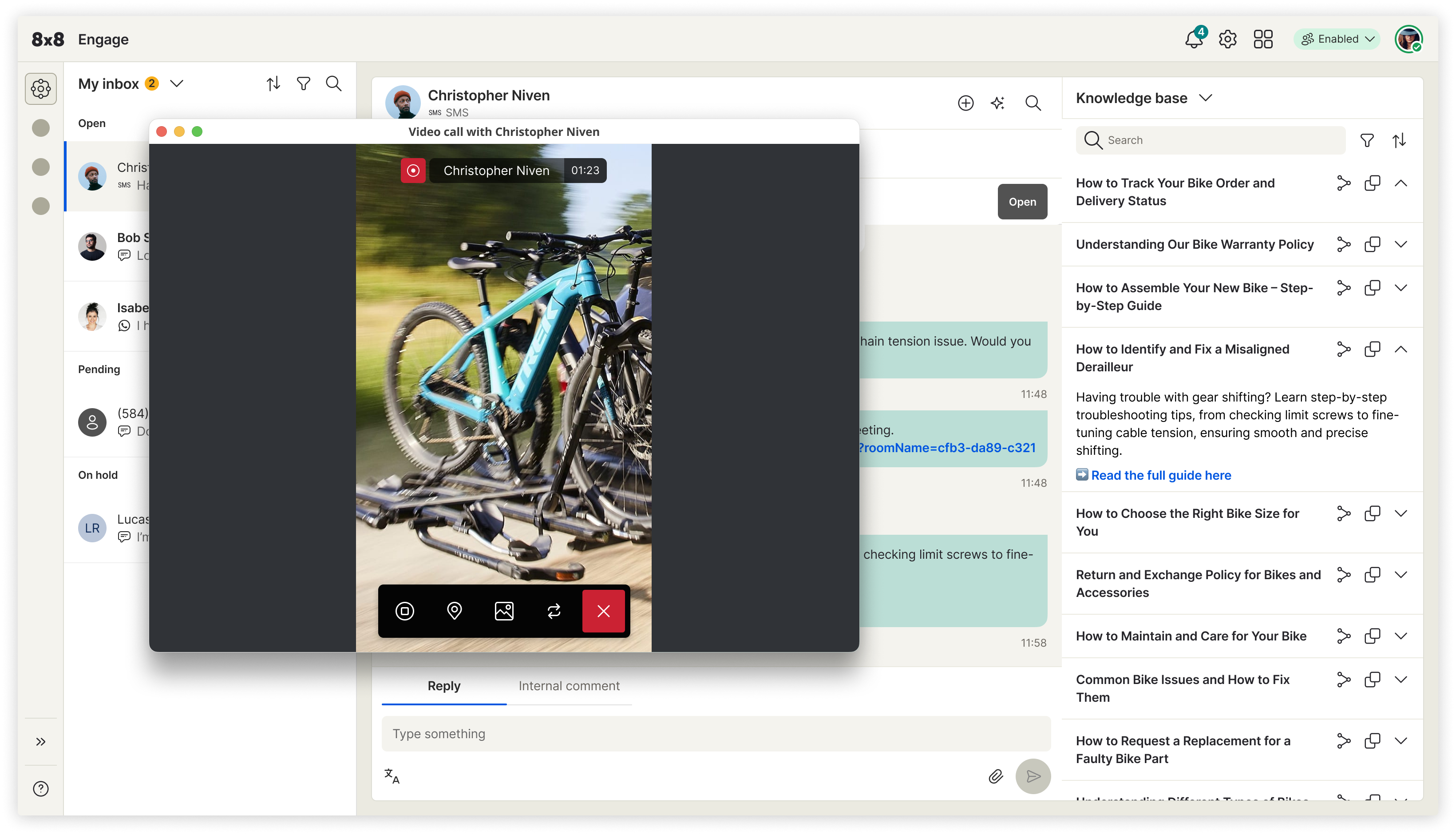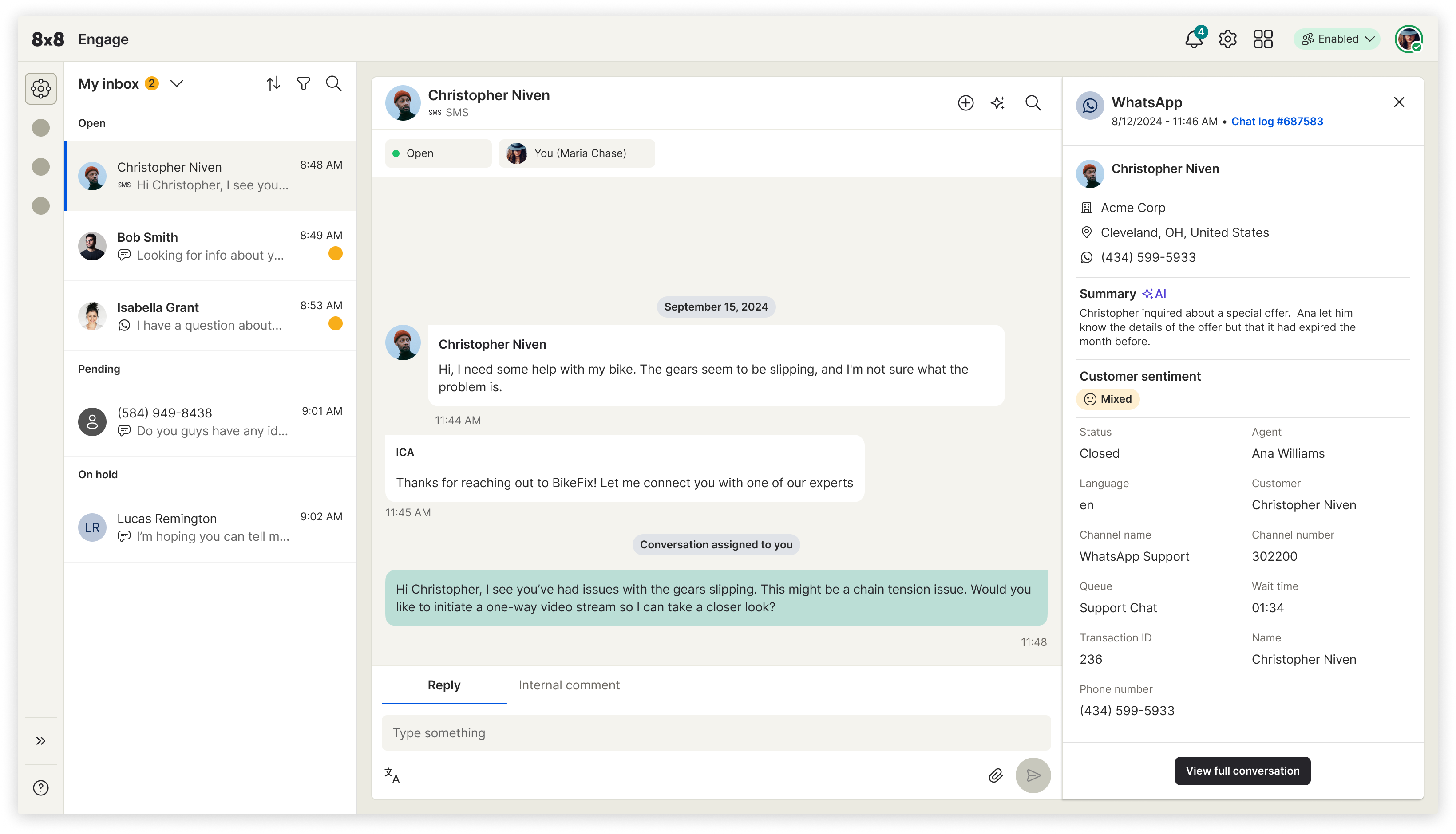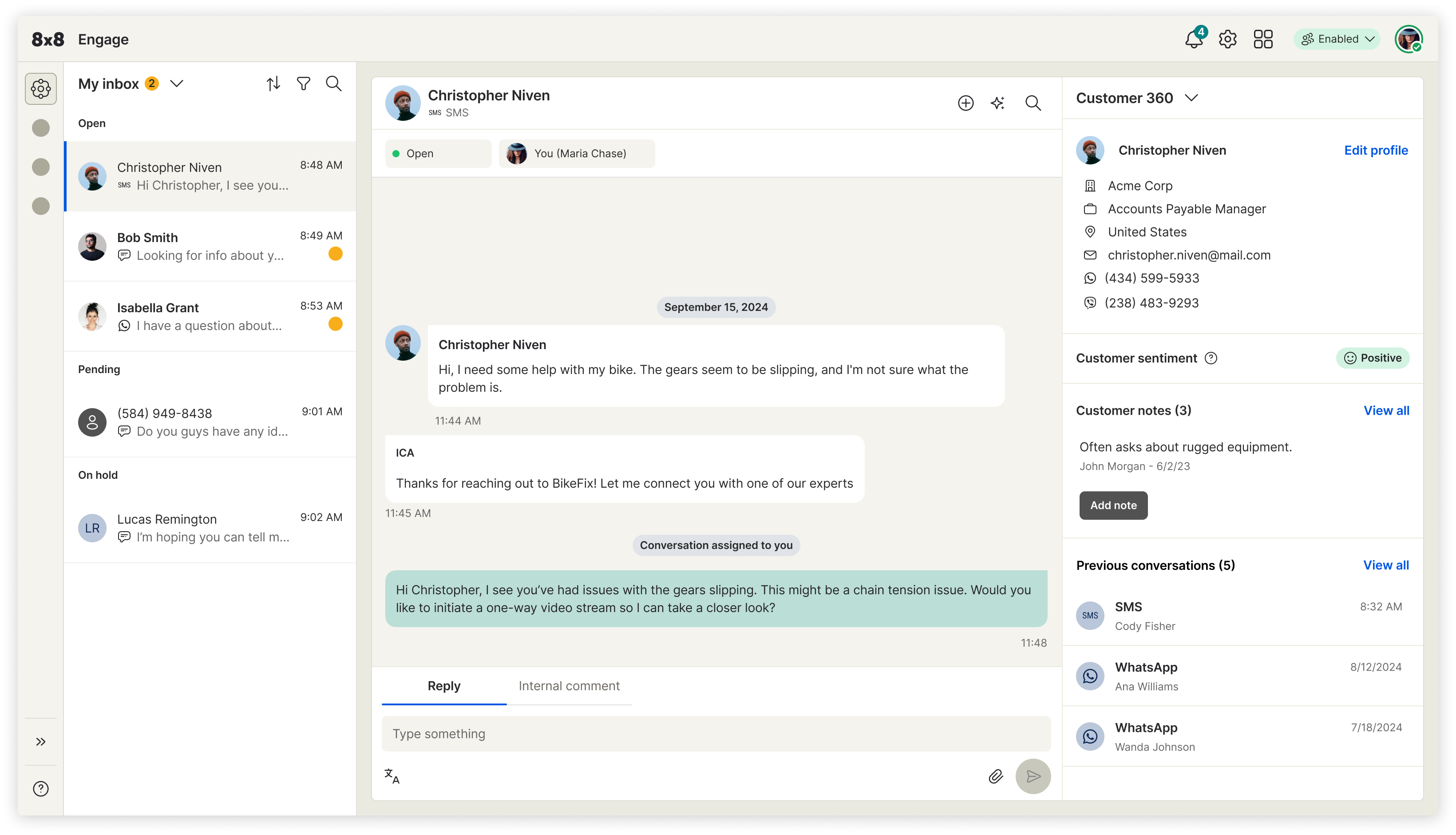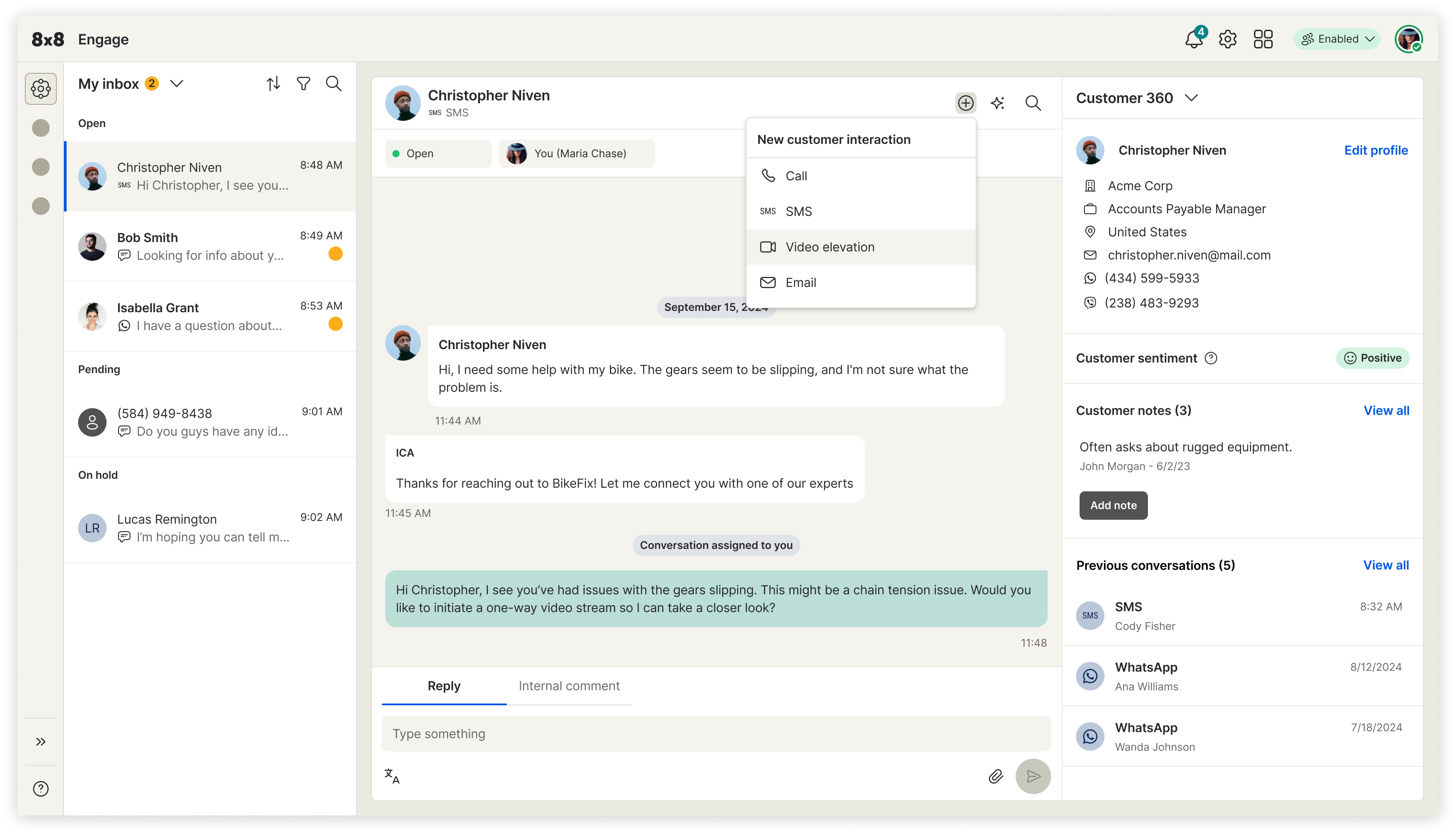 Engage was built to close this gap by unifying conversations, context, routing, and collaboration in a single intuitive workspace. Messages from channels like SMS, WhatsApp, and chat appear in a unified inbox with full customer history, journey details, prior interactions, and team notes. Smart routing ensures the right expert or frontline worker receives the request, while real-time context and shared threads prevent information loss. A one-tap video escalation feature enables faster remote troubleshooting, especially for field-based scenarios.