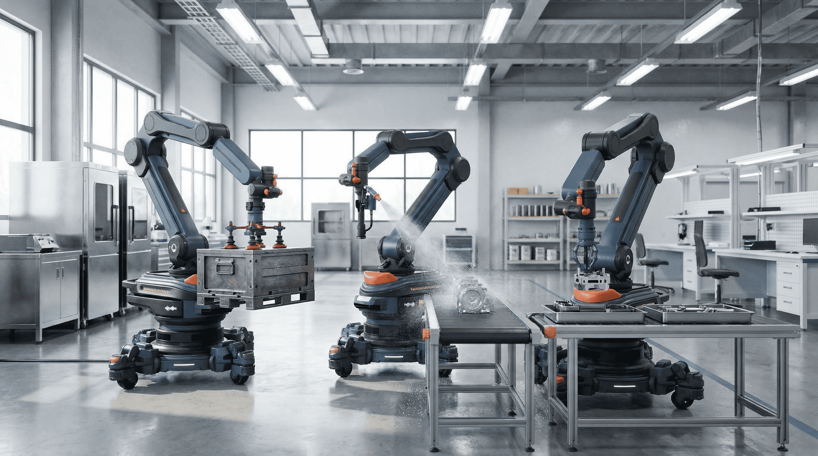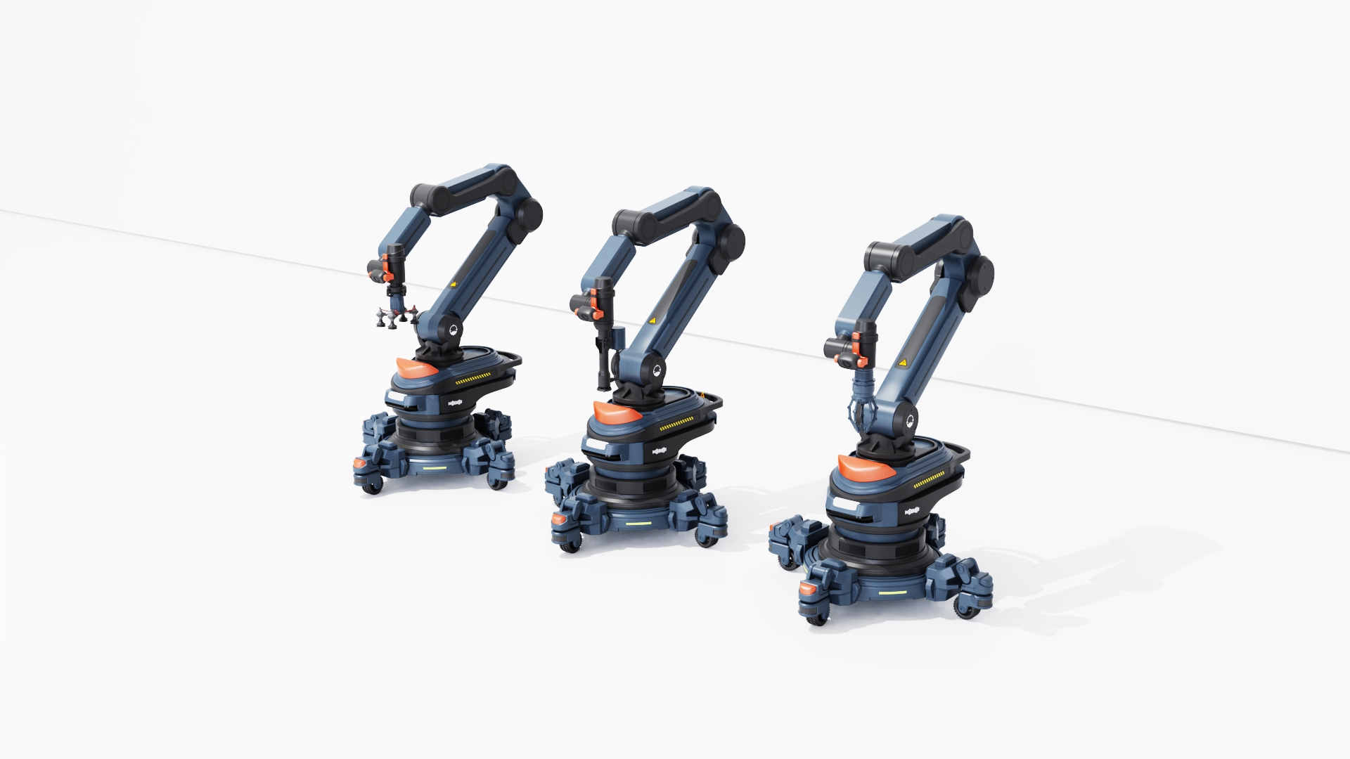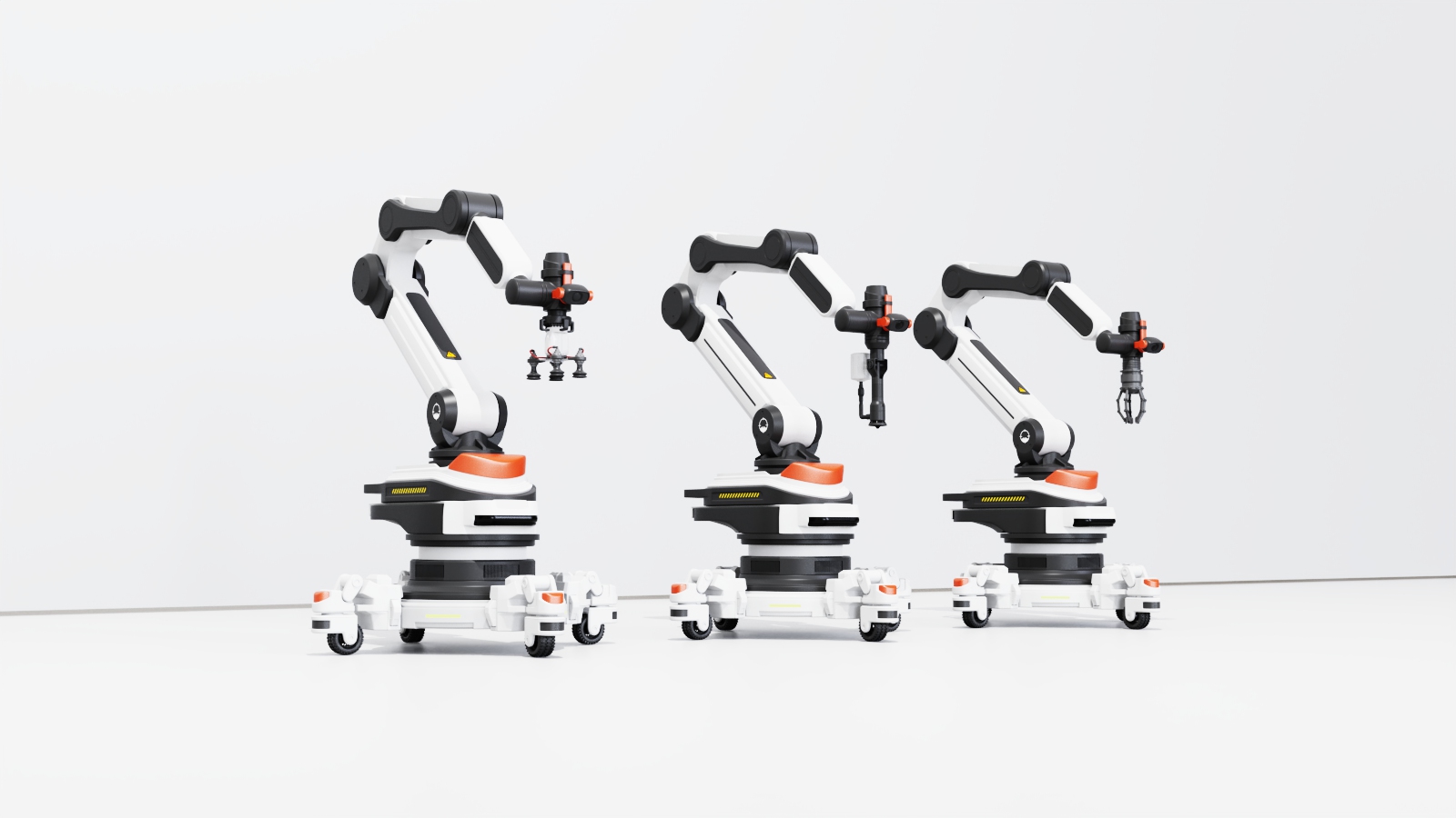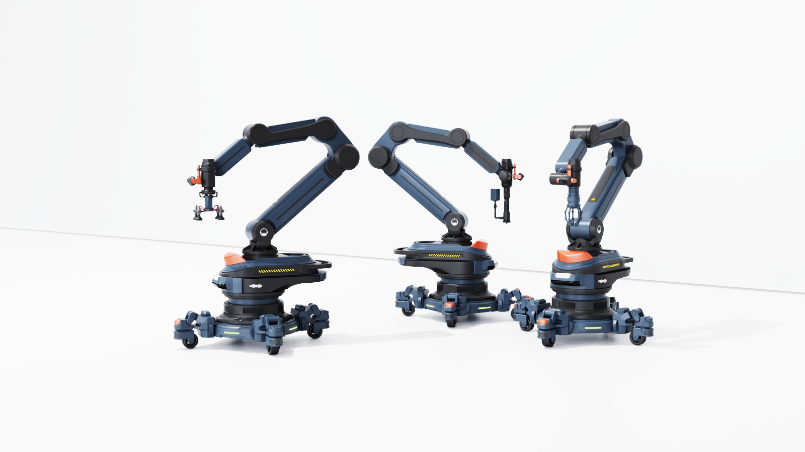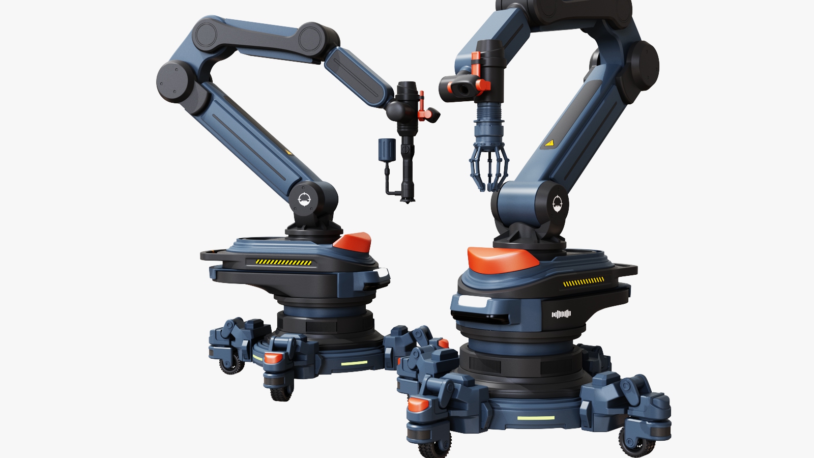 This robotic arm consists of a base and an articulated arm with a compact design for versatile operations. The base features 360° laser sensors to monitor the work area and provide timely warnings for safety. LED indicators display operating status, faults, and maintenance information. The end effector integrates a camera and voice module for visual recognition and voice control, with a modular design for quick functional swaps. Retractable wheels enable easy mobility while ensuring stability during operation. The design prioritizes safety, intelligence, and multifunctionality, delivering an efficient and reliable solution for modern work environments.
