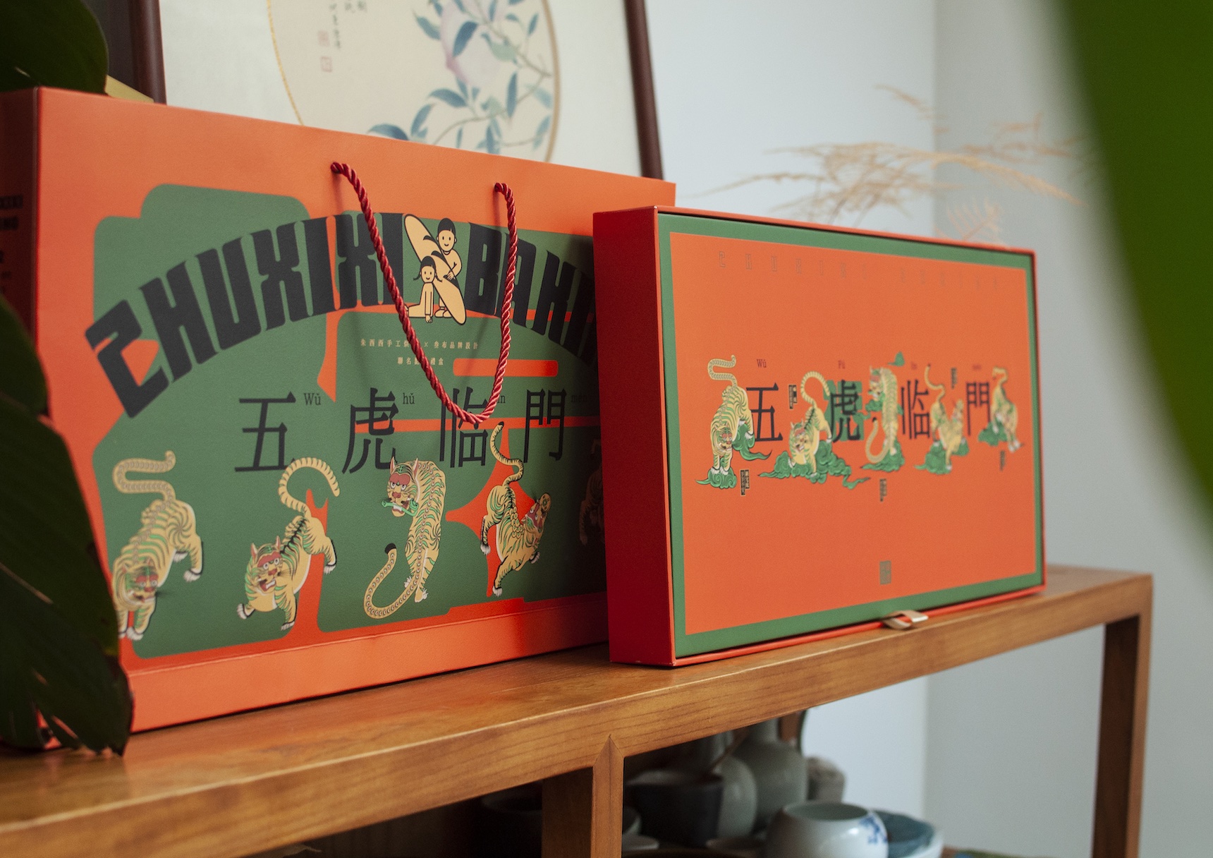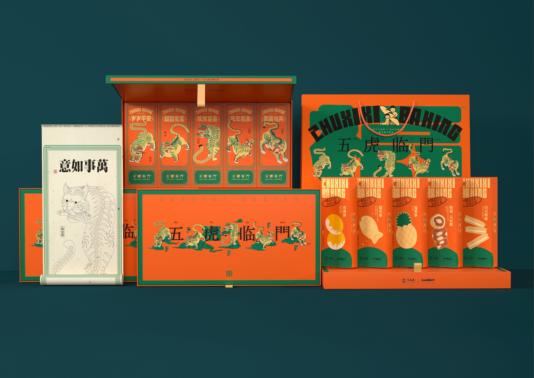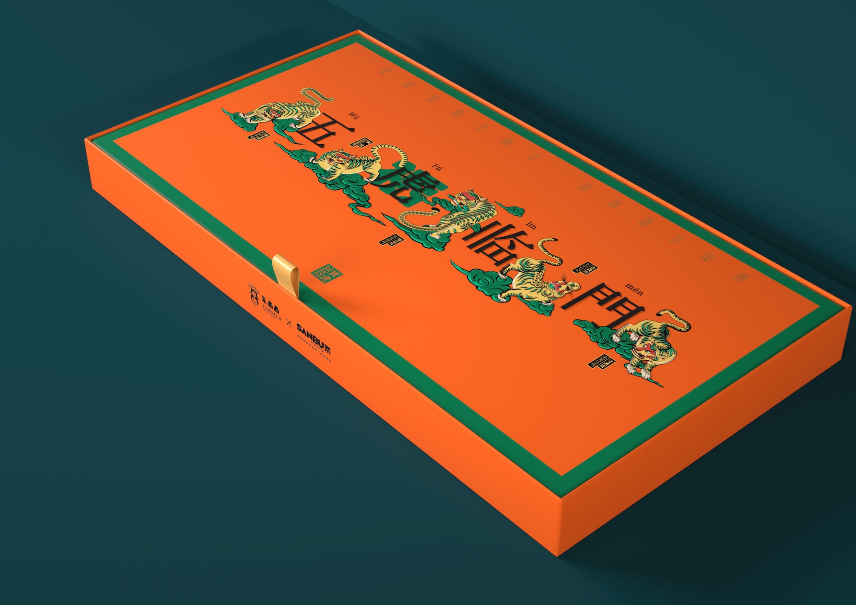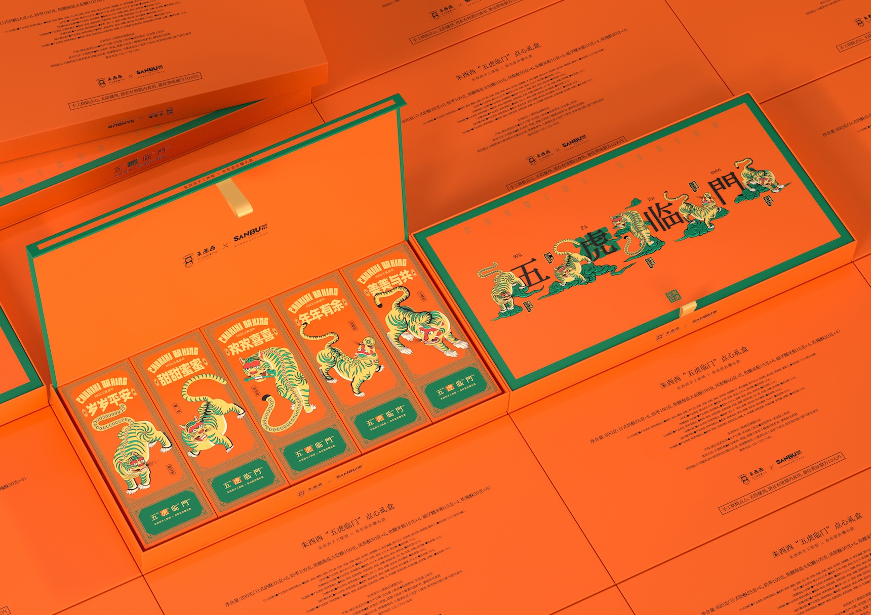 中国农历虎年2022即将到来,品牌方需要一款既能表达中国传统文化,又具有时尚气息的高端点心礼盒。设计师利用中文“虎”和“福”相近的读音,用五只老虎表达“五福临门”(中国成语,常用来表达祝福),老虎作为中国传统文化“十二生肖”中的一个,用具象的老虎表达“虎年”直接又吉祥,从而达到双倍的新年祝福。设计师把礼盒设计成横长条形,盖子内嵌入底盒里,如同一个画框一般,让这个盒子可以作为装饰画使用,让包装有二次利用的机会,减少浪费,同时在盒子里有一张线稿的老虎图,人们可以与自己的家人、朋友一起为老虎涂色,增强人物间的互动,达到情感互动的效果,涂好色的图可作为挂画永久保留。同时这款礼盒中的产品采用手工烘焙制作而成,为保证出品质量,限量500盒供应,需要预定才能购买,更强调礼盒的珍贵,在中国新年到来之际,也寓意了亲情、友情的珍贵。