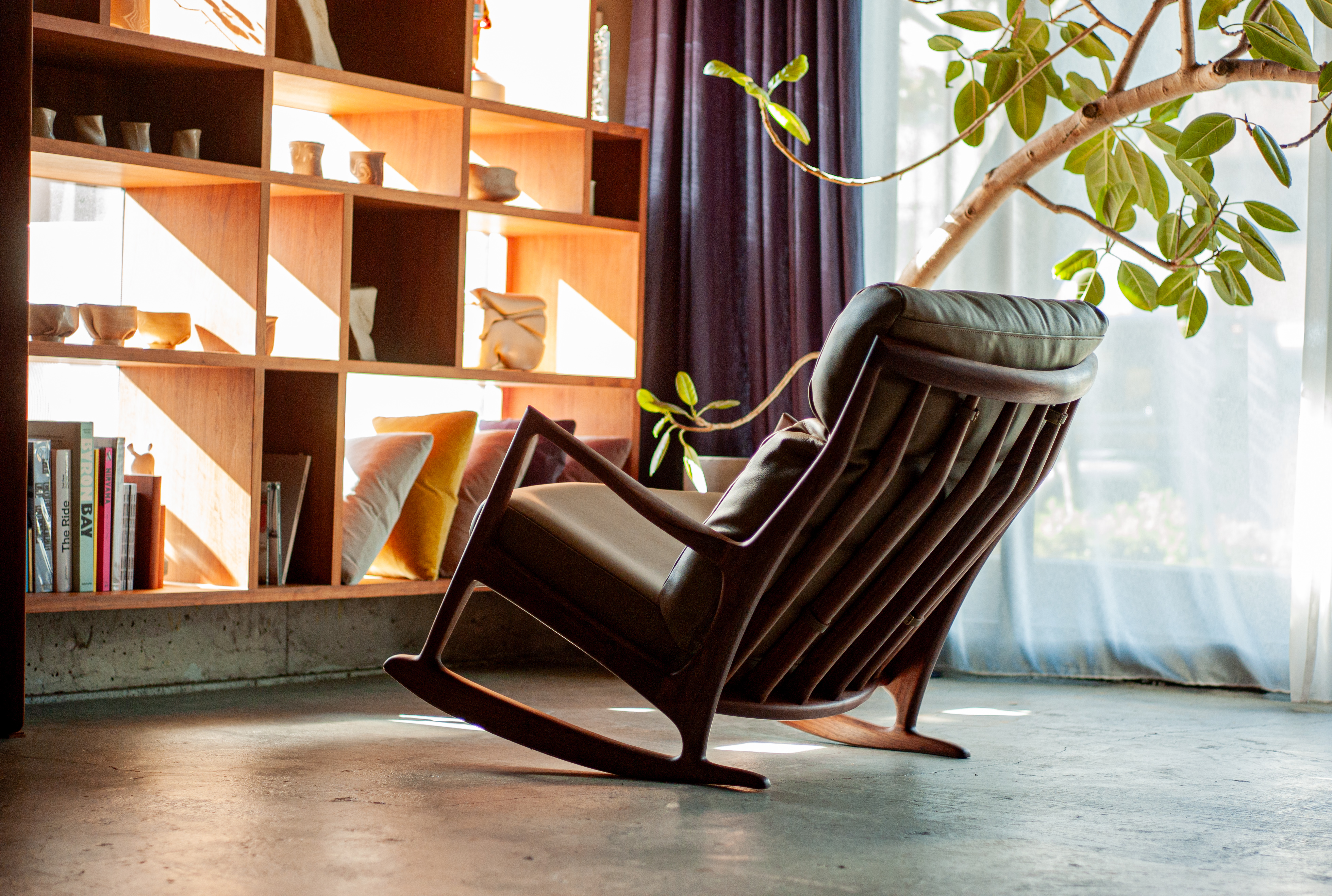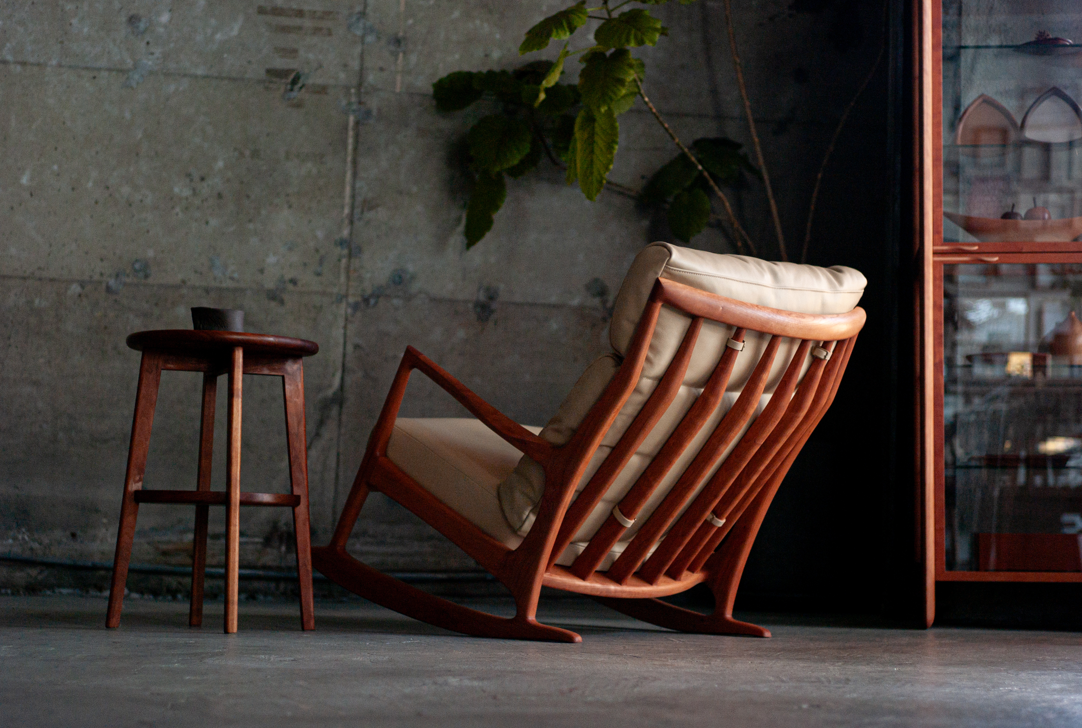 This rocking sofa guarantees the highest quality and an unparalleled level of comfort. After trying all kinds of angles and curves for the rockers, adjusting center of gravity and balance, we decided to add a stopper so that it sways and tilts just right. Also, this stopper secures the sofa when no one is sitting down. The six signature spokes are interpreted from fingers and hands gently holding something precious, and are designed to support head, shoulders, back and waist in a vertical line. Spokes, arms and the headrest are all carved individually from wood material with the traditional Japanese tools by the hands of craftsman. Also, we were very particular about leather and fabric for the cushions. For the back cushion, we used 100% high density feather for pliable support, and seats are made in two layers of urethan, preventing back pain from sinking in.