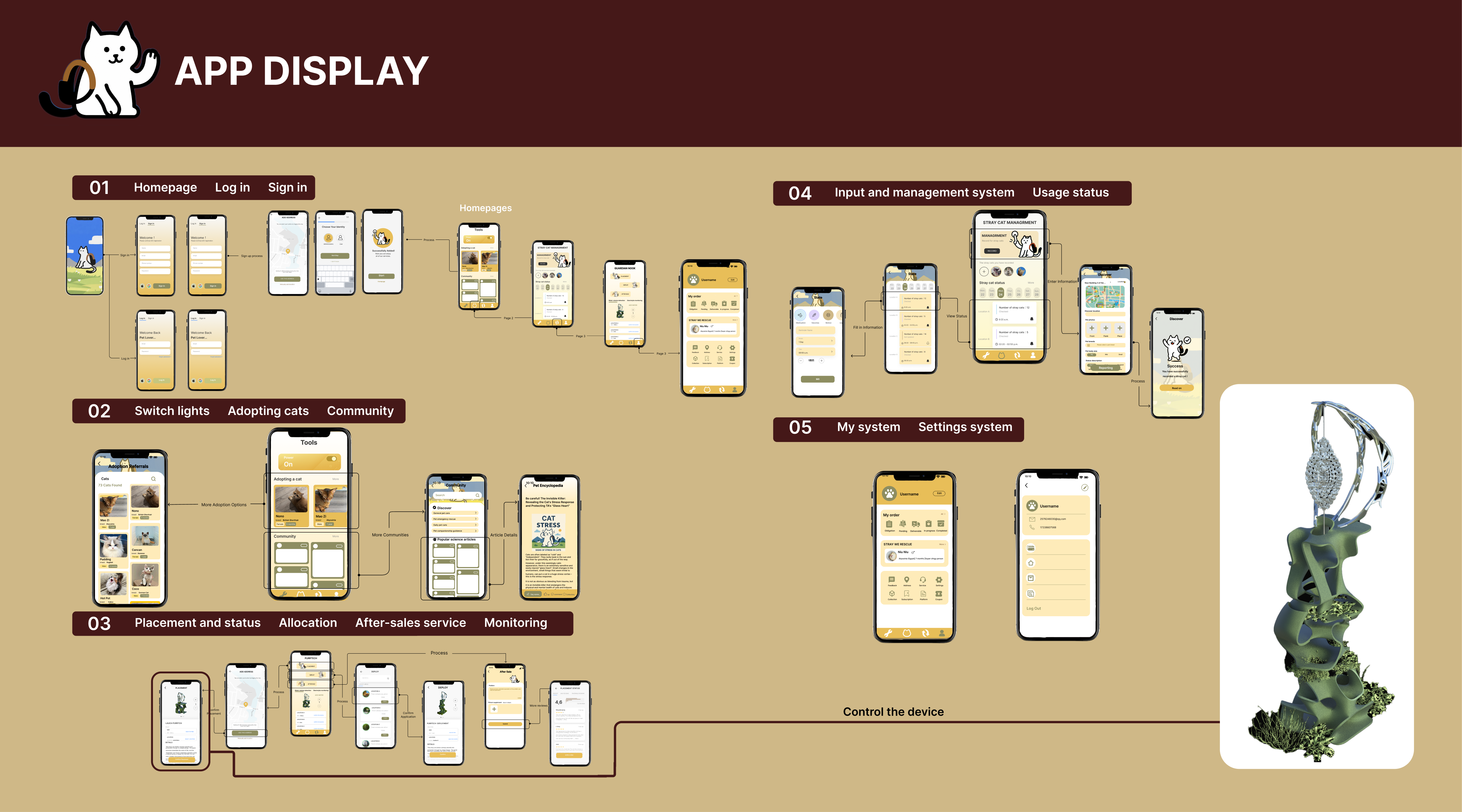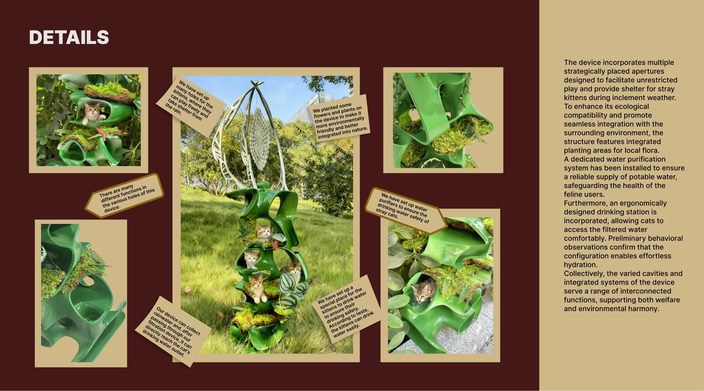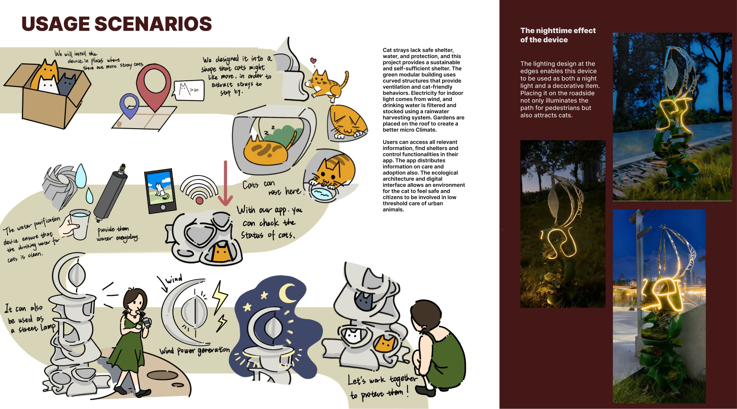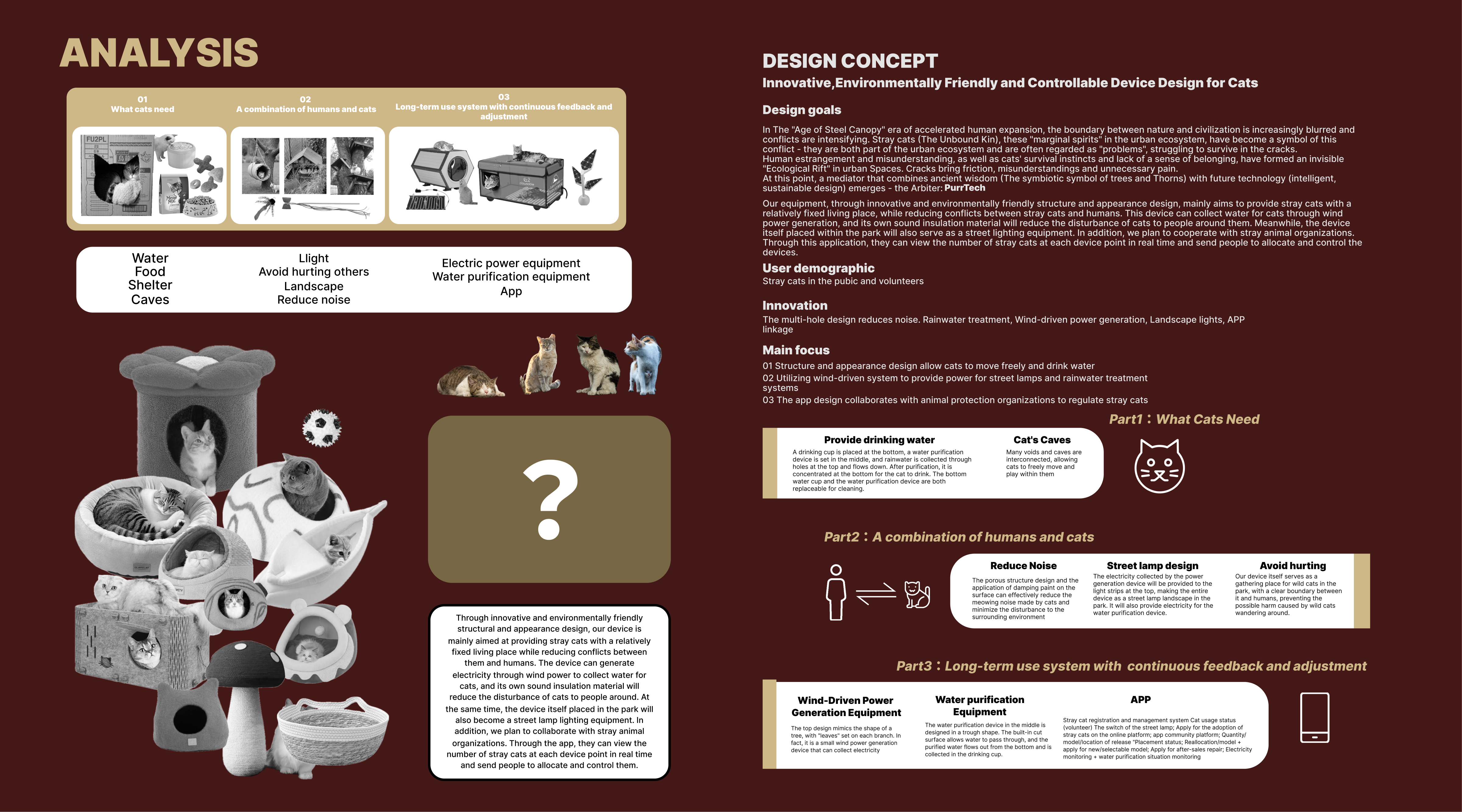 Straying cats in the city usually need to deal with problems of survival: from the absence of a secure habitat, to the lack of water and insufficient protection at nighttime. For the problem, a project of sustainable symbiosis is built and developed. It was born a green stray cat shelter, featuring a three-fold self-sufficientity in habitat, energy and ecological circle. It is furnished with a dedicated APP in order to create a caregiver system that supports the care of stray cats in various ways and reduces the threshold of urban pedestrians to engage in rescue activities. The main part of the shelter is made of environmental friendly composite construction materials. The modular structure with a variety of organic curves not only conforms to the behavior of stray cats in an environment where they love to crawl, curl up and lay down, but also gains good ventilation and shading through the hollowed out and curved design. The energy device is powered by the metal ring-shaped wind energy component above, using wind power as a source and providing electricity to the light strips that can use flexible placement on the inner side of the shelter. rainwater is pumped into the top of the water storage area. The rainwater is first filtered to clear the polluted water and then flows down the roof of the shelter through the low-level outlet where stray cats go to take a drink, realizing the recycling of rainwater resources. The device is high above with local green flowers such as moss and ferns, which not only enhances the microclimate, but also filters impurities. The dedicated APP can link people and machine interaction and care: people can use the APP to seek out nearby shelters and remotely turn the status of the device on and off. At the same time, the APP is also equipped with an internal science popularization section for feeding and caring for stray cat health. It minimizes interactive errors. An adoption information board has been set up to make the shelter go from a barebones survival to a comprehensive care vehicle with a combination of rescue, science/popularization and adoption. This project is not least an ecological embodiment of the threefold self-sufficiency of hardware and the digital linkage of software, which are not only used to create a sturdy environment for stray cats but also to open the door to the activity of urban pedestrians in care activities with low thresholds, realizing the soft coexistence of humans, animals and the urban environment.